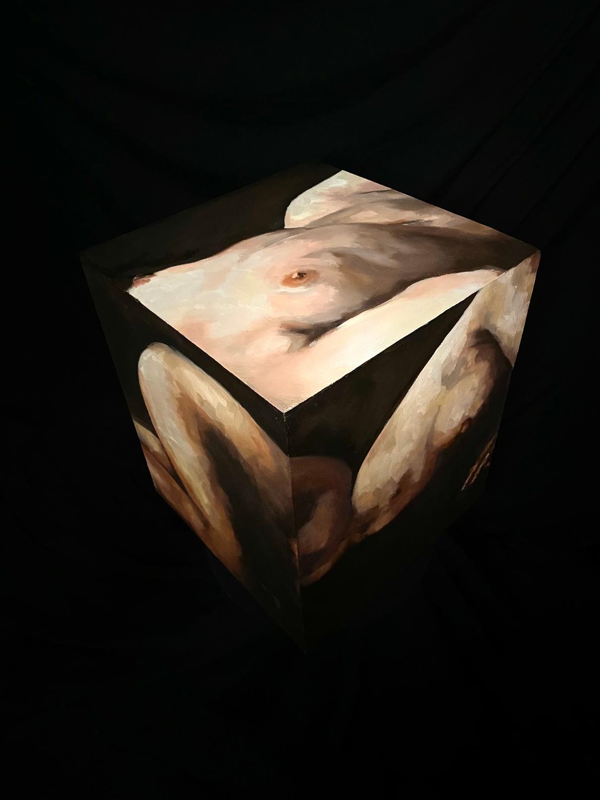 Rebecca Antoniou's I'm Still Here Black Cube II is one of the mostquietlystartlingworksintheexhibition.Awoodencube— each face painted in oil with fragments of a nude figure, skin warmly lit against deep shadow — sits in space so that no single viewing angle gives you the whole picture. You have to move around it, piece the body together yourself, and in doing so become part of the work. It is a painting about presence andaboutbeingseen,andthetitle—I'mstillhere—givesitan urgency and tenderness that stays with you long after you've walkedaway.