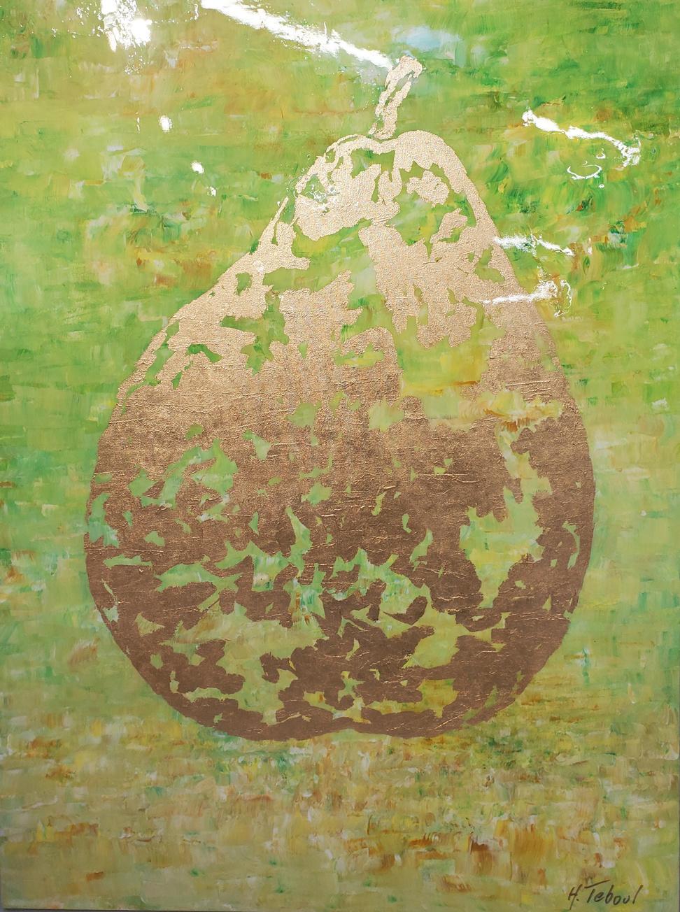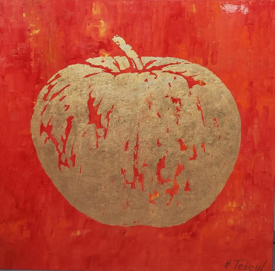 HervéTeboulbringshissignaturetouchtothestilllifewithtwo large, luminous works that transform the humblest of subjects — a pear, an apple — into objects of genuine splendour. Rondeurs Dorées sets a golden pear against a lush, loosely painted green ground, the fruit rendered in gold leaf that catches and holds the light with extraordinary warmth. Rouge Délice counters with an apple blazing in gold against a field of deep, vibrant red — bold, joyful, and completely alive. Teboul takes the centuries-old tradition of fruit painting and gives it backtousentirelyrenewed,gleamingandirresistible.