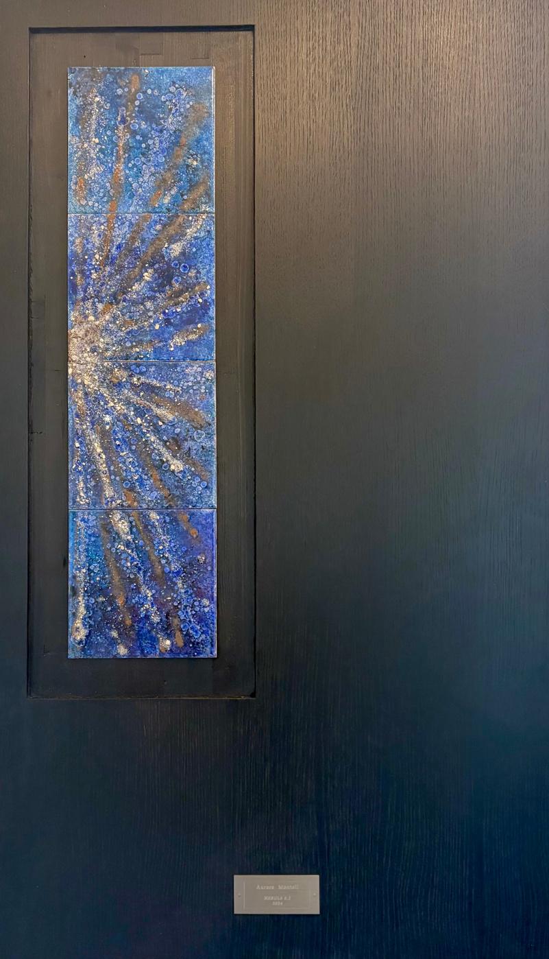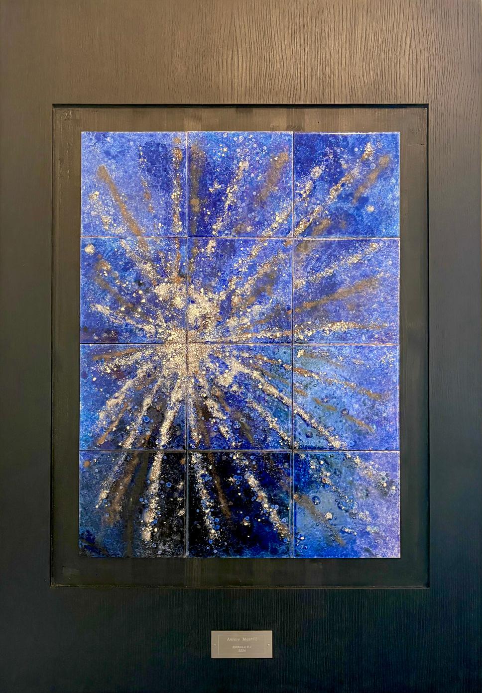 Aurore Monteil's two Nebula works are among the most materially extraordinary in the exhibition. Each is built on glazed ceramic tiles — painted with oxide, rutile, mica, glass frit, and crushed ceramics — and set within an oak frame finished in Napoleon III black varnish, the whole thing sealed with an engraved metal plaque. The result is a surface that seems to generate its own light: deep cobalt and violet fields from which gold and silver rays burst outward like a star exploding. Nebula 0.1 spreads across nine tiles in a glorious square,whileNebula0.2elongatesthesameenergyintoatall, narrowcolumn—twoversionsofthesamemagnificentcosmic event,eachentirelyitself.