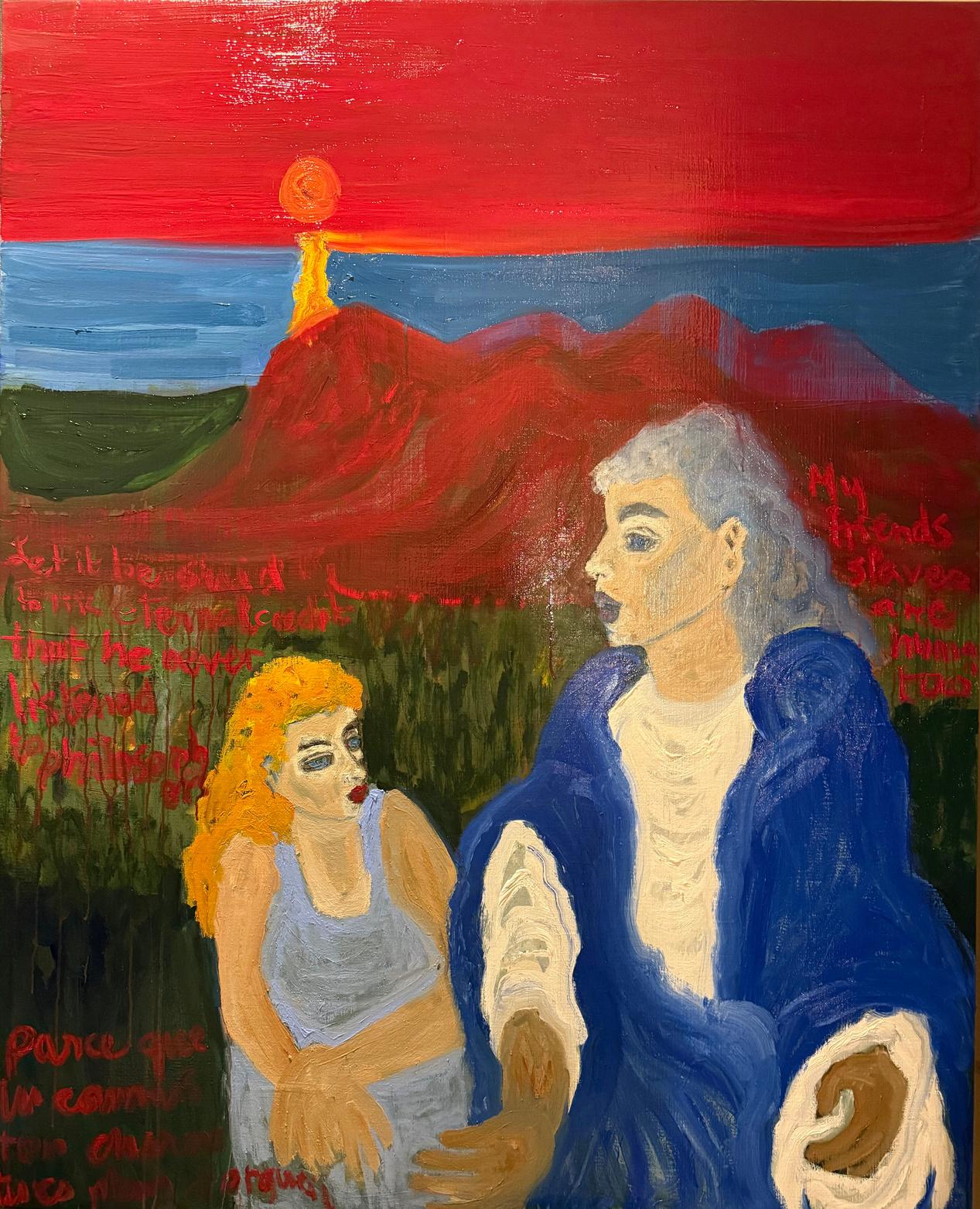 Dina El-Sioufi's The Never-Ending Satyricon is a painting that burns. A volcanic landscape blazes crimson and red behind two figures rendered with raw, urgent brushwork, while fragments of handwritten text — in English, in French — drift across the surface like half-remembered words. El-Sioufi paints with the directness of someone who has something urgent to say, and the scale and colour of the work — all that red, that heat, that sky — gives it a mythic, almost operatic quality. This is painting as testimony, as drama, as a refusal to bequiet.