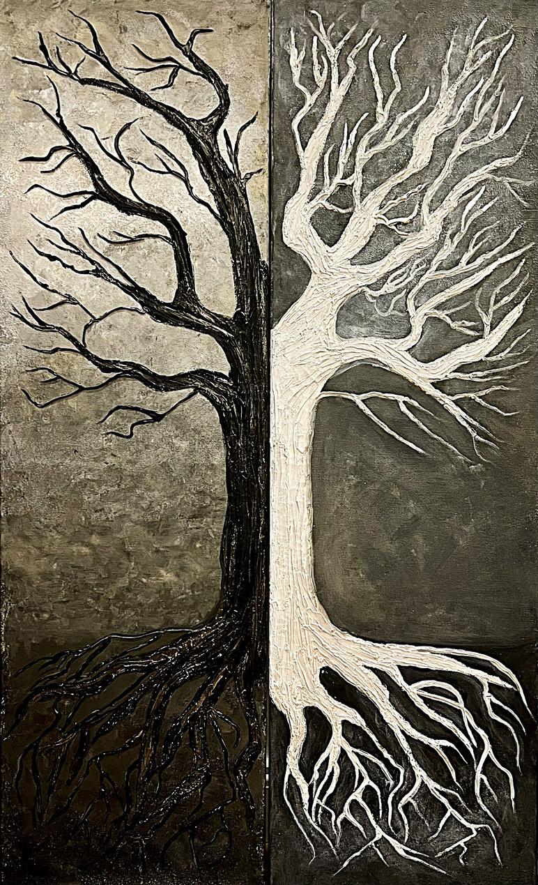 NatalyaRadünz'sExodusisadiptychofstrikinggraphicpower. Twotrees—onedarkagainstalightground,onewhiteagainst dark — grow from the same root system across the divide between the panels, their branches reaching in opposite directions, their forms built up in relief so that the surface has a real physical presence. The image is at once simple and deeplyresonant:separationandconnection,shadowandlight, the same life expressed in two entirely different ways. Radünz makesaworkthatisvisuallyboldandemotionallyintelligentin equalmeasure.
