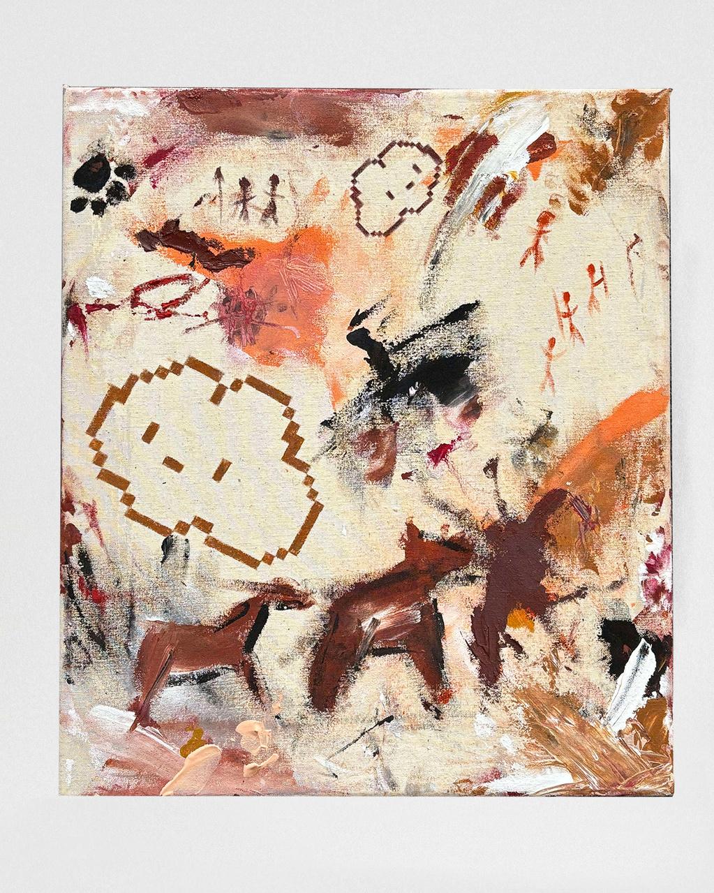 Chiya Clika's Cave 001 is a painting that collapses time in the most wonderful way. Against a warm, pale ground, primitive figures, animals, and pixelated emoji-like forms sit alongside one another as naturally as if they had always belonged together — cave painting and digital culture meeting on the same wall, separated by thousands of years and no distance at all. Clika layers oil, oil stick, acrylic, and polymer to build a surface that feels genuinely ancient and genuinely now, and theresultisaworkthatmakesyoulaughandmakesyouthink in equal measure. Humanity has always drawn on walls. Some thingsneverchange.