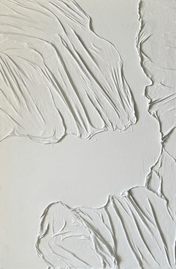 Karin Sonesson's Waves is a work that makes you want to reach out and touch it. Modelling compound has been applied to canvas in great sweeping gestures — broad, curved ridges that catch the light and cast soft shadows across the surface, creating a texture that is simultaneously monumental and delicate. There is no colour here, only form and light and the memory of movement — and it is completely, quietly extraordinary. Sonesson has made a painting about the sea without showing the sea at all, and in doing so has captured somethingessentialaboutit:itsrhythm,itsscale,itsirresistible pull.