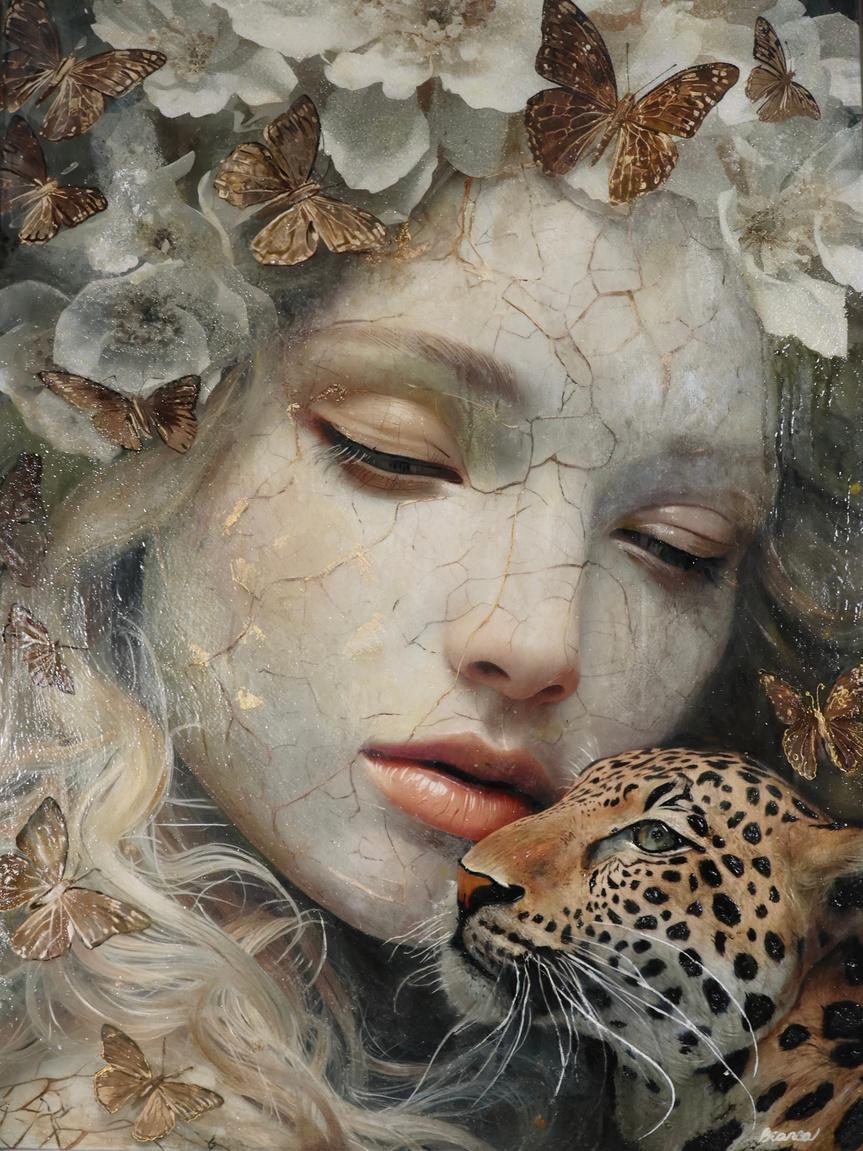 Accompanied by the watchful presence of the leopard, a symbol of latent strength and silent protection, the composition evokes an unspoken alliance between softness and vigilance. Butterflies drift across the scene as fleeting markers of transience, reinforcing the ephemeral nature of emotional states. Drawing on a contemplative visual language informed by both Western and Eastern sensibilities, Pirlog constructs a space where vulnerability is not opposed to power,butbecomesitsquietcounterpart.