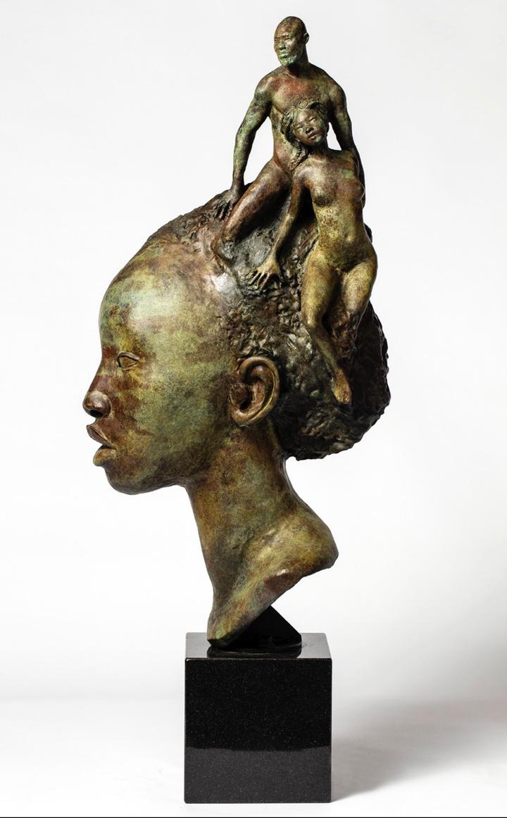 Austen Brantley's Mountain is a sculpture of extraordinary conceptual and emotional depth. A monumental bronze head — serene in profile, its surface rich with green patina — becomes the foundation for something even larger: two small figures perched atop it, a man and a woman, intimate and exposed against the air. The idea is simple and profound: that inside every person's mind lives a whole world, populated by those they love, those they carry, those they cannot put down. Brantley executes this vision with great technical skill and greathumanity,andtheresultisaworkthatstayswithyoulike athoughtyoucan'tquiteshake.