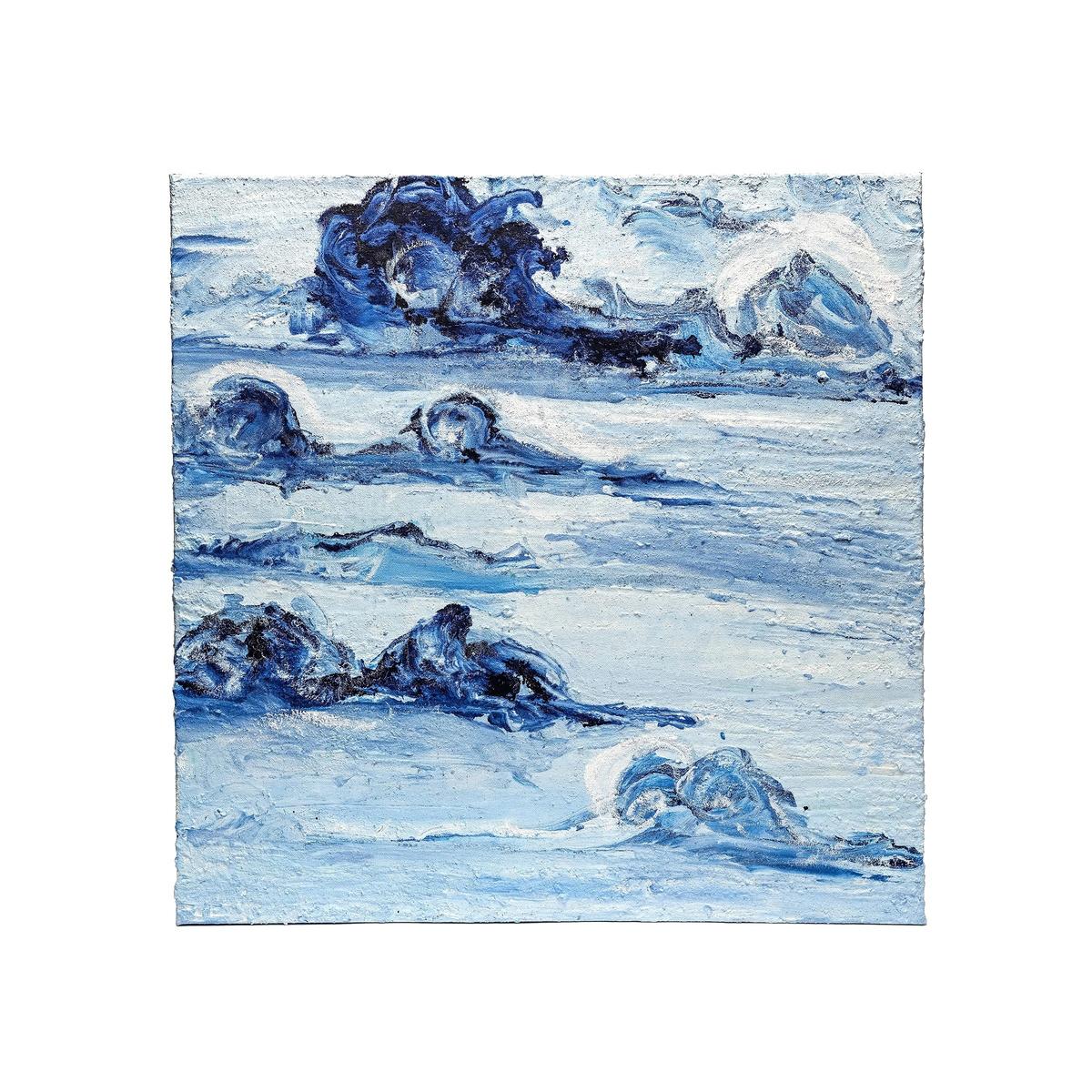 Justine Giordano's Crashing Waves of Thought is a painting that gets the sea exactly right — not its appearance, but its feeling. Layers of impastoed blue and white build wave upon waveacrossthecanvas,eachonethickandphysical,thepaint applied with the same kind of relentless momentum as the water it describes. The palette is cool and clean, all deep navy andpaleskyblueandwhitefoam,andthewholesurfacehums with movement. This is a painting about the way thoughts arrive — in surges, one after another, unstoppable and strangelybeautiful.