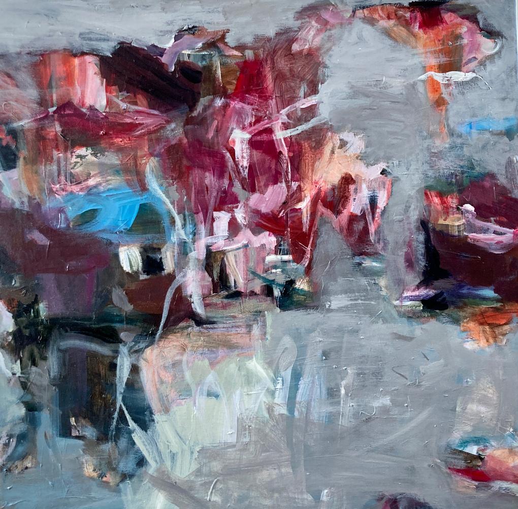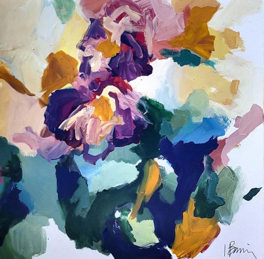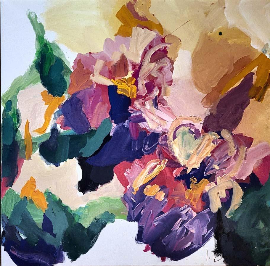 Isabel Breininger's two paintings announce an artist completely at home with colour and gesture. Working in what appears to be oil, she builds her floral compositions through bold, confident strokes — petals and leaves suggested rather than described, the paint applied with a directness and physicality that makes each mark count. The palette is glorious: deep navy and forest green anchoring explosions of pink, mauve, mustard, and warm white, the whole thing hovering beautifully between abstraction and recognition. You know these are flowers, but more than that you know how they feel — abundant, generous, alive with a kind of uncontainable energy.Breiningerpaintswithrealfreedom,andtheresultsare simplywonderfultobeinthepresenceof.