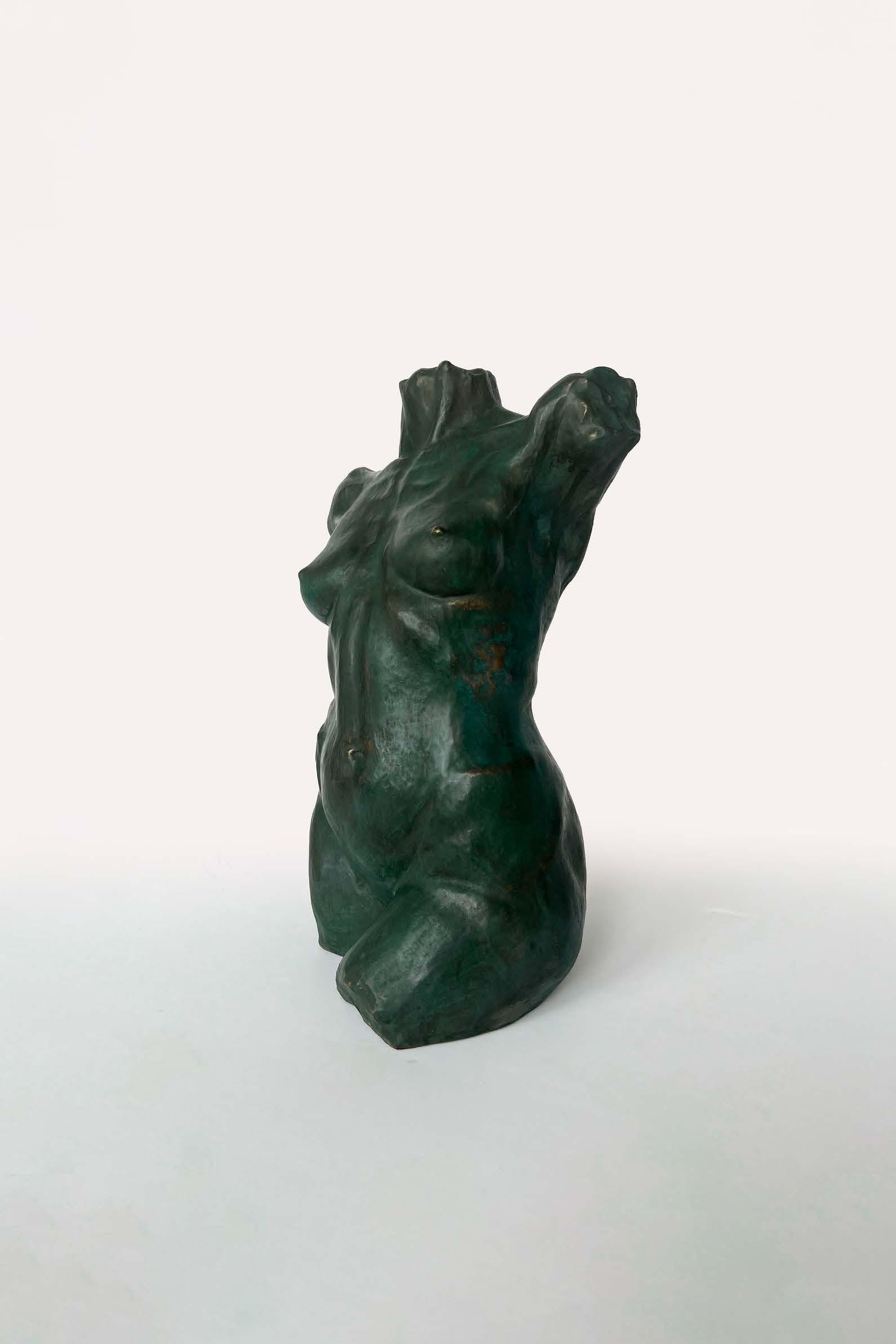 Isabel Arocena's Vega is a sculpture of raw, quietly thrilling power. A female torso — armless, headless, the body twisting upward as though reaching for something just out of reach — isrenderedinbronzeandresinwithasurfacethatisroughand alive, deep green-black and flecked with warmth. It is the kind of work that makes you want to walk around it, to see how the form changes with each angle, how the light catches the texture differently at every turn. Arocena has made something ancient-feeling and completely present at the same time — a body caught between earth and sky, full of restless, beautiful energy.