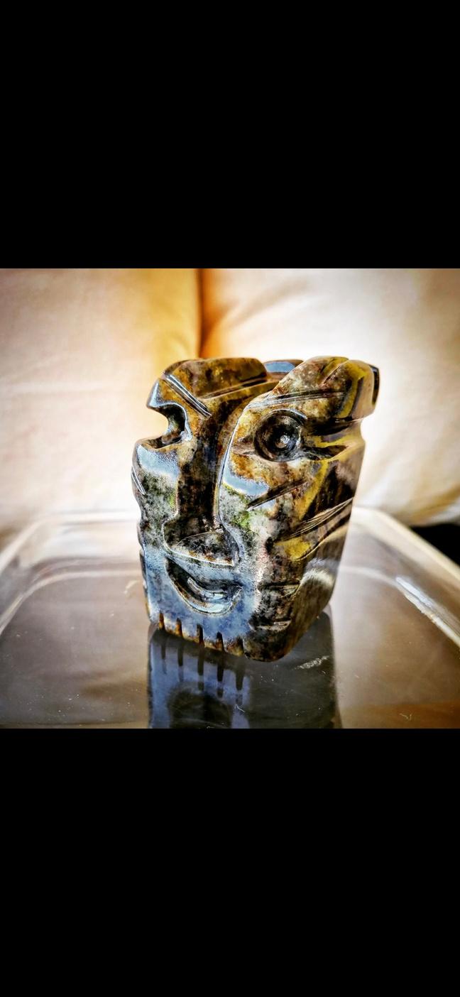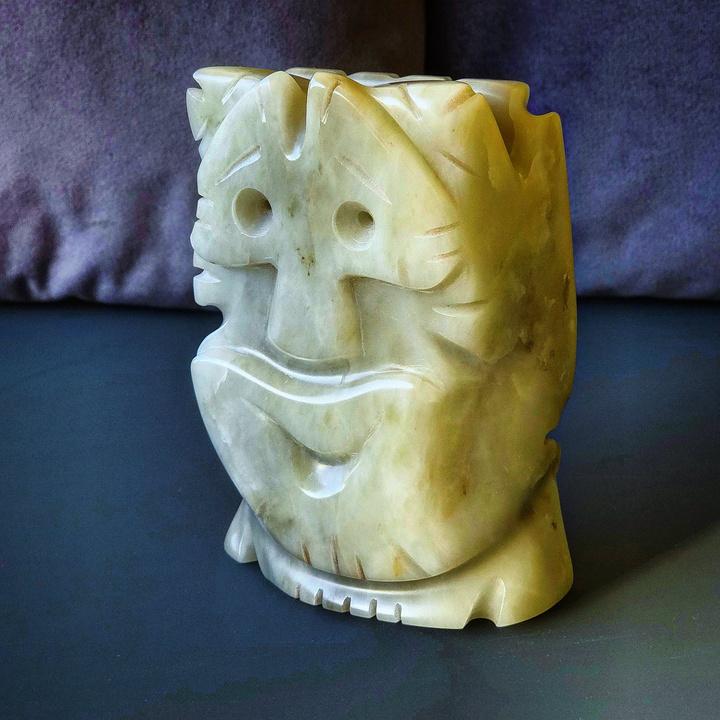 Alex of Artexinia's two soapstone sculptures are small in size but enormous in character. Both present expressive, mask-like faces carved with a directness and energy that feels at once ancient — recalling pre-Columbian or African sculptural traditions — and completely contemporary. The creamy pale stone of Twenty Twenty Sixex / Personality Coachex gives its grinning,wide-eyedfaceanalmostluminousquality,whilethe darker, mottled surface of Nonosexa lends its features a brooding intensity. Together they feel like two sides of a personality — one open and exuberant, one watchful and knowing—andbothareirresistible.