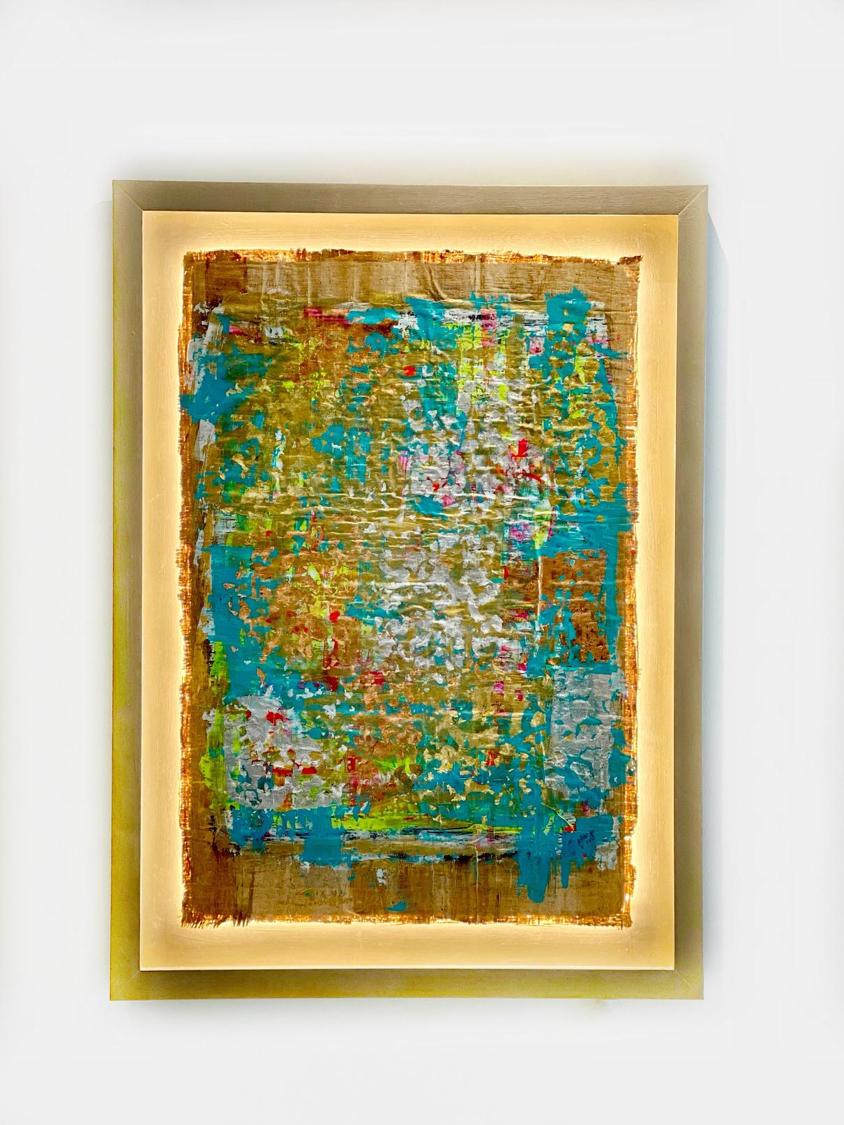 Rand Alkishtaini's Capriccio Wall Lighting transforms the wall itself into something luminous. Mixed media on papyrus paper —teal,gold,silver,andflashesofredandpink—issetwithina solid wood frame from which LED light glows warmly outward, so that the work seems to breathe, to radiate from within. The ancient material of the papyrus and the contemporary use of light create a tension that is wholly satisfying, the old and the new illuminating each other. This is a work that changes with the light around it — and that rewards living with as much as lookingat.
