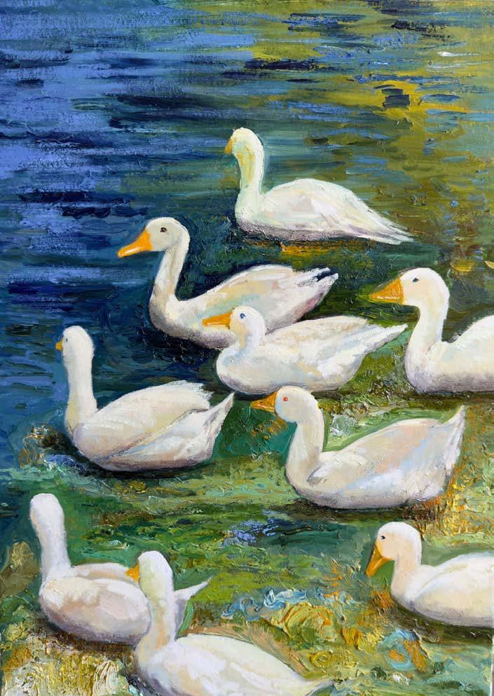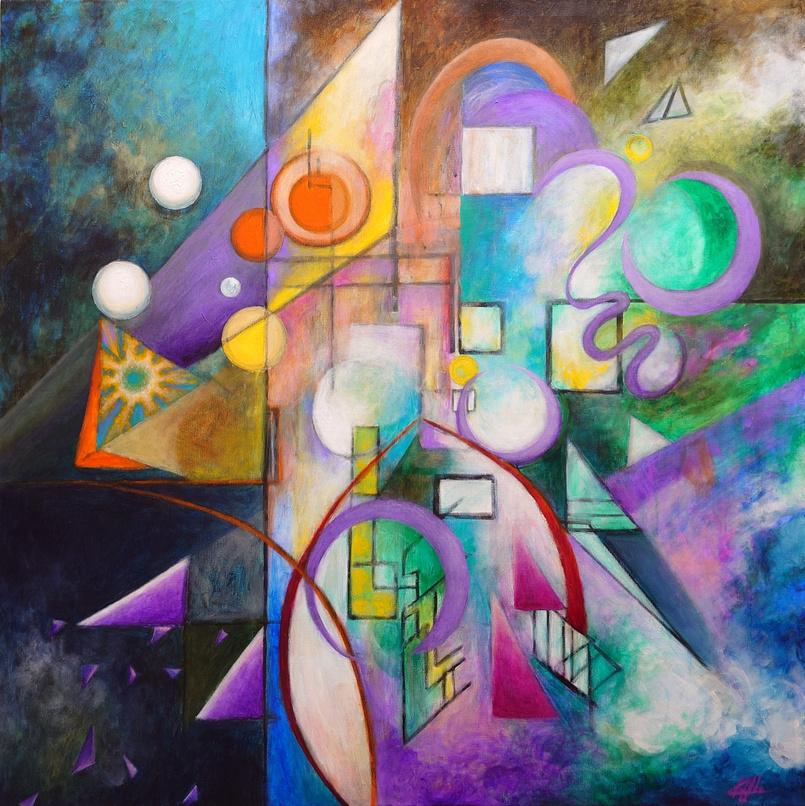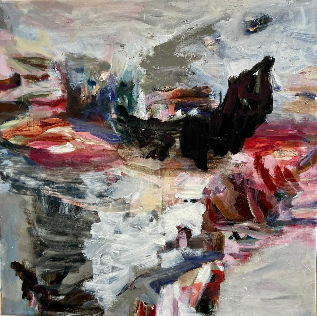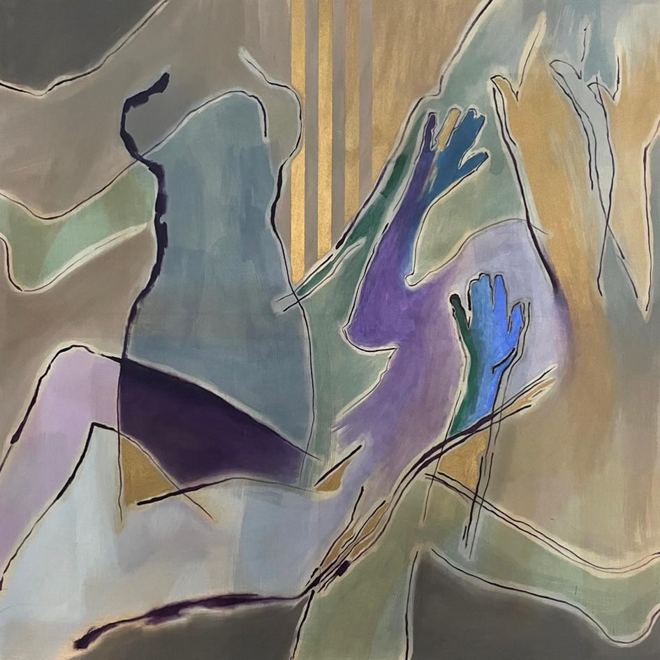 Paula Jaszczyk's painting carries its title like a truth acknowledged — something steeled for, not feared. Two abstracted figures in muted sage, lavender, and blue move against a warm golden ground, their forms fluid and open, handsreachingorgesturingtowardoneanotherwithaquality that is both tender and uncertain. Jaszczyk paints with real emotional intelligence, and the work has the feeling of a conversation held at a threshold — a moment of change, bravely faced. It is a painting that speaks quietly but lands deeply.