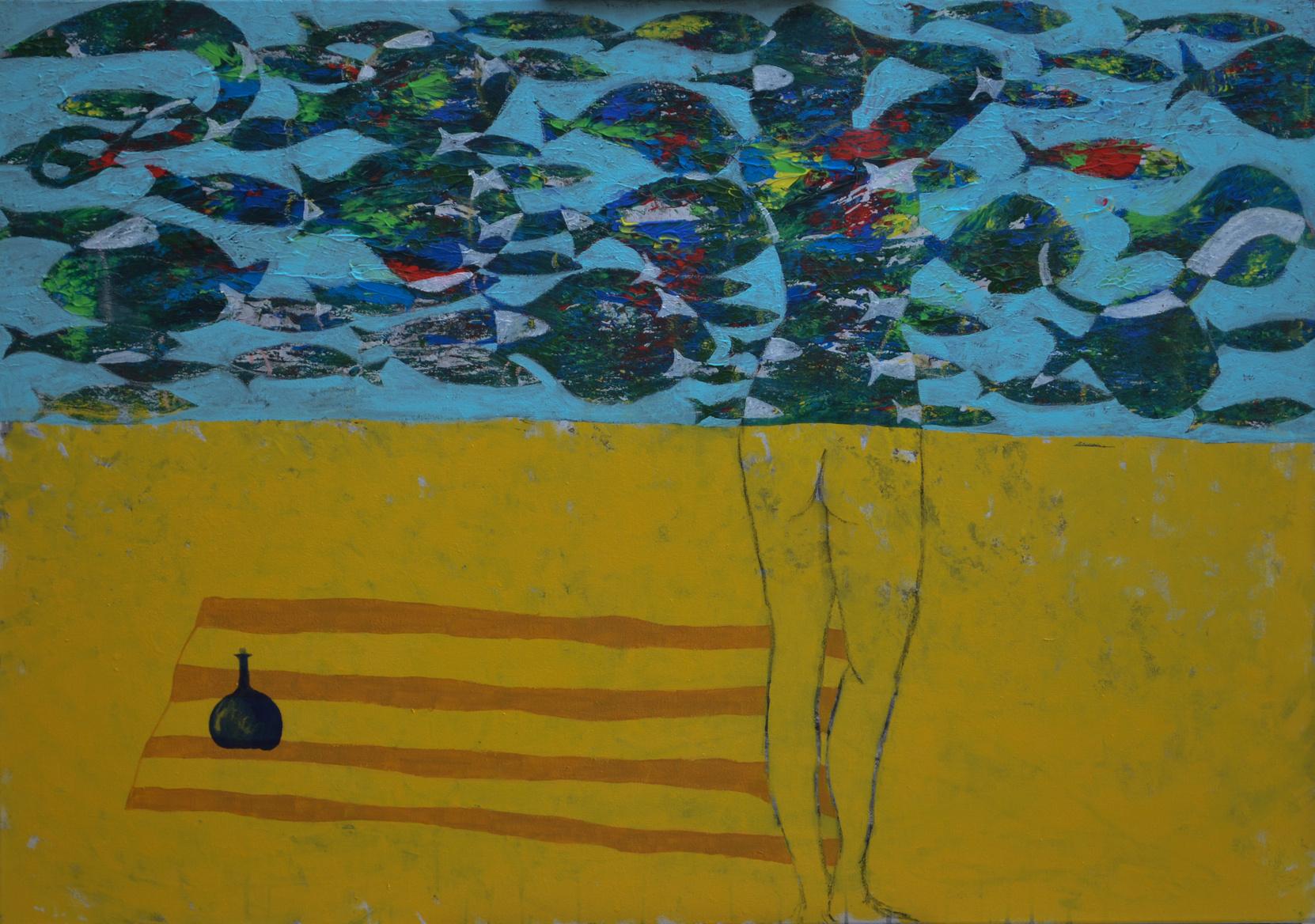 Przemyslaw Olczak's Memories is a painting of beautiful simplicity and surprising depth. A shoal of fish — painted in a wonderful variety of blues, greens, and flashes of red — swims through the upper half of the canvas above a warm golden shore, where a striped cloth and a dark bottle suggest a moment of rest, of summer, of time suspended. The division between the two worlds — the teeming, colourful underwater world above and the quiet, warm human space below — gives theworkapoeticqualitythatisentirelyitsown.Itisapainting aboutthewaymemorypoolsanddrifts,anditisquitelovely.