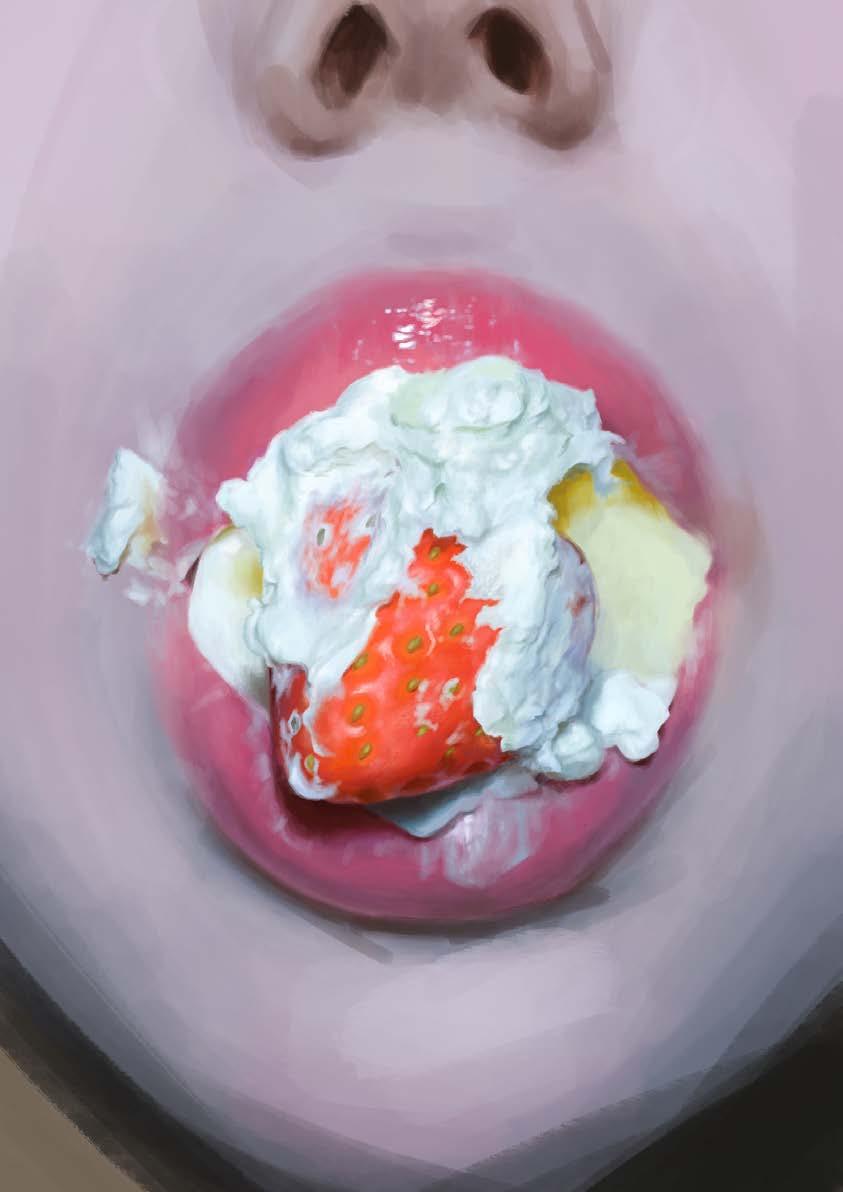 Yume's Want it All is bold, sensuous, and completely unapologetic. A mouth — lips parted, a strawberry and cream resting on the tongue — fills the frame in close-up, rendered digitallywiththelush,almostediblequalityofapainting.There is something playful and something provocative about it in equal measure: desire made literal, appetite made beautiful. Yume works with real technical skill and a sharp sense of humour, and the result is an image that is impossible to walk pastwithoutstopping—whichis,ofcourse,exactlythepoint.