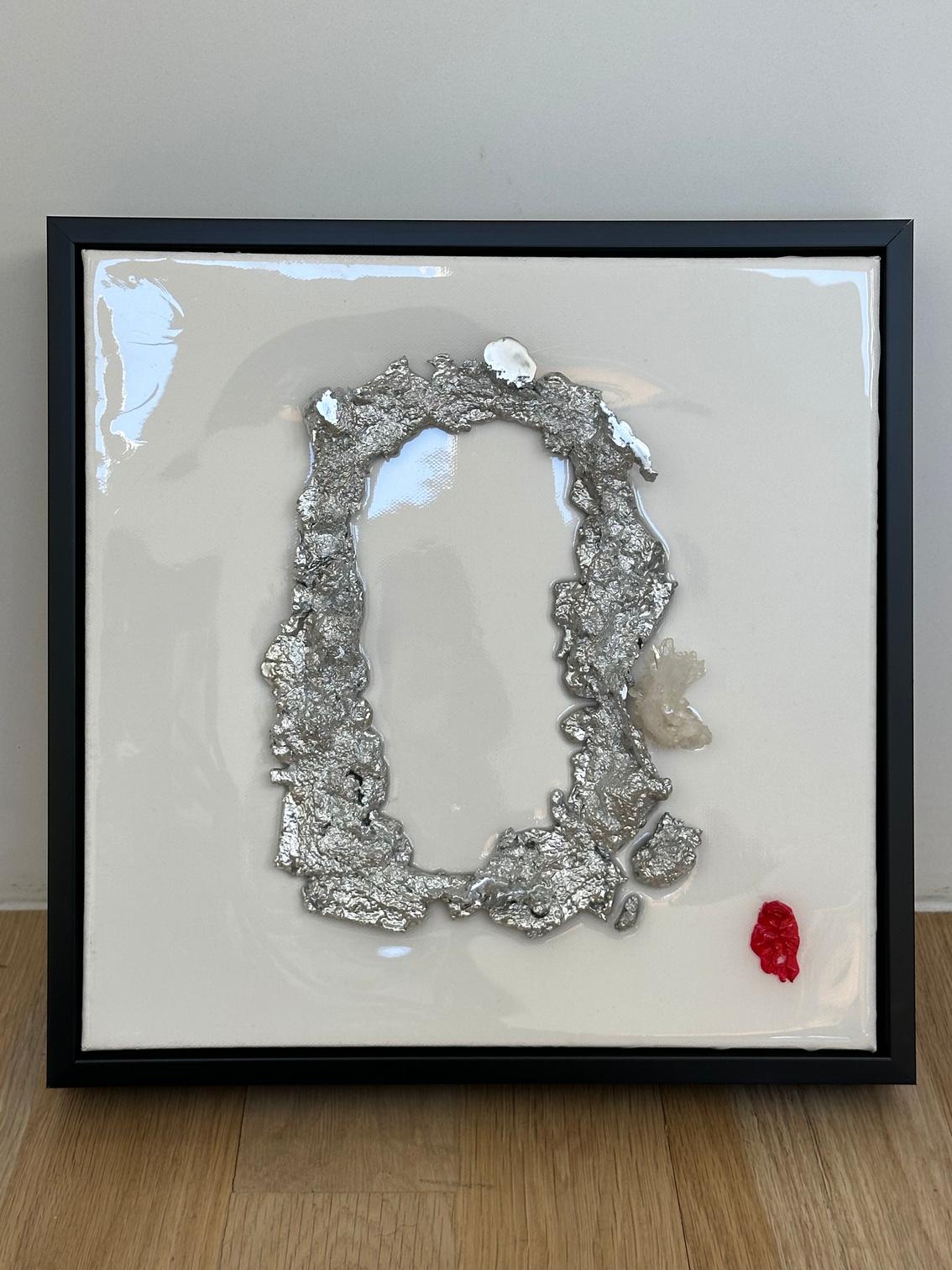 Desiree Griffith returns with Visceral, a work that once again demonstrates her remarkable ability to make materials do emotionalwork.Here,bismuthandquartzaresetinepoxyresin on canvas, forming a jagged, silvery oval — like a wound, or a mirror,oracell—thatsitsinafieldoftranslucentpaleground with a strange, hovering presence. A small red accent in the lower corner pulses like a heartbeat. The title is exactly right: this is a work that bypasses the mind and goes straight to the body, to something felt rather than understood. Compelling, unsettling,andbeautifulallatonce.