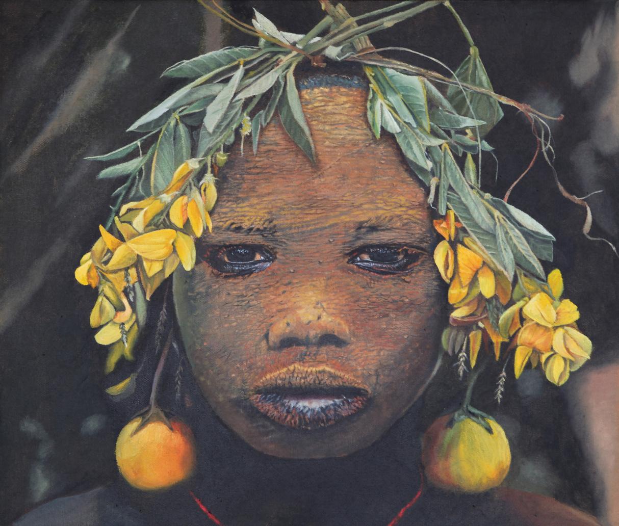 Zacharias Daniilakis's Surma is a portrait of extraordinary presence and quiet dignity. A child's face — painted in oil with remarkable skill and sensitivity — gazes directly outward from beneath a crown of yellow flowers and green leaves, the gaze steady, the expression still and self-possessed. Daniilakis renders skin and foliage with equal care, and the result is a painting that feels both intimate and monumental. This is a work about seeing and being seen — about the particular power of a face that holds your gaze completely and does not lookaway.