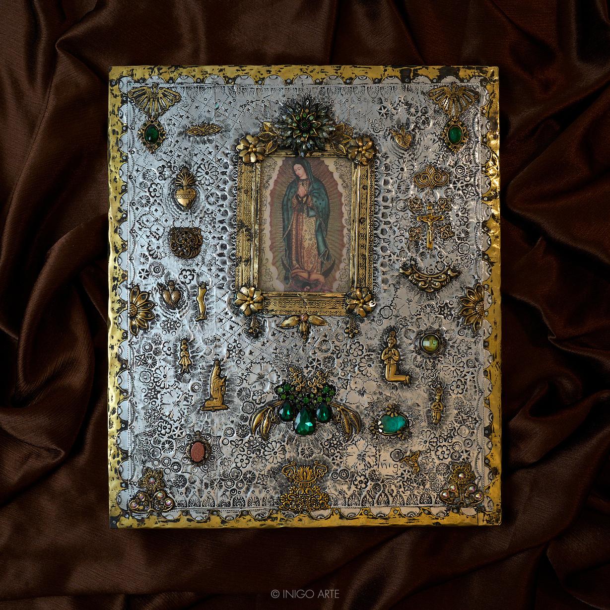 InigoArte'sIconoVirgendeGuadalupeisaworkthatshimmers with devotion and craft. The Virgin is set at the centre of an intricate field of embossed metal, surrounded by golden ornaments, jewelled brooches, sacred hearts, and gleaming green stones — every element placed with the care of an offering. It is part altarpiece, part jewellery box, part love letter to a tradition, and the effect is genuinely overwhelming. This is an object that carries the weight of faith and the pleasure of beauty in equal measure, and it rewards every moment of closeattention.