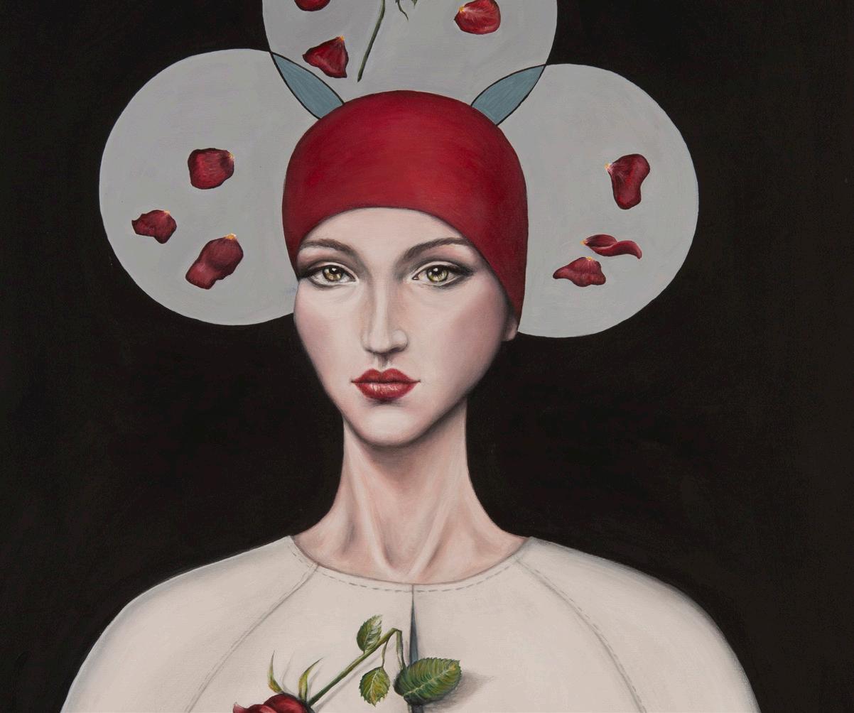 In highly technical large-scale oil paintings, Iryna Götz images are layered with symbolism and meaning. In the style of Renaissance masters, her portraits are imbued with realism and narrative. In The Butterfly Catcher, a veiled woman appears to be attempting to catch butterflies, referencing a desire to capture and hold onto something fleeting. Her elaborate dress and gold crown contrast beautifully with the iron in her hand, a symbol of banal domesticity. The figure stares steadfastly at the viewer. In Marie, the figure also looks back at the viewer resolutely. These are paintings infused with power and intrigue. Employing a rich warm colour palette and a highly detailed painterly technique, the artistâs visual vocabulary is unmistakable. Iryna Götz was born in Ukraine. She now lives and works in Germany.