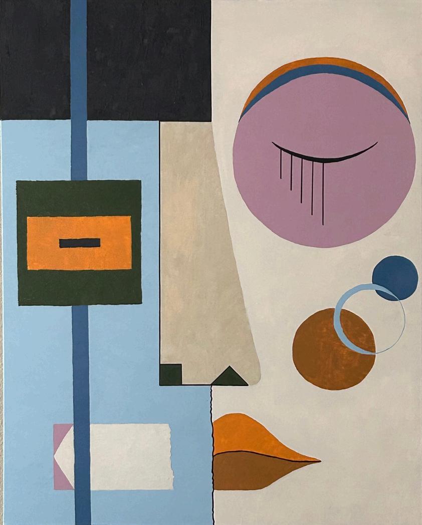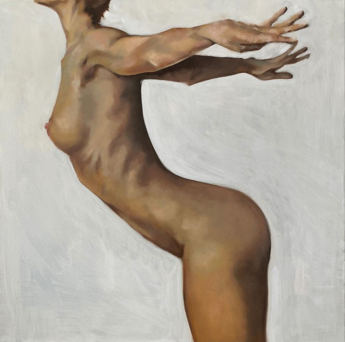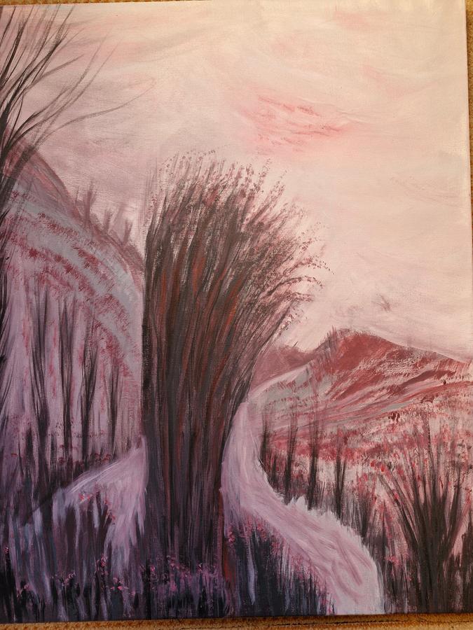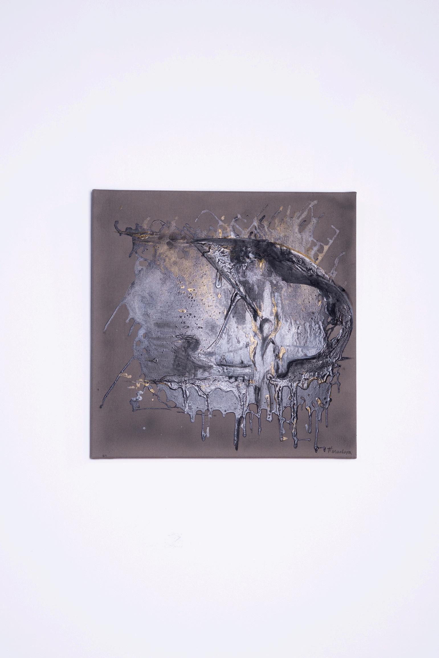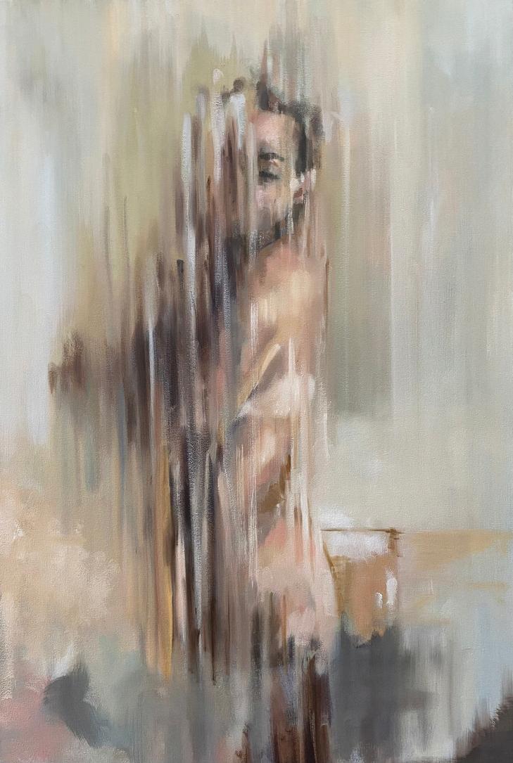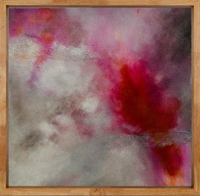 Organic vertical forms and a winding path suggest both movement and stillness, while delicate red accents emerge like fleeting traces of life within a muted atmosphere. Deluain’s approach is intuitive and refined, allowing simplicity to carry depth and meaning Rooted in her exploration of tonal nuance, the work embodies a contemplative elegance, where emotion is expressed with quiet precision