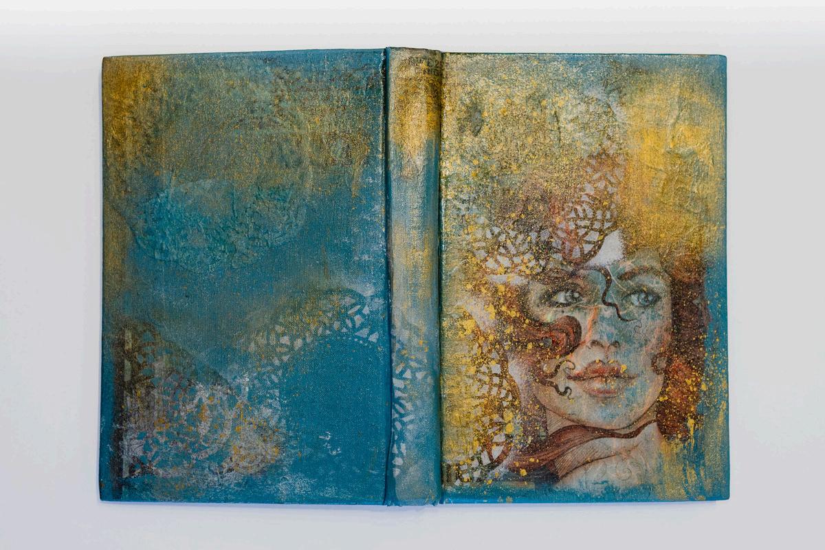 Hungarian artist Eva Toth channels her creativity into a breadth of different media, from make-up artistry to painting and sculptural book art Uniting her practice is an appreciation of beauty and a commitment to creativity as a path to self-knowledge Whether painting on the body or a book cover, the artist’s work is imbued with a precious, decorative quality. Pieces such as Memoirs of Casanova, The Peacock and Book Turquoise have the presence of unearthed artefacts. Their softly textured layered surfaces reveal traces of female faces, delicate patterns and gold accents Colours suggest symbolic meanings and collaged images hint at mysterious narratives. Toth’s work is unmistakably her own, embodying a unique visual language that exists at the intersection of fashion, photography, applied arts, and fine art.