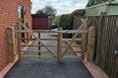 16. Continue along the road for some distance. When the road begins to bend sharp left, continue straight through a gap adjacent to a large wooden gate. Turn immediately left along a trail.