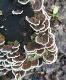 This year, plenty of damp weather and often quite mild temperatures in recent months mean some of our fungi have done remarkably well. When you walk in woods, parks, or along the moorland fringe, you will find tree stumps and rotting trunks covered in fungal fruiting bodies. Even in your own back garden, the autumn and winter can trigger massive growths of fungal bodies. A particularly distinctive species is the Basidiomycete fungus, called the ‘Turkey Tail’ or, to give it the scientific name, Trametes versicolor (formerly Coriolus versicolor or Polyporus versicolor). The upper fungal cap has concentric zones of different colours with the margin always the lightest and nearly pure white. The name ‘versicolor’ means many coloured and overall, this fungus looks like an American turkey’s tail. There is more to this fungus than