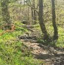 16. Cross over some stepping stones over a fast running stream, then continue to cross over two more streams. Pass a marker post on your right, then cross over another stream. Continue gently uphill for some distance, eventually the path continues with a wall on your right. Pass through a small wooden gate adjacent to a large wooden gate onto a road.