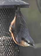 century, reaching Scotland to breed for the first time in 1989. Almost all Nuthatches are very sedentary, rarely moving far from where they hatched, often travelling is less than one kilometre. Consequently, they are still absent from Ireland, and from studies where birds are caught by netting and carefully recorded and ‘ringed’, no British-ringed Nuthatches have ever been recovered abroad. Similarly, no Continental-ringed birds have been found in England. Populations vary from yearto-year, which probably reflects food availability during the winter. Of course, this is why garden feeders are so significant, so keep up the good work as the Nut Hacker depends on your efforts!