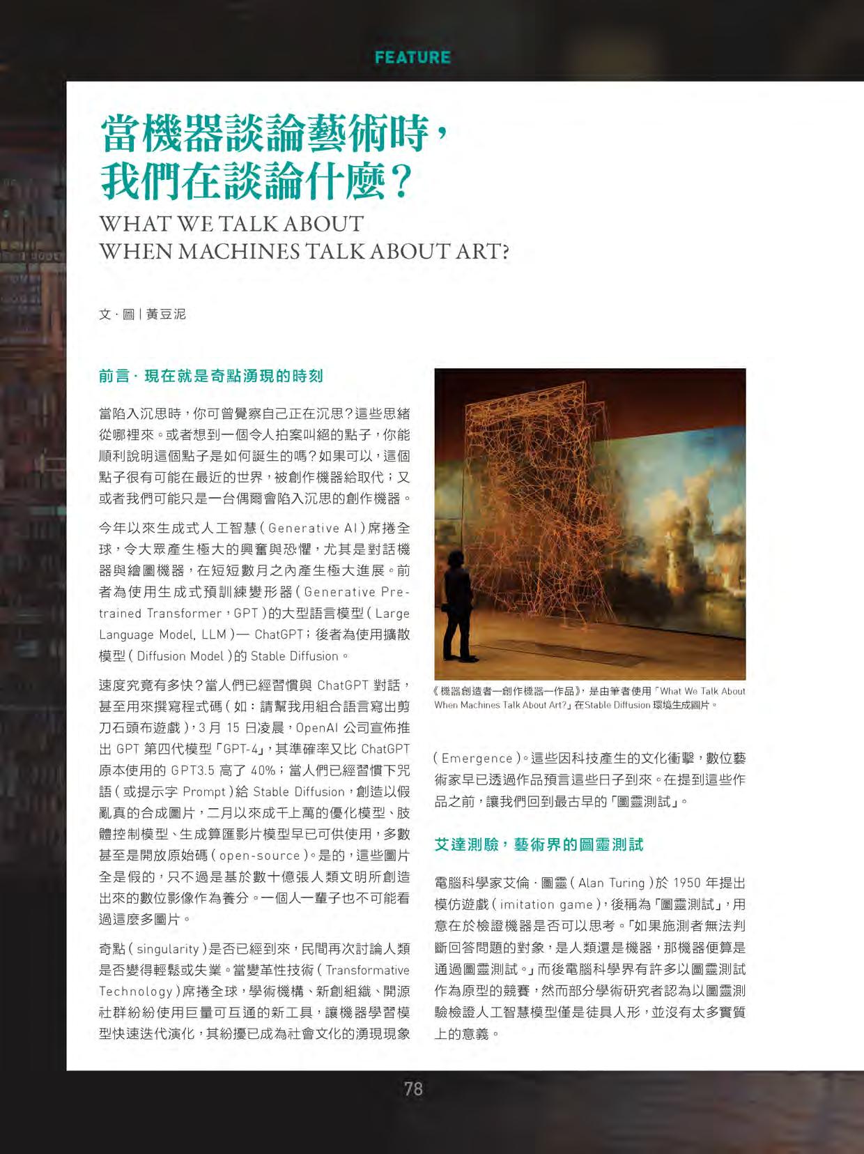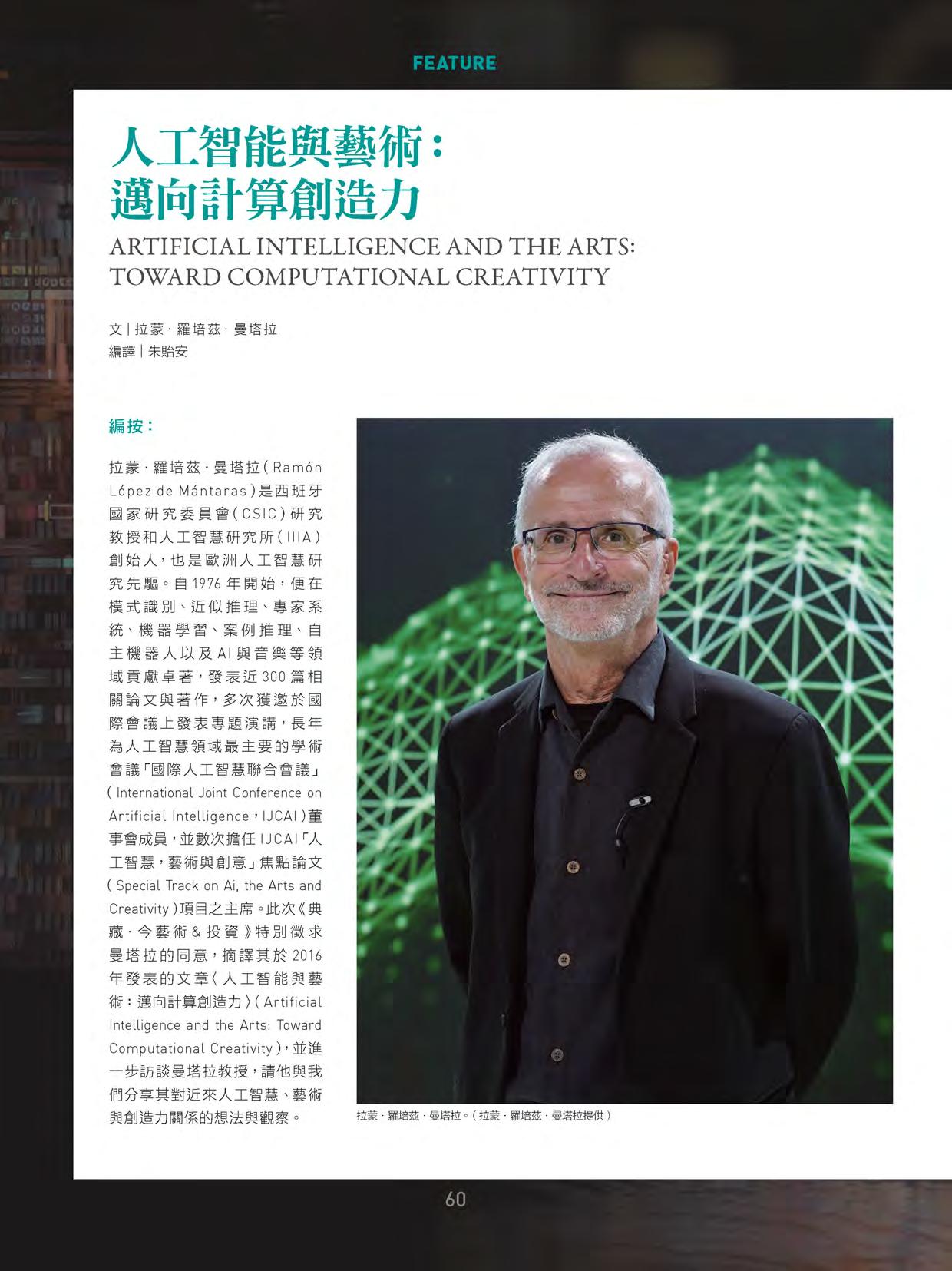 在這次專題中,我們特別訪問了兩位國際重要的人工智慧研究者與創作者,分別是歐洲人工智慧研究先驅、西班牙國家研究委員會(CSIC)人工智慧研究所(IIIA)的拉蒙.羅培茲.曼塔拉(Ramón López de Mántaras)教授,以及AI藝術家與學者列夫.曼諾維奇(Lev Manovich)。曼塔拉教授除了著作等身,也是「國際人工智慧聯合會議」(International Joint Conference on Artificial Intelligence,IJCAI)的重要成員,數次擔任「人工智慧,藝術與創意」焦點論文(Special Track on Ai, the Arts and Creativity)項目之主席。專訪之外,我們也翻譯了其探討人工智慧與藝術的專文。曼諾維奇是2023年林茲電子藝術獎的評審,該獎項在2019年便設立了「人工智慧」與「生命藝術」(Artificial intelligence & Life Art)類別,以回應現今藝術世界的轉變。AI工程師莊向峰的專文從曼諾維奇的提問開始,除了爬梳近三到五年AI技術的變化如何刺激我們對「生成」與「創造力」之間關係的再思考,文末則採訪了曼諾維奇,請他與我們分享其觀點,更重要的是,提供了創作者們面對AI浪潮衝擊,乃至於純然藝術創作的具體建議。深諳區塊鏈、Web 3.0的數位原住民黃豆泥則藉由藝術家與AI互動的案例,帶領我們檢證「AI機器的創造力」。藝術史學者沈伯丞的專文則提點我們,如何開拓「Unknow unknowns」的創造力。最後,既然主題是「演算藝術」,此次專題開門的設計自然以演算法作為圖像生成的主要工具。(企劃/朱貽安)
