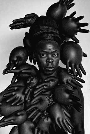 Ma se la disruption ossia la spaccatura del mondo di oggi è evidente, la fine del mondo non lo è affatto. Già nel 1985 l’eco femminista Donna Haraway aveva annunciato nel suo Cyborg Manifesto, l’avvento di creature ibride, non più definibili da rigidi confini tra l’umano e il non umano, o tra l’umano e la macchina. Si tratta di un’interpretazione dell’evoluzione che mette l’accento non sulle definizioni identitarie, ma sui processi e i meccanismi in trasformazione, sia biologici, sia culturali. Nel lavoro artistico soprattutto di donne non occidentali, spesso nere o asiatiche, il tema del rapporto con il futuro ricompare e rivive, ma con tutt’altri riferimenti. La metamorfosi già in atto, vissuta attraverso l’emancipazione del proprio corpo è forse l’aspetto più interessante. Anche il corpo ibrido, metafora del nostro pianeta oggi, potrà essere matrice identitaria feconda, e non ci sono immagini più belle che propongono questa visione della serie di autoritratti di Zanele Muholi, artista sudafricana queer, intitolata Somnyama Ngonyama (nella lingua zulu “Sia lode alla leonessa nera”).