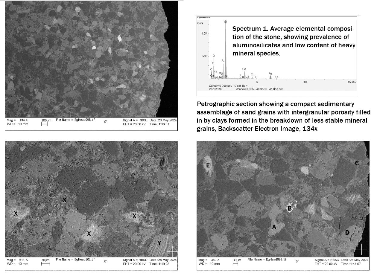 (Right) Excerpts from the analysis report by John Twilley. Various techniques were used, including optical petrography, which involves examining thin sections of the metagreywacke under a petrographic microscope.