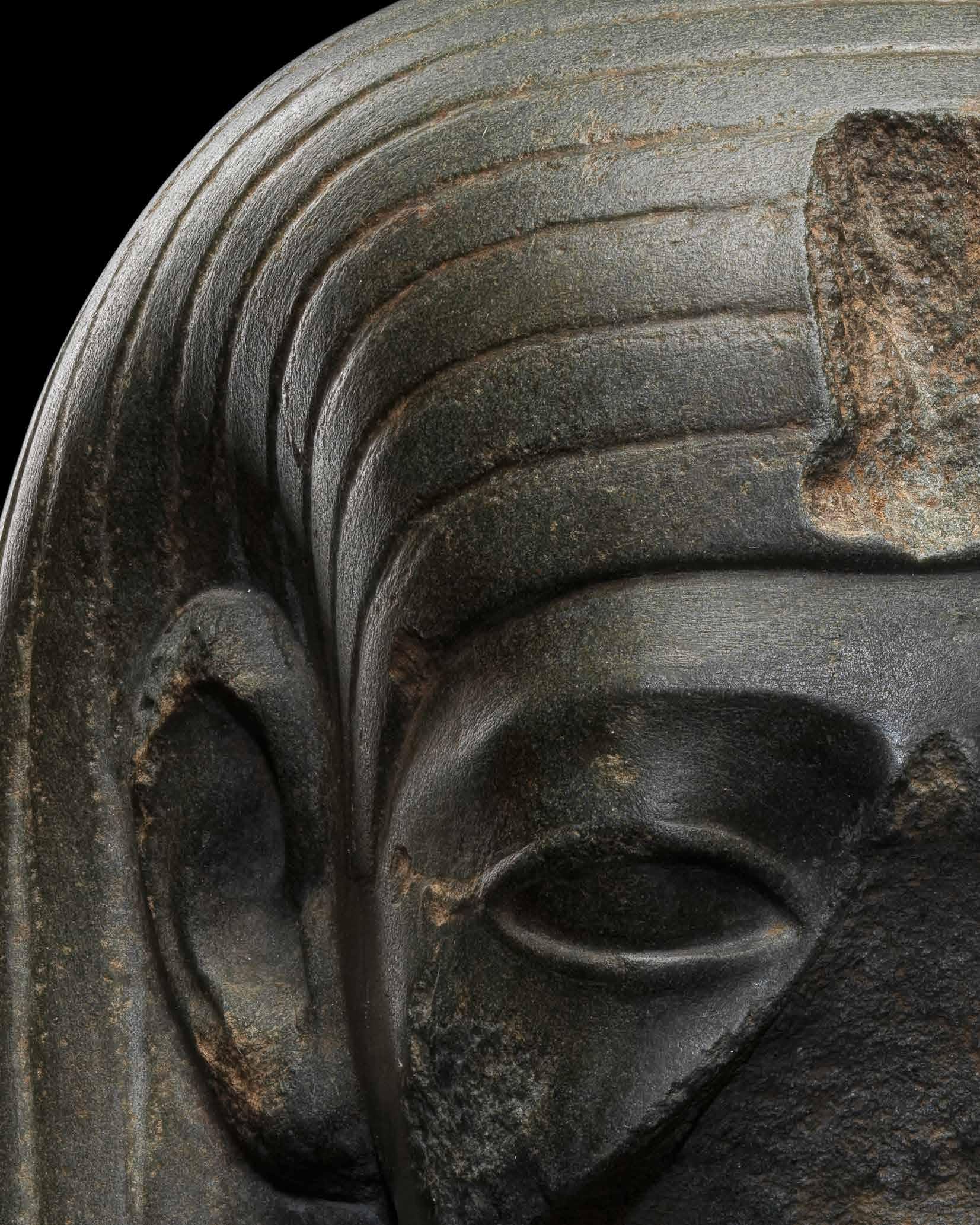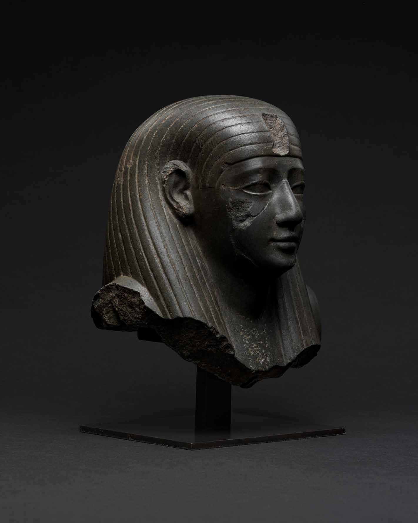 A fine Egyptian head of a goddess carved from dark metagreywacke stone. The facial features are smoothly carved, with lightly suggested eyebrows above eyes with extended cosmetic lines. Both ears are visible in front of the wig. The tripartite wig is parted unusually over the shoulders, with incised lines dividing into two sections above the centre of each shoulder, one parting forwards in a smooth curve, the other running parallel to the lines down the back of the wig. Damage to the front of the wig suggests it was originally surmounted by a uraeus. The nose, mouth, and chin were previously skilfully restored, using a piece of stone taken from the underside rear of the head, most likely in the eighteenth-century.