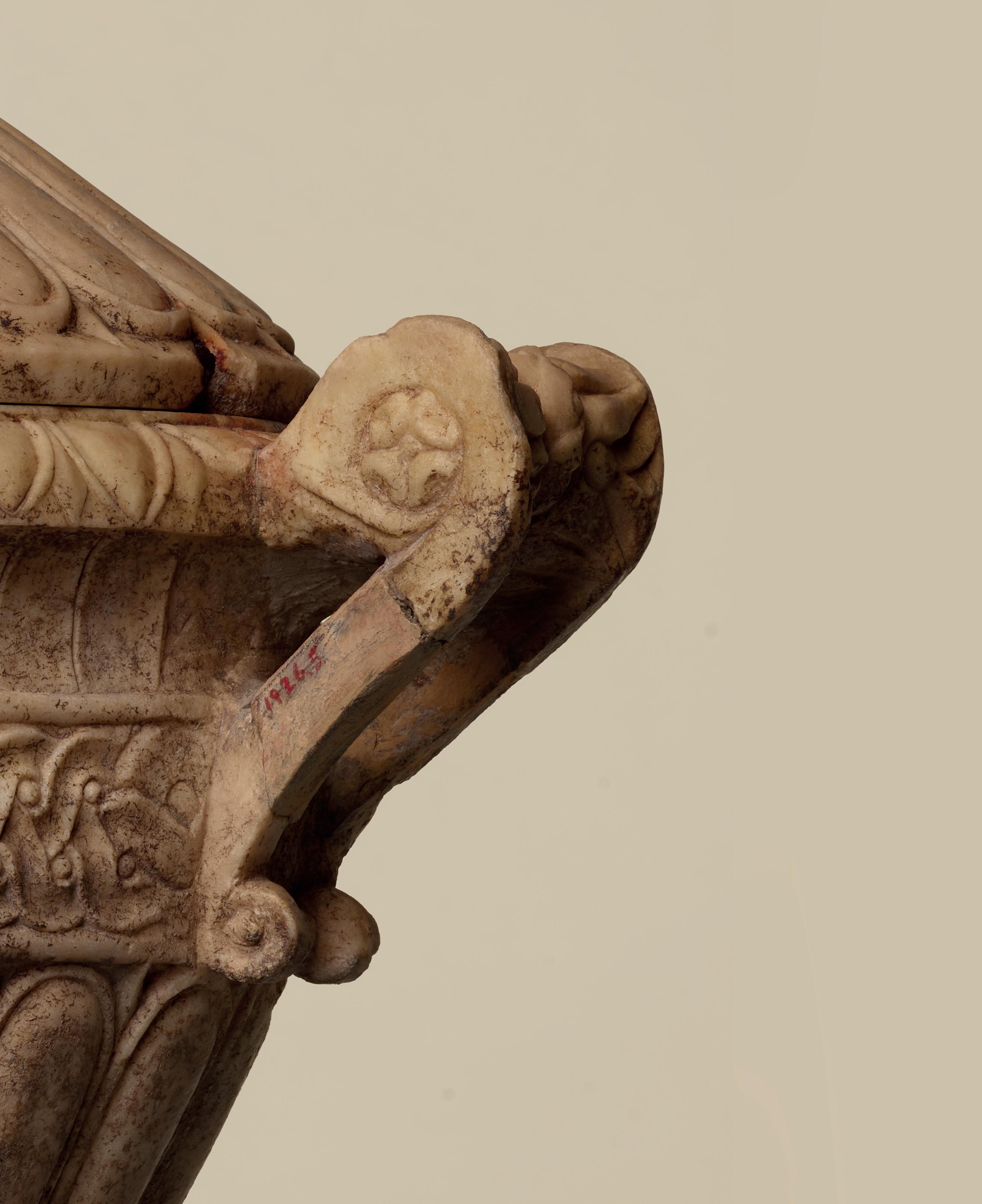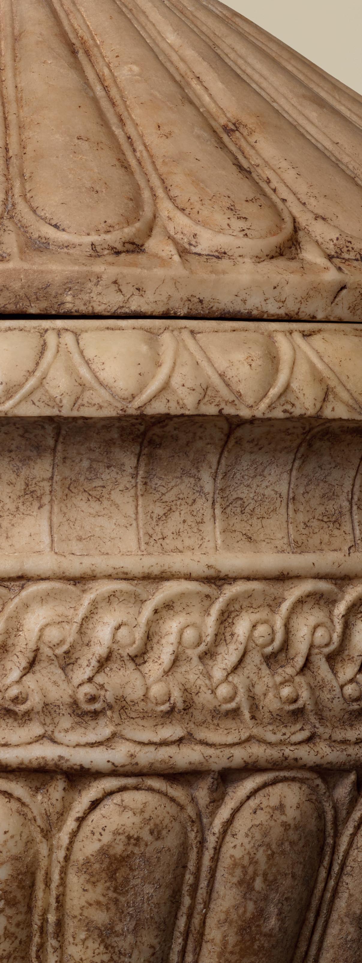The sculptor paid particular attention to the deeply carved muzzle, which is raised to reveal the animal’s mouth. The aligned, regular teeth are revealed in an astonishing, quasi human smile. The corners of the lips are pulled back in a way that emphasises the tension of the contracted, fearsome jaw, while the rounded chin lends balance to the piece. It is impossible to be anything less than awestruck by the force emanating from this uniquely stylised work, which oscillates between naturalistic detail and an almost anthropomorphic rendering of the animal’s ears, smile and frontality. This detail, sculpted in the round, is carved from polychrome Oriental alabaster, with which the sculptor was able to suggest the nose leather and whiskers without even representing them. Coloured stone was particularly precious and prized as such due to its rareness. By and large, the sandy, honey coloured tones of this piece of alabaster, with a polish that hints at the animal’s powerful muscles, subtly echo its mottled coat. A similar play of colours can be found in a trapezophore made from Pavonazzetto marble preserved at the Michael C. Carlos Museum in Atlanta (ill. 1).