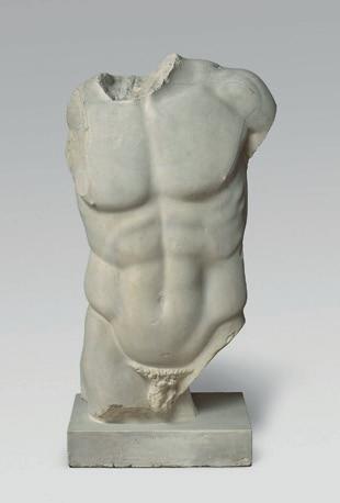 that runs down the body to the carved navel. The abdominal muscles are arranged through a rigorous sequence of horizontal and vertical lines, a direct reference to the classical canon of Greek antiquity. This highly accurate visual grid accentuates the vivacity of the body and further idealises the model, all while maintaining a certain anatomical realism. The iliac bones are particularly distinct, forming a ‘V’ and further contributing to the athletic appearance of our torso. The back displays full curves and supple transitions between the muscles and hips. The buttocks, rounded and firm, attest to a keen observation of the body in tension. A lateral hollow