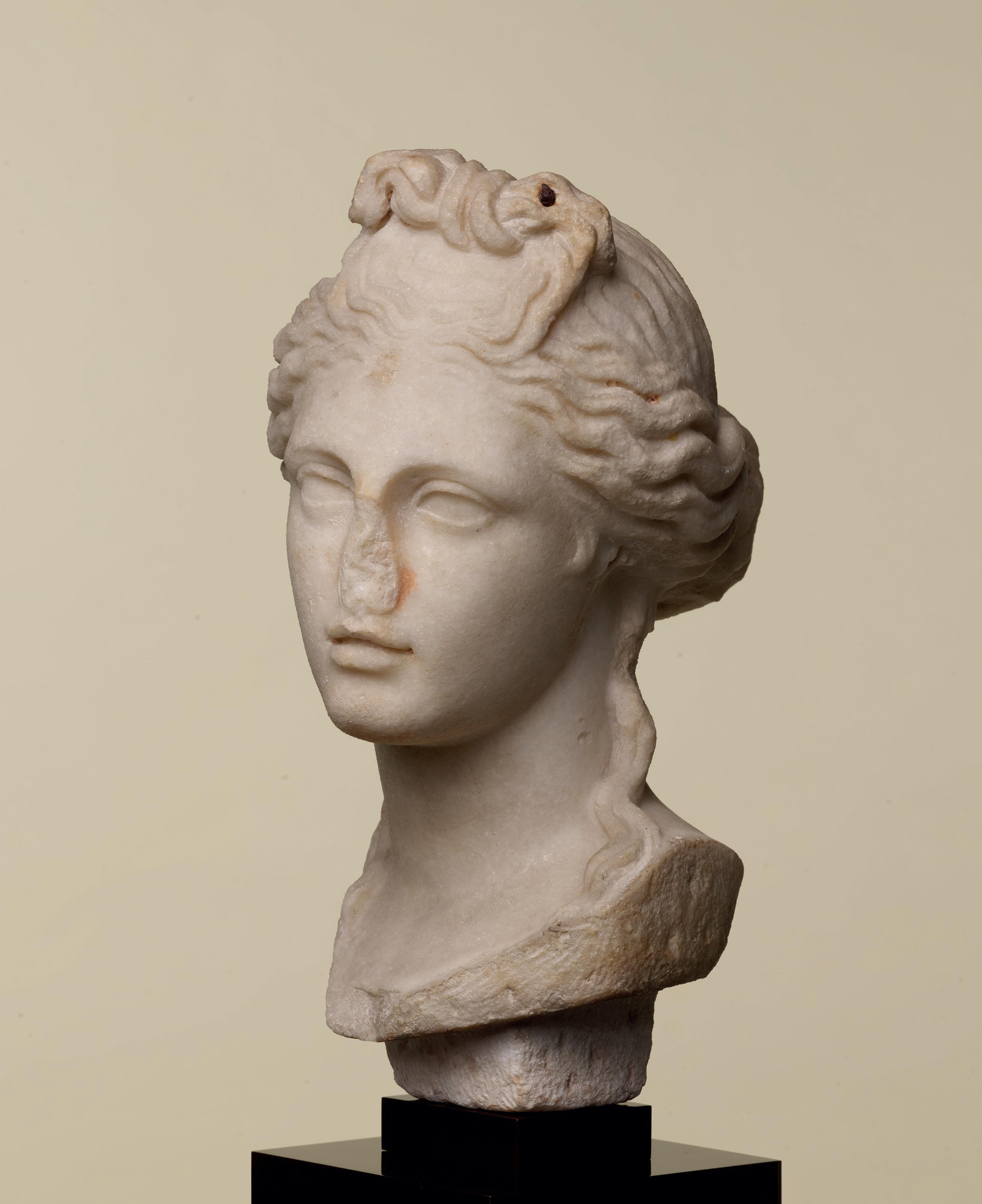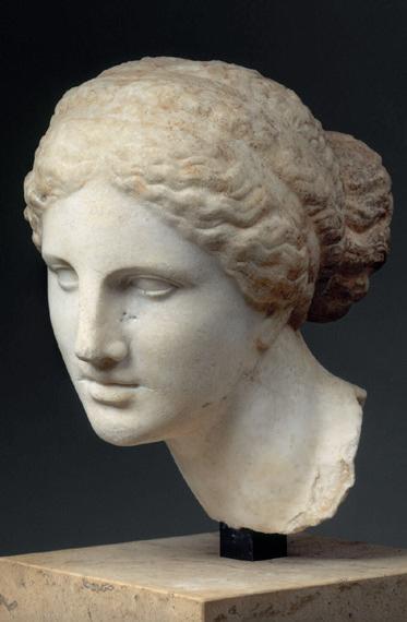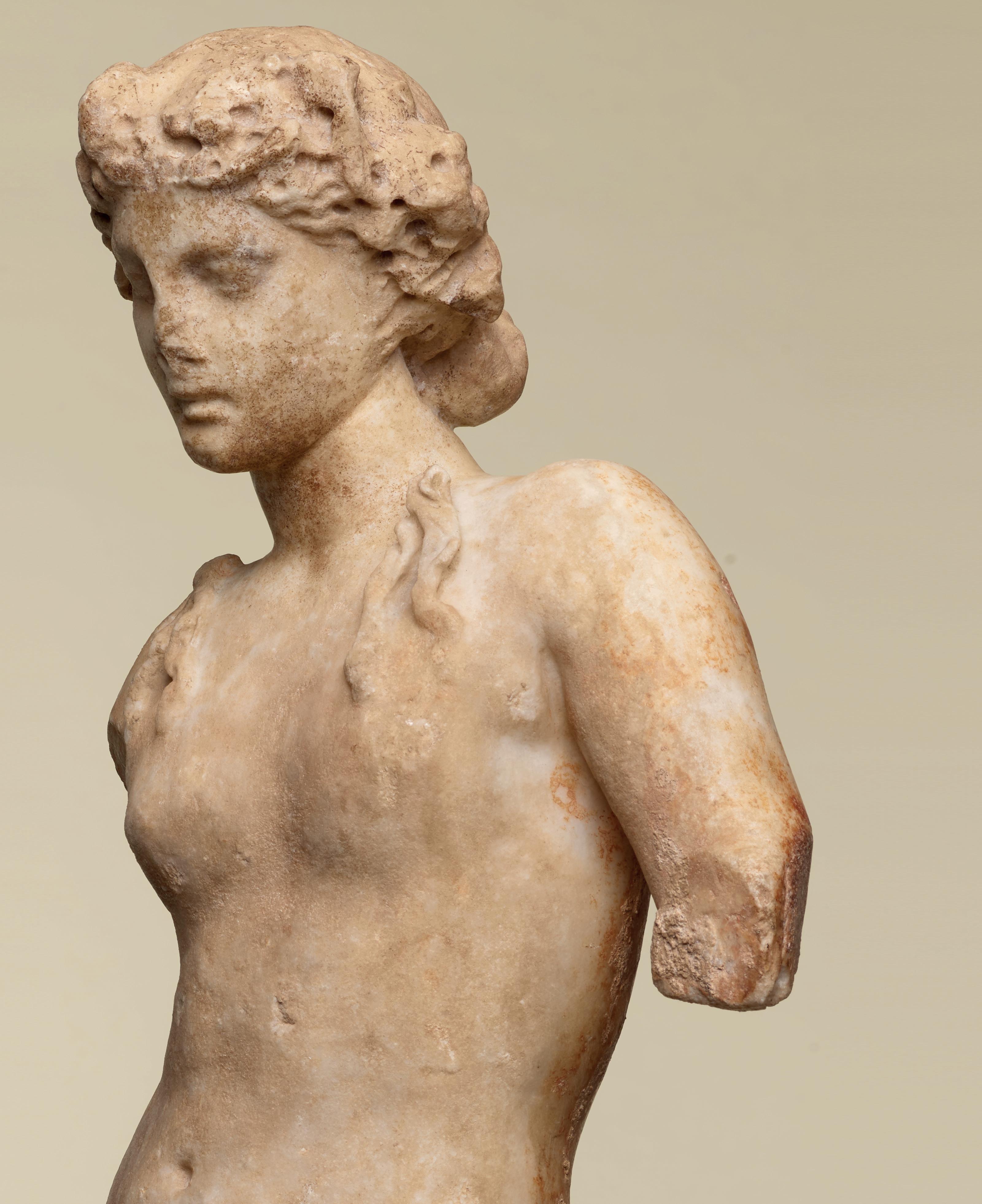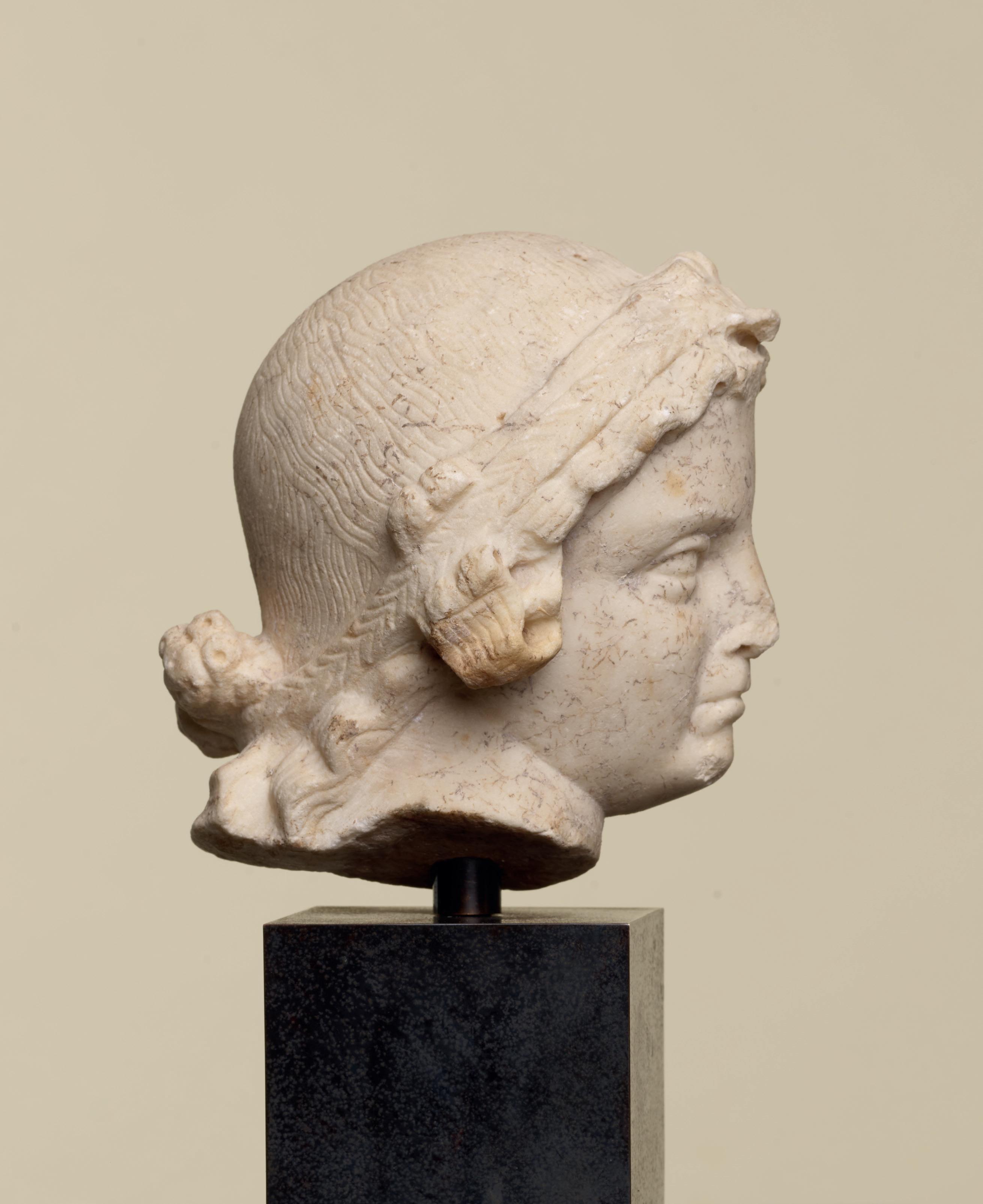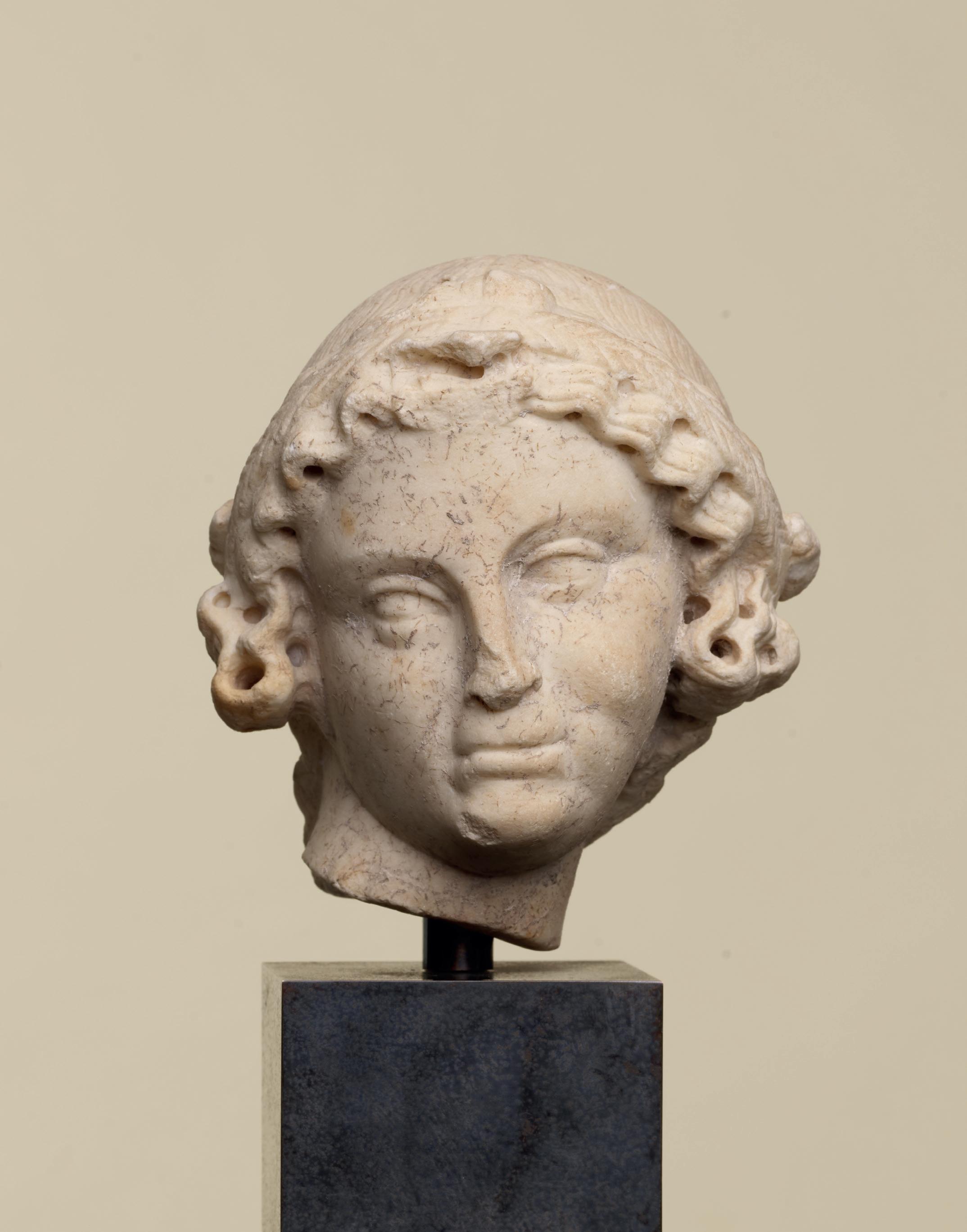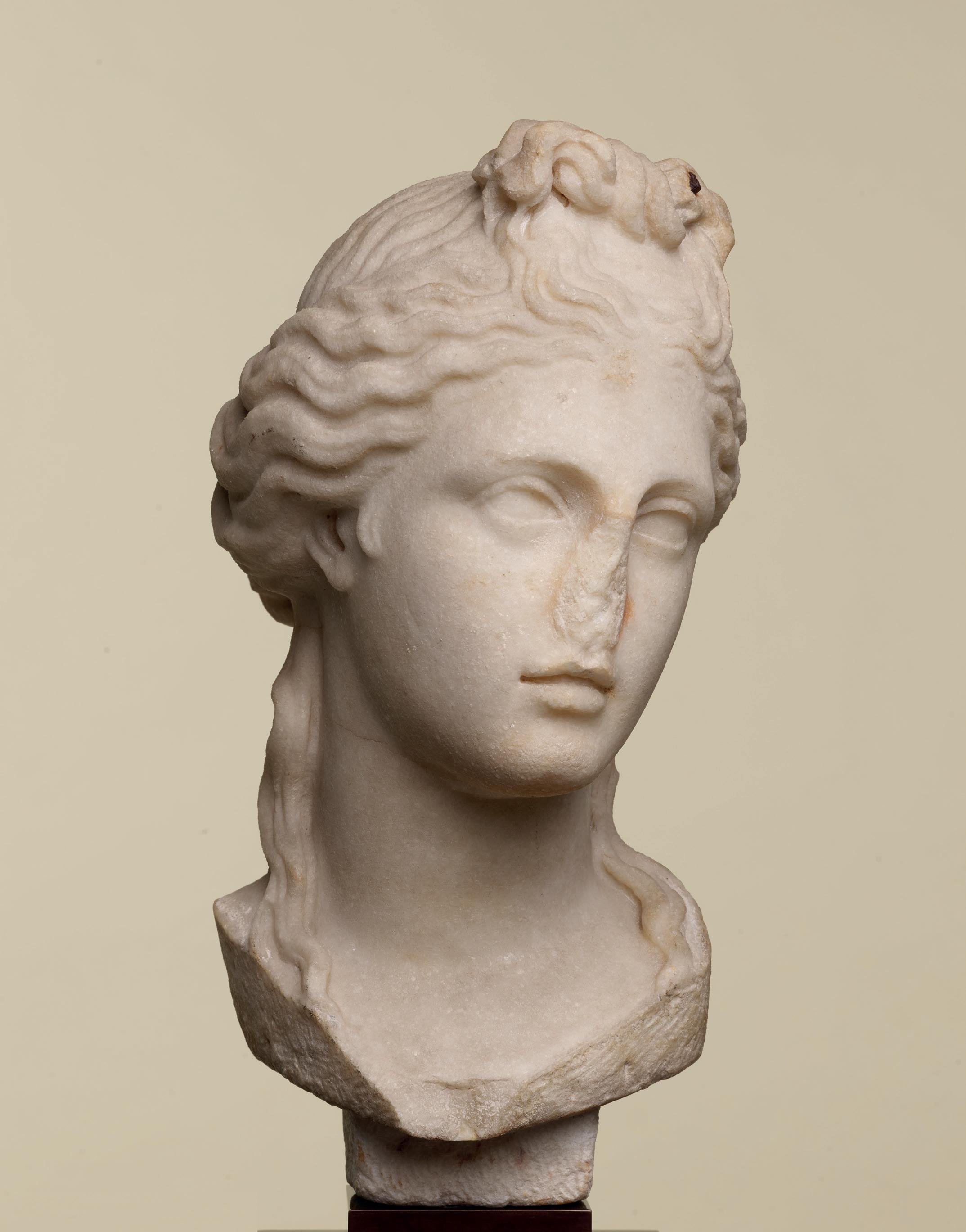 is wearing. It holds back the rest of Aphrodite’s hair, girding it in a play of texture and weight that distracts from the marble and gives the illusion that her hair is truly gripped by the adornment. A low chignon at the back of her head completes the structure of her hair and balances the whole look.This freestanding marble statue exhibits remarkable sculptural qualities. Although it is a reduced model, the firmness of its execution and the attention to detail are nothing less than striking, similarly to those of large scale statuary. Moreover, the contrast between the smooth, polished marble of the goddess’ flesh and the animated surface of her hair, in which the shiniest of the marble’s crystals resemble as many gems, attests to the artist’s technical mastery. The sculptor’s light, steady chiselling marvellously shaped the textures and contours of this celestial face. It bears the marks of centuries spent underground, such as the concretions that are still visible today. The nose and chin attest to its material history. Apart from its aesthetic qualities, this work is also an archaeological relic, a historical testament to a lost civilisation.
