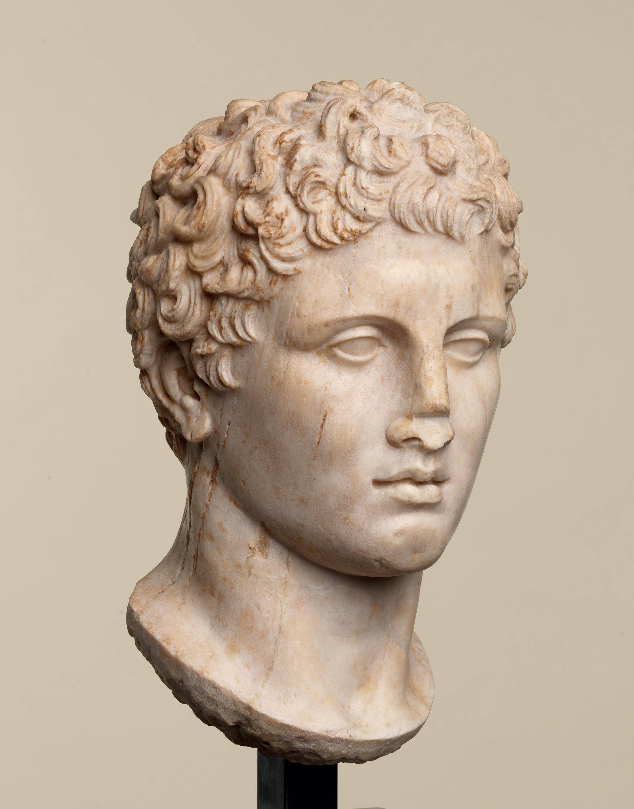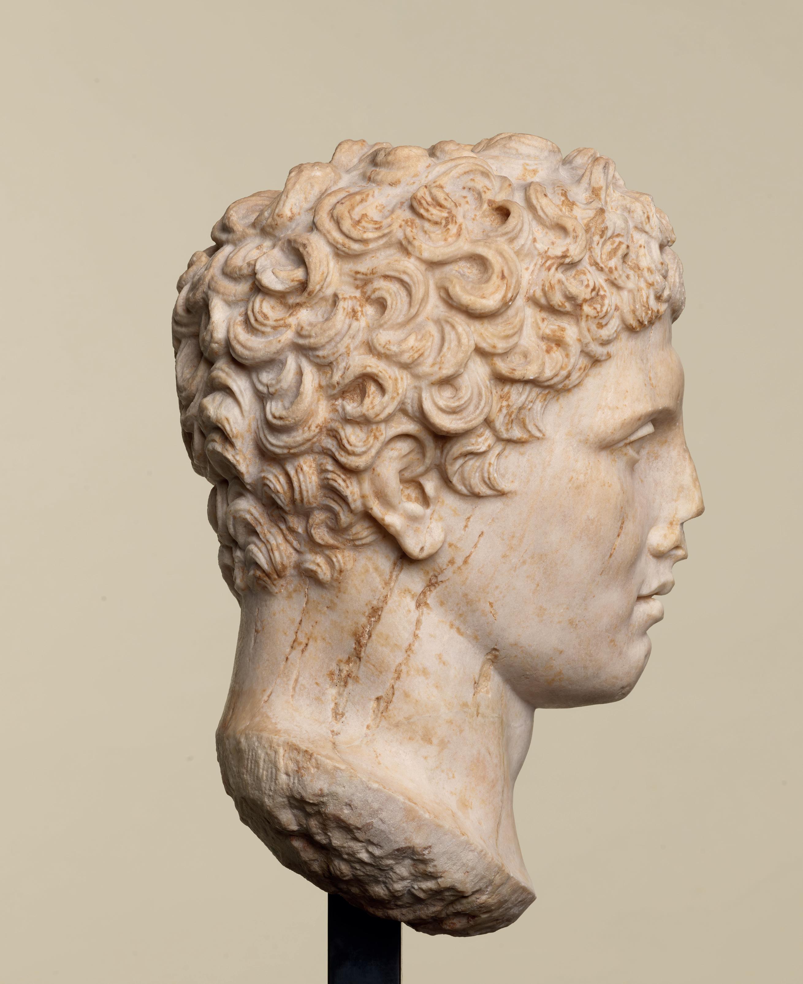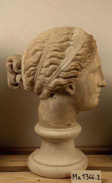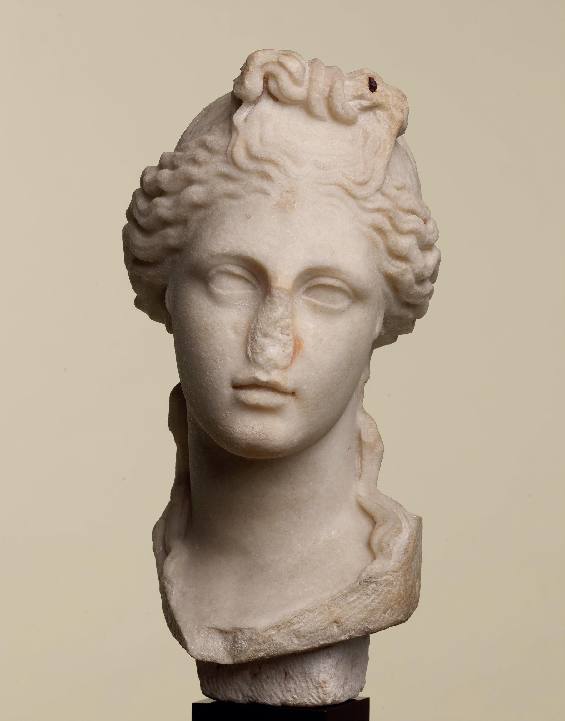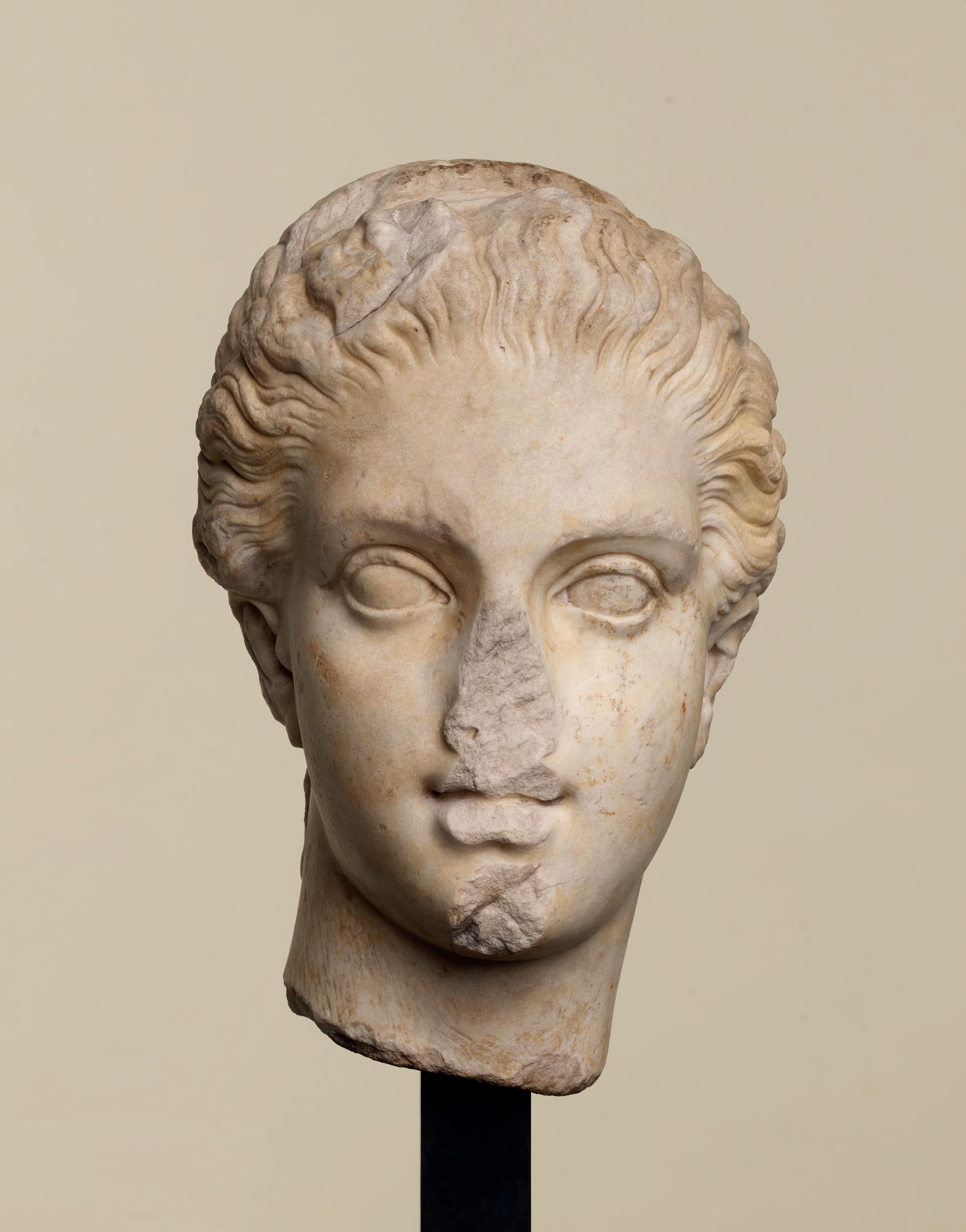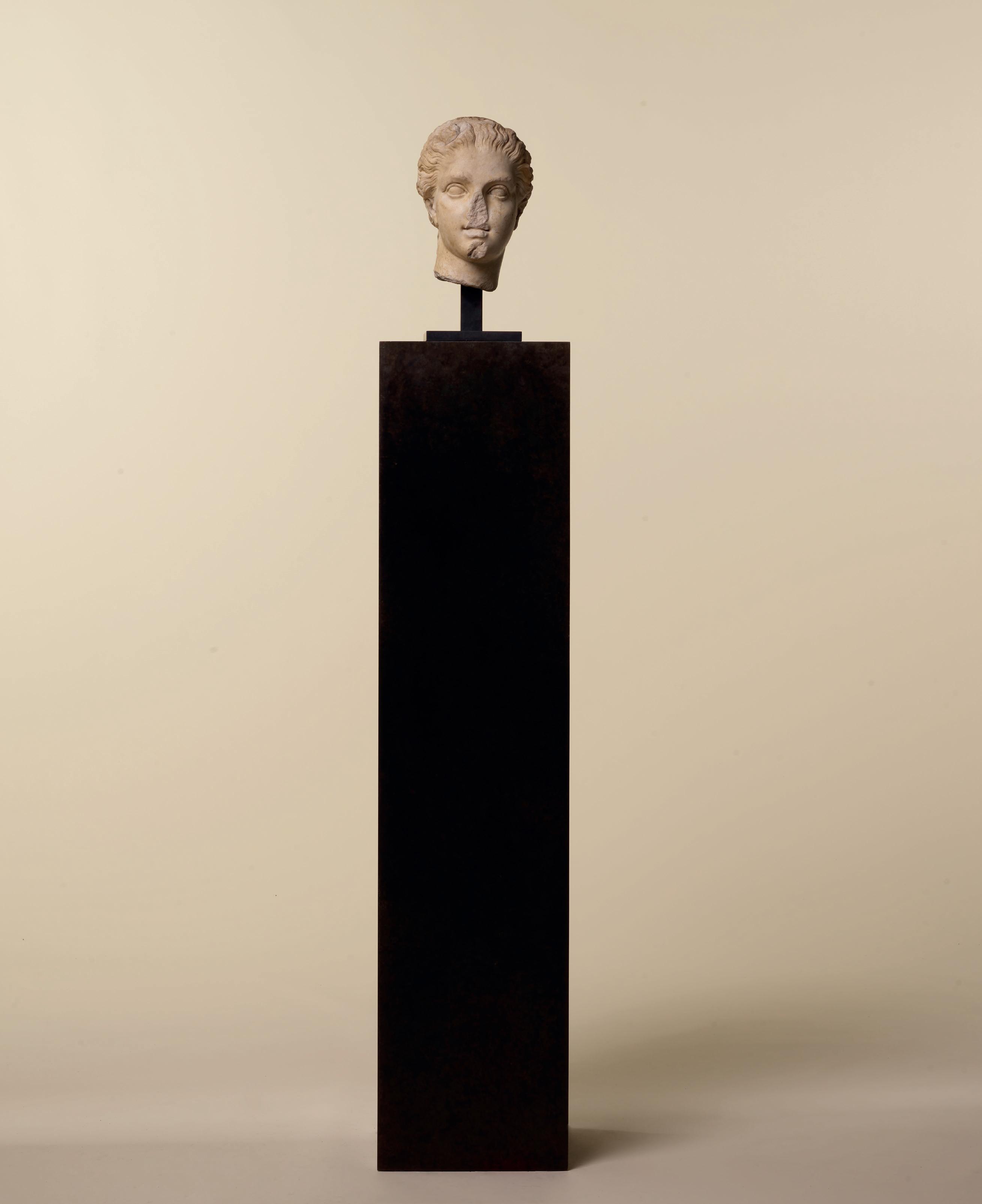 is wearing. It holds back the rest of Aphrodite’s hair, girding it in a play of texture and weight that distracts from the marble and gives the illusion that her hair is truly gripped by the adornment. A low chignon at the back of her head completes the structure of her hair and balances the whole look.This freestanding marble statue exhibits remarkable sculptural qualities. Although it is a reduced model, the firmness of its execution and the attention to detail are nothing less than striking, similarly to those of large scale statuary. Moreover, the contrast between the smooth, polished marble of the goddess’ flesh and the animated surface of her hair, in which the shiniest of the marble’s crystals resemble as many gems, attests to the artist’s technical mastery. The sculptor’s light, steady chiselling marvellously shaped the textures and contours of this celestial face. It bears the marks of centuries spent underground, such as the concretions that are still visible today. The nose and chin attest to its material history. Apart from its aesthetic qualities, this work is also an archaeological relic, a historical testament to a lost civilisation.