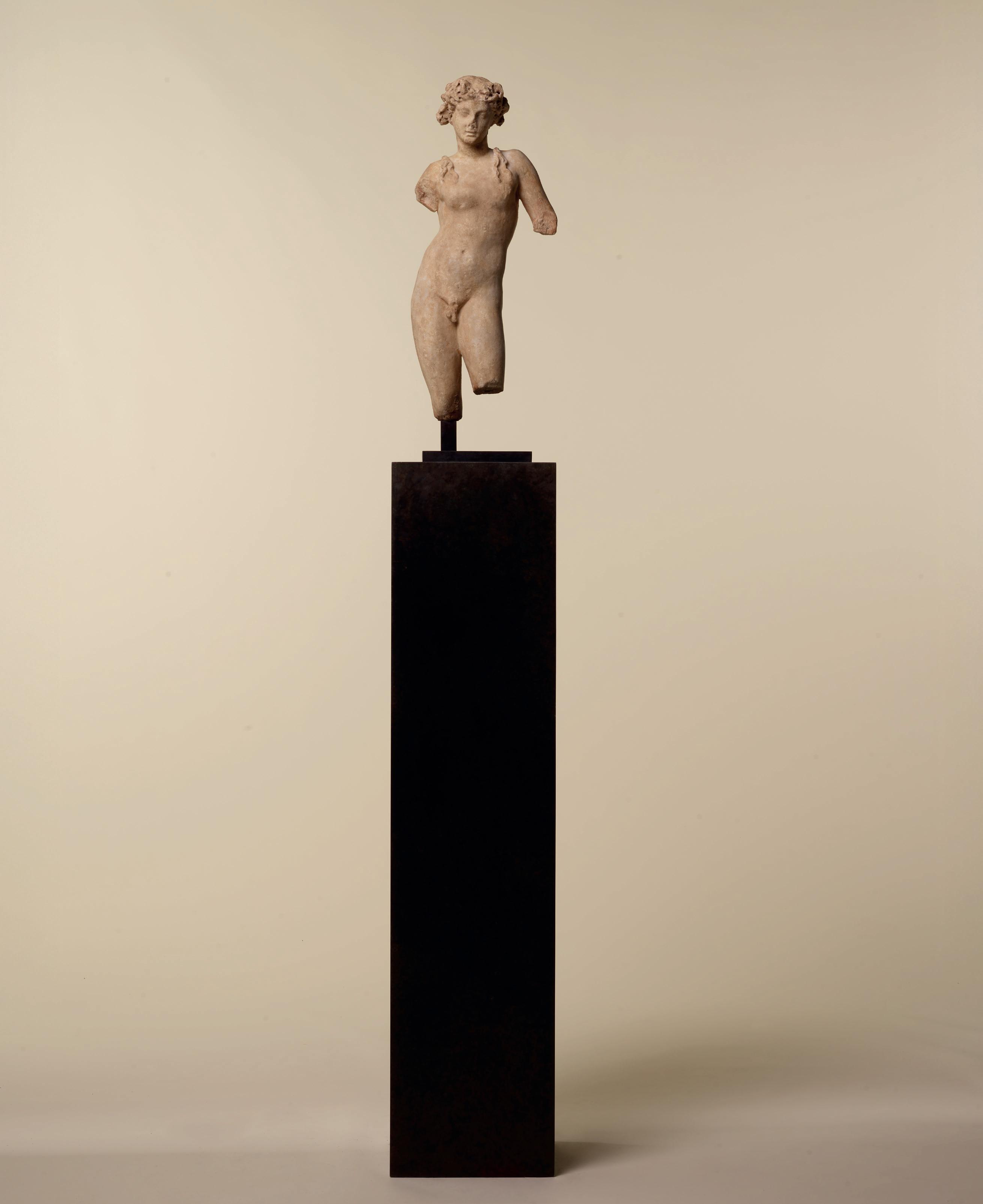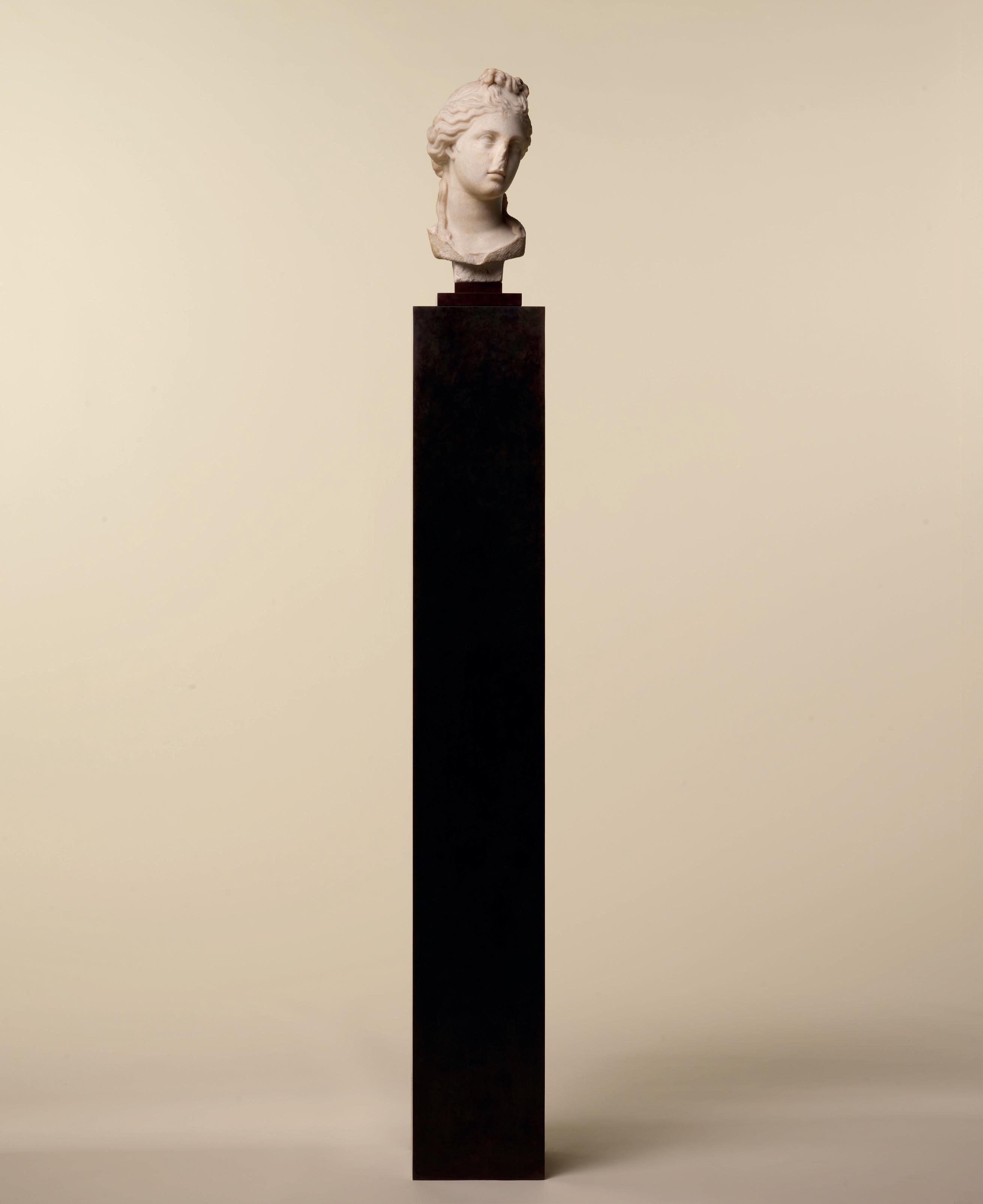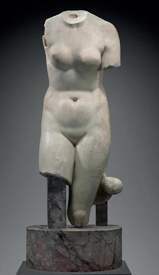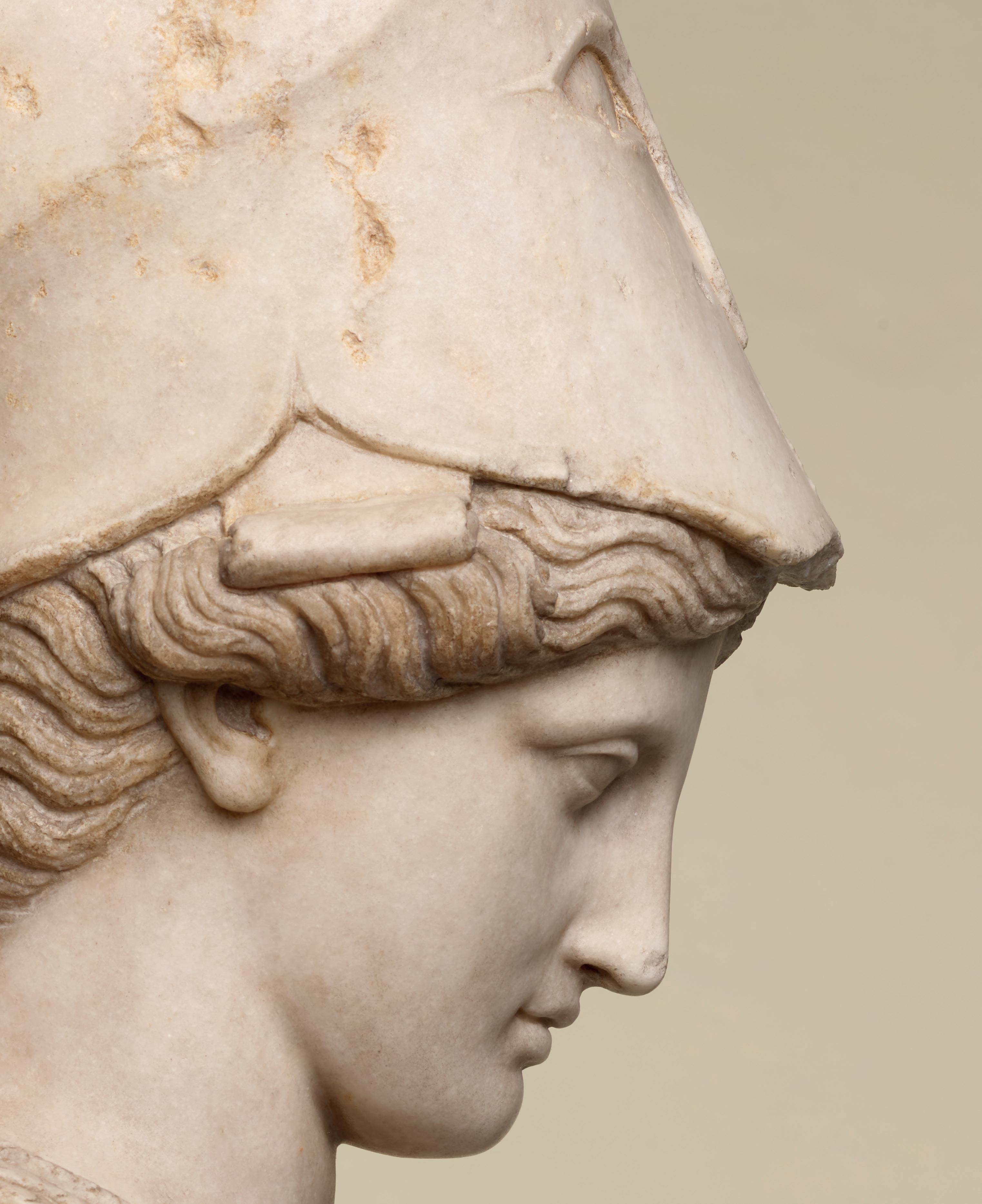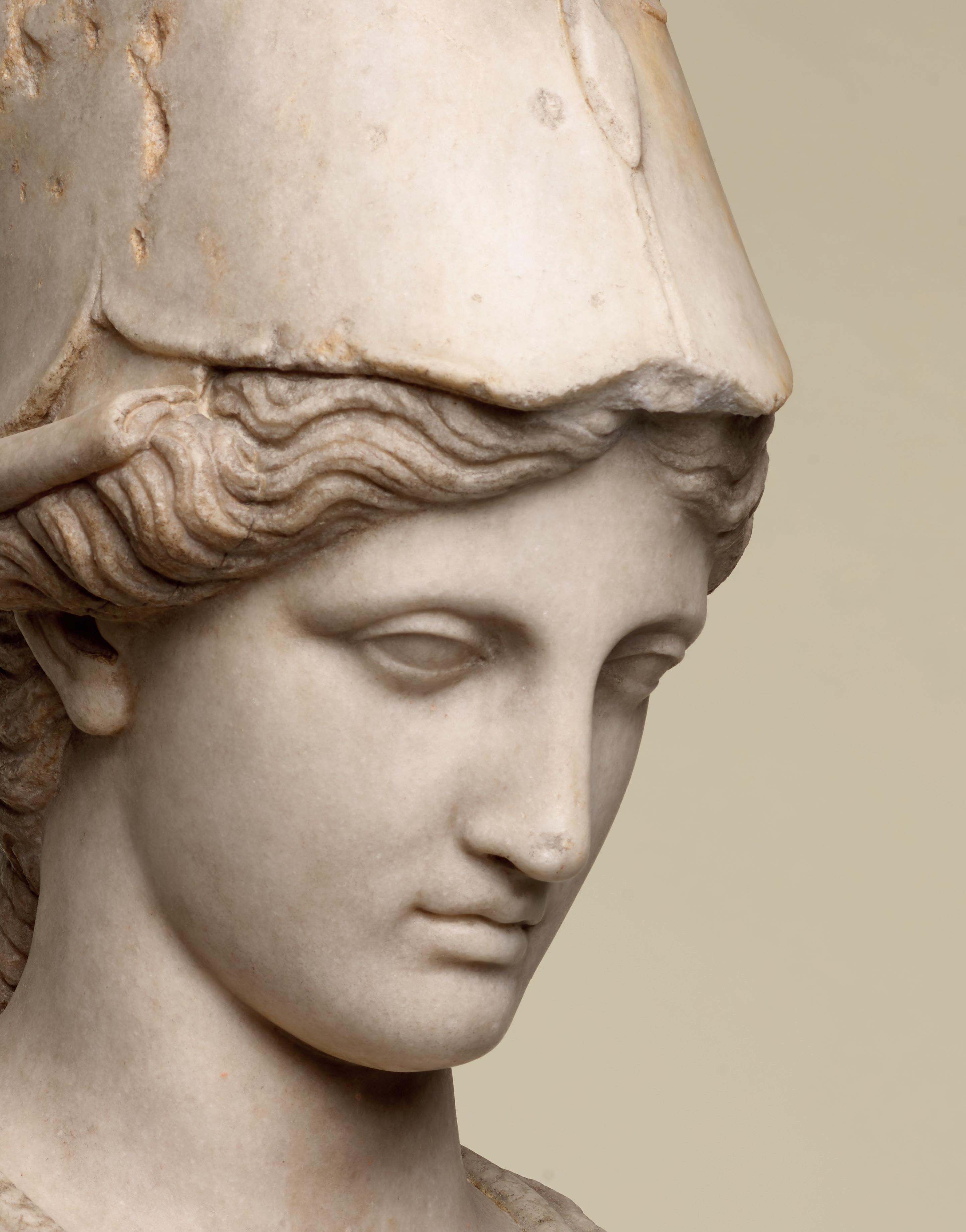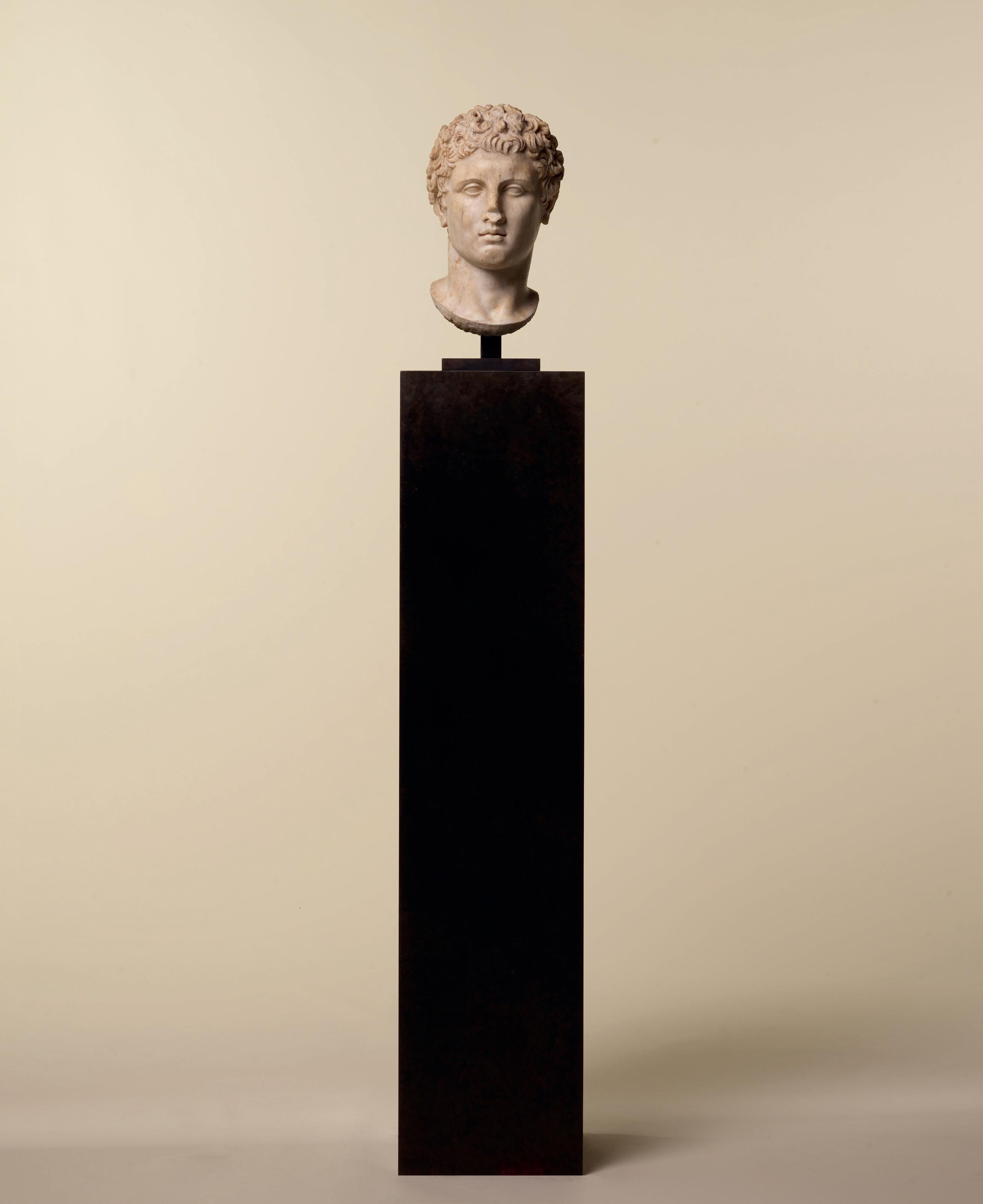 is wearing. It holds back the rest of Aphrodite’s hair, girding it in a play of texture and weight that distracts from the marble and gives the illusion that her hair is truly gripped by the adornment. A low chignon at the back of her head completes the structure of her hair and balances the whole look.This freestanding marble statue exhibits remarkable sculptural qualities. Although it is a reduced model, the firmness of its execution and the attention to detail are nothing less than striking, similarly to those of large scale statuary. Moreover, the contrast between the smooth, polished marble of the goddess’ flesh and the animated surface of her hair, in which the shiniest of the marble’s crystals resemble as many gems, attests to the artist’s technical mastery. The sculptor’s light, steady chiselling marvellously shaped the textures and contours of this celestial face. It bears the marks of centuries spent underground, such as the concretions that are still visible today. The nose and chin attest to its material history. Apart from its aesthetic qualities, this work is also an archaeological relic, a historical testament to a lost civilisation.