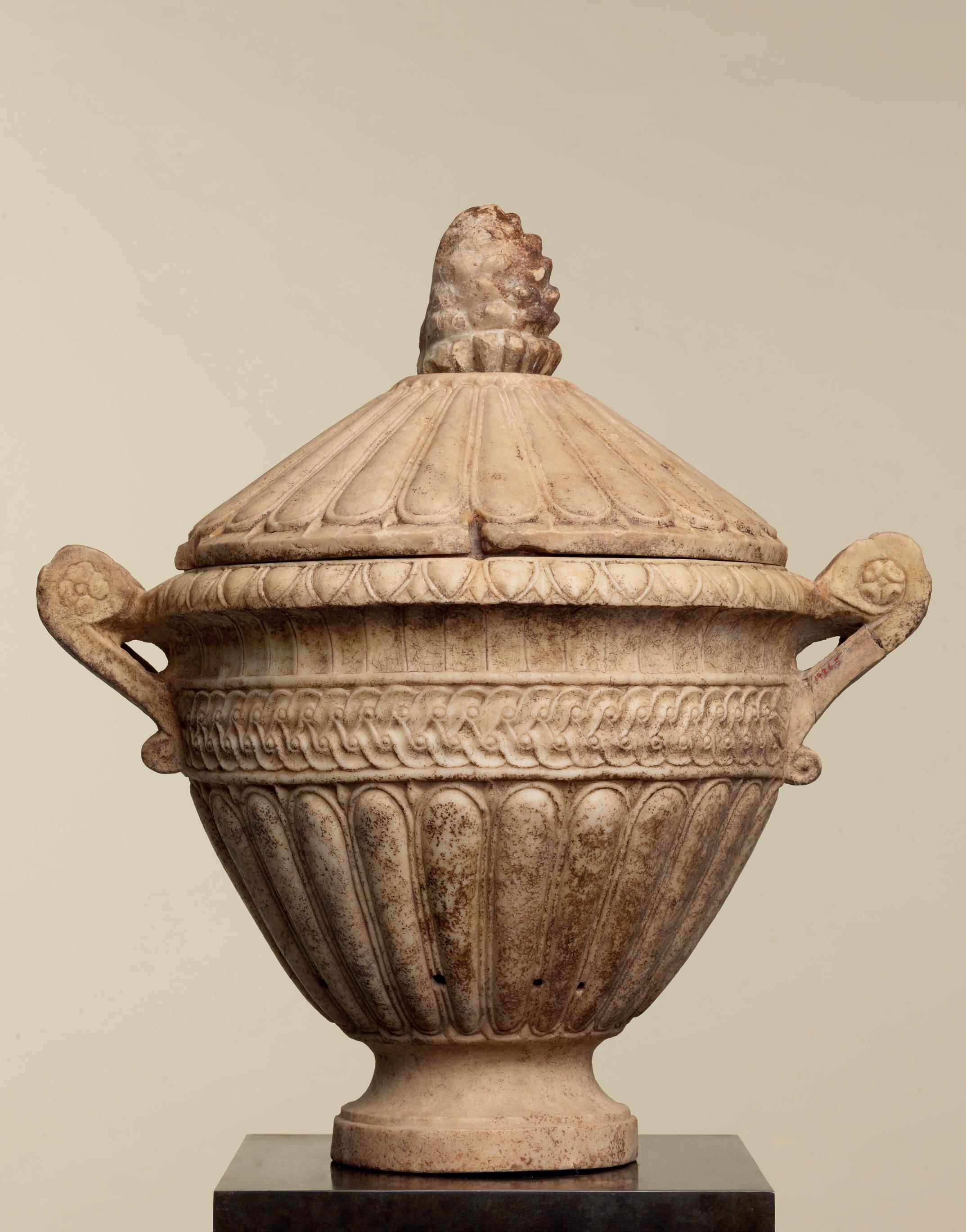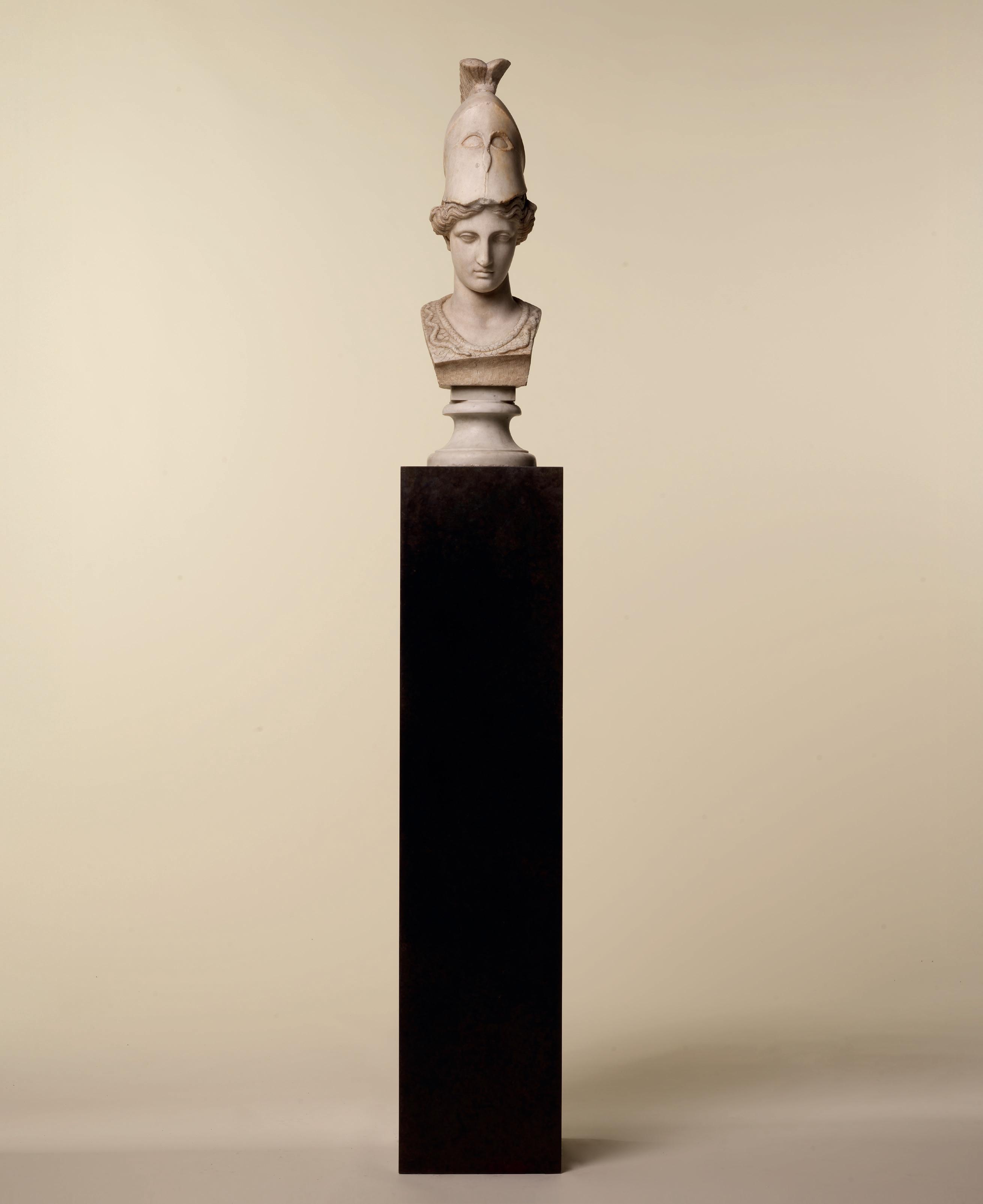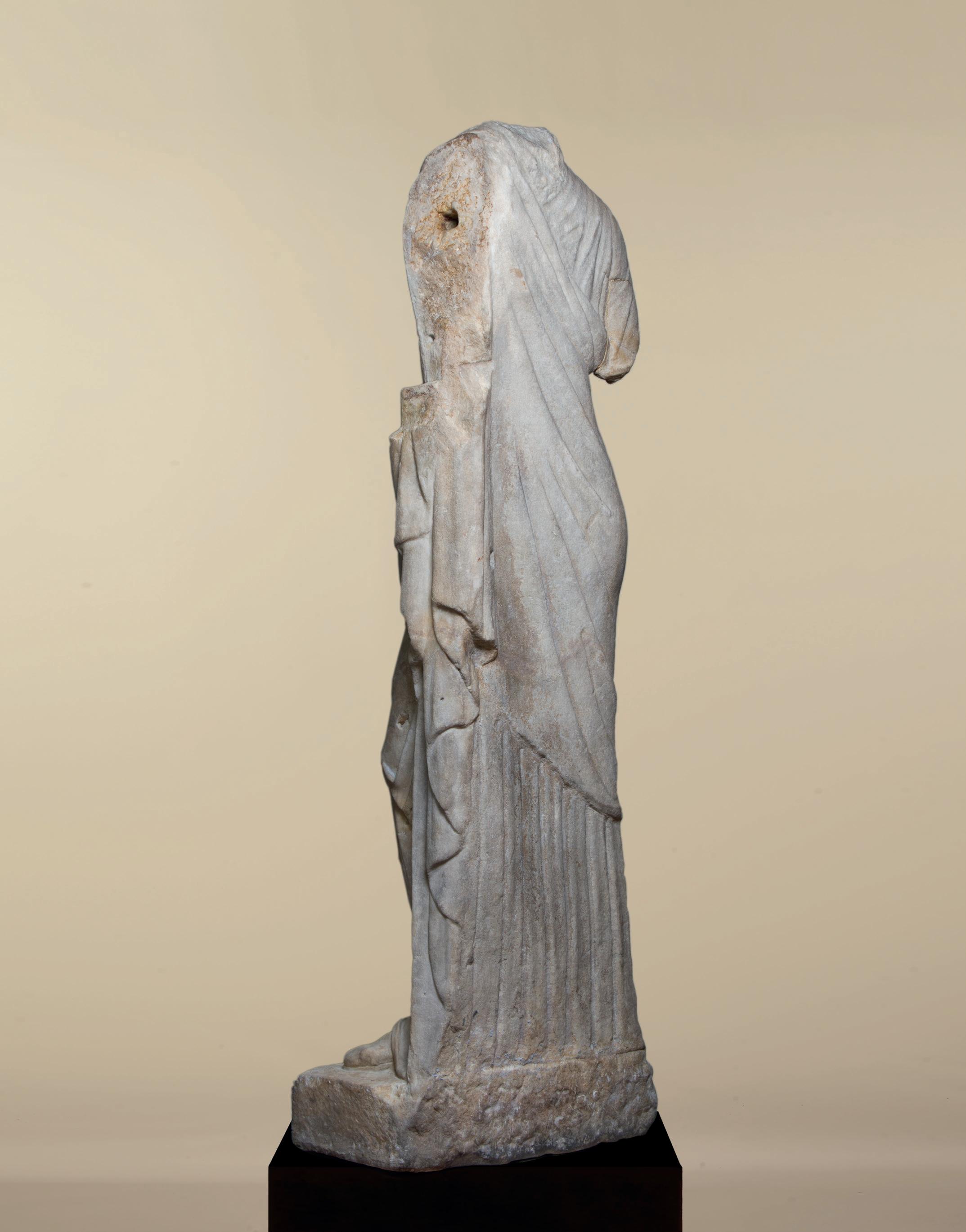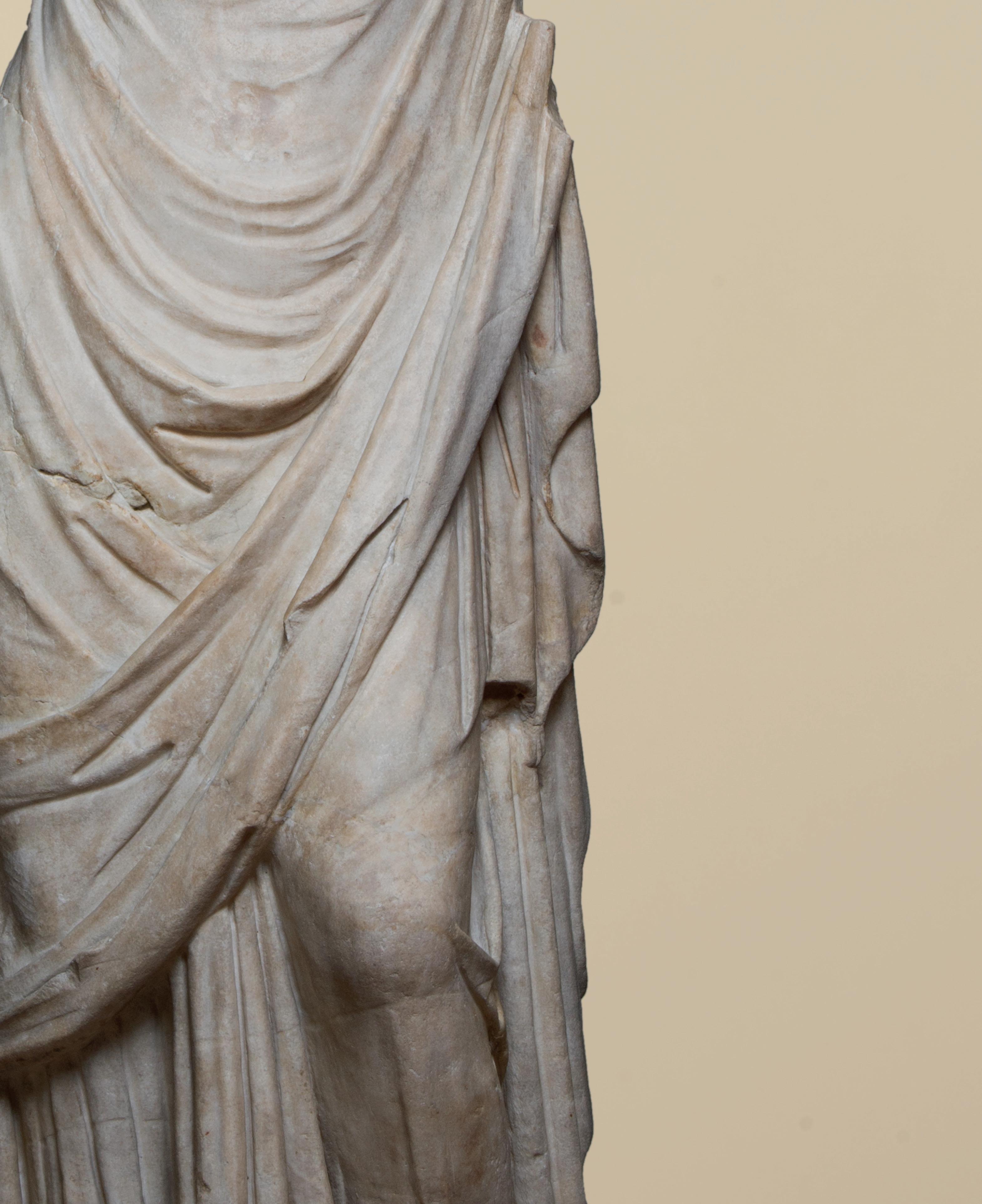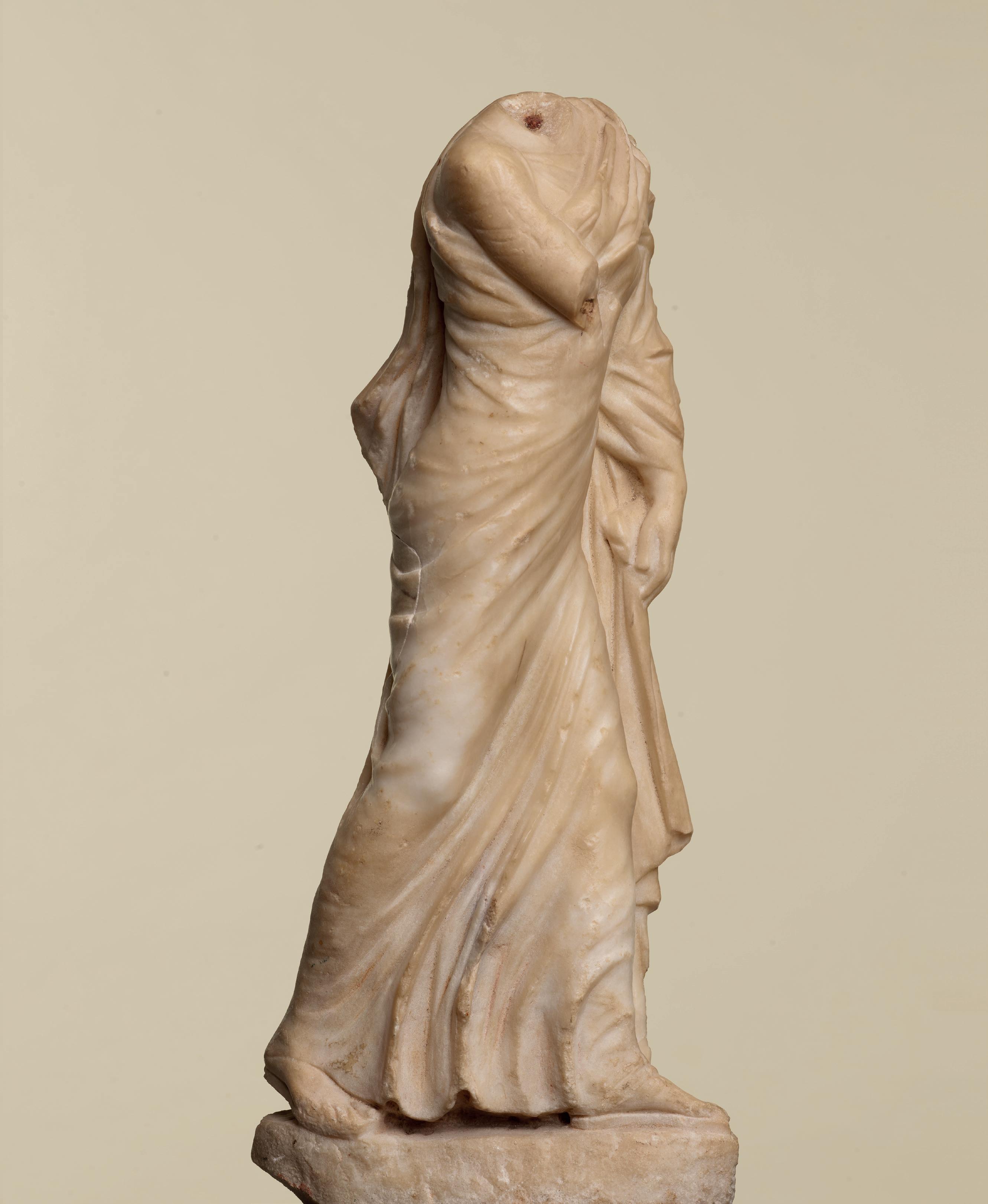 is wearing. It holds back the rest of Aphrodite’s hair, girding it in a play of texture and weight that distracts from the marble and gives the illusion that her hair is truly gripped by the adornment. A low chignon at the back of her head completes the structure of her hair and balances the whole look.This freestanding marble statue exhibits remarkable sculptural qualities. Although it is a reduced model, the firmness of its execution and the attention to detail are nothing less than striking, similarly to those of large scale statuary. Moreover, the contrast between the smooth, polished marble of the goddess’ flesh and the animated surface of her hair, in which the shiniest of the marble’s crystals resemble as many gems, attests to the artist’s technical mastery. The sculptor’s light, steady chiselling marvellously shaped the textures and contours of this celestial face. It bears the marks of centuries spent underground, such as the concretions that are still visible today. The nose and chin attest to its material history. Apart from its aesthetic qualities, this work is also an archaeological relic, a historical testament to a lost civilisation.