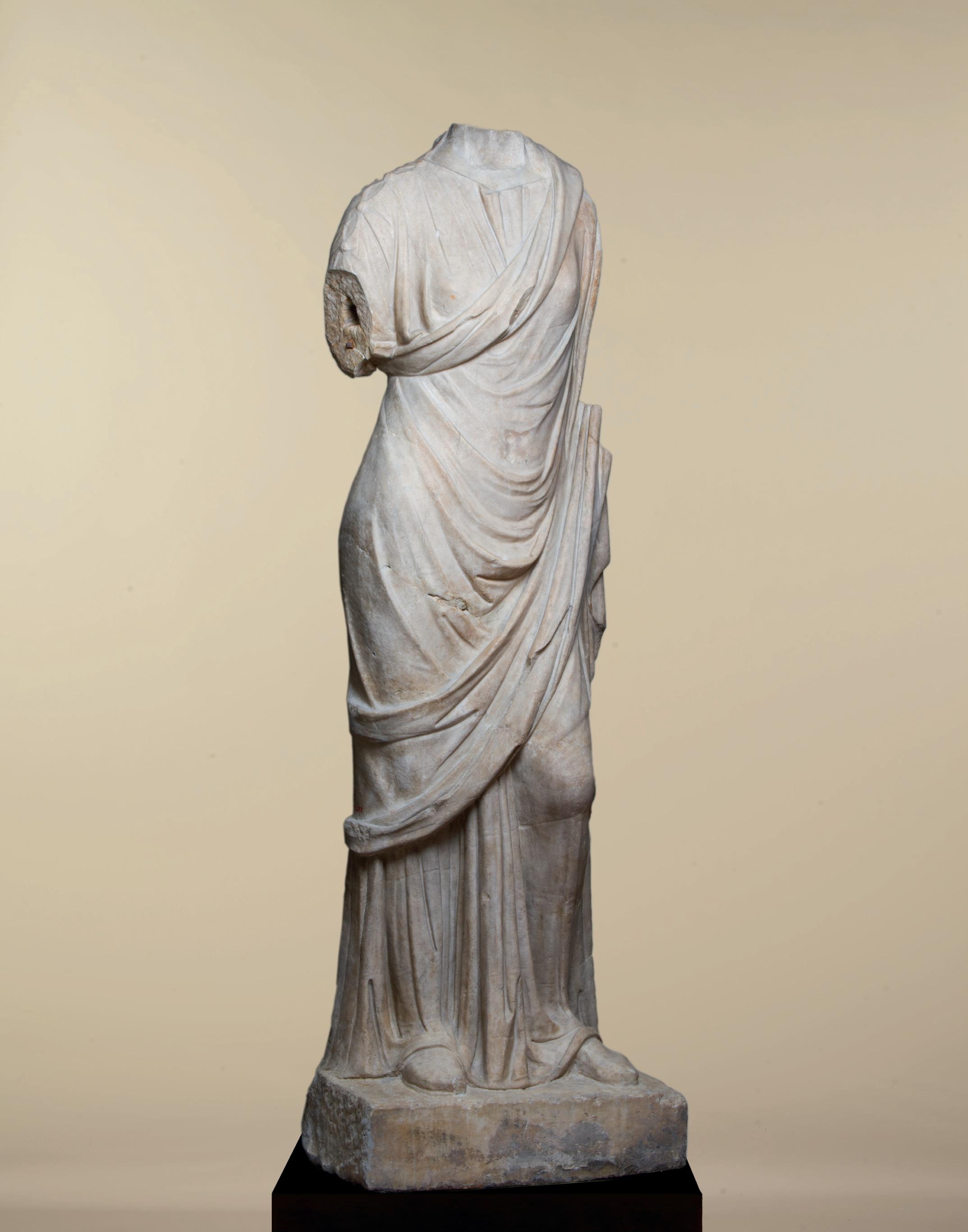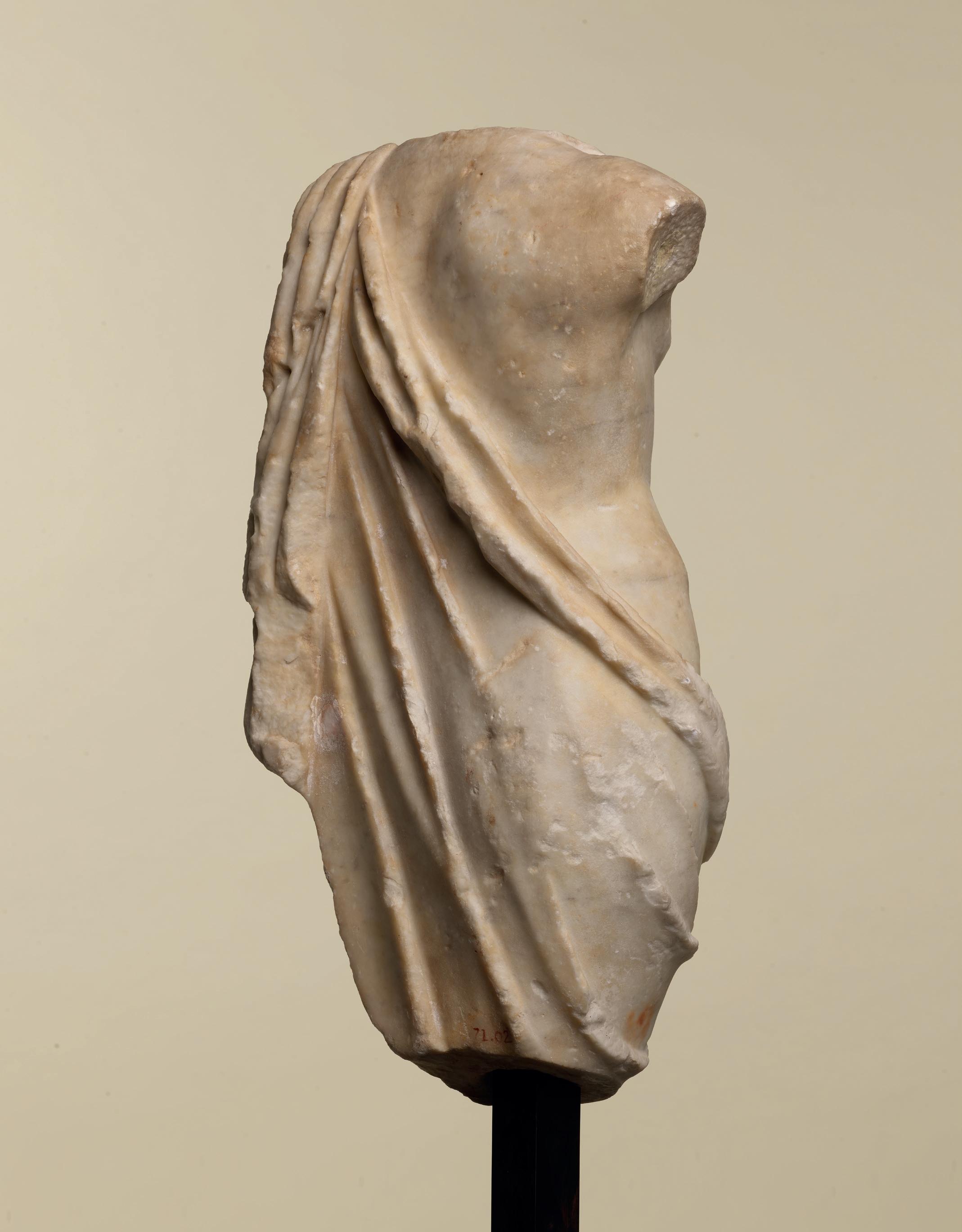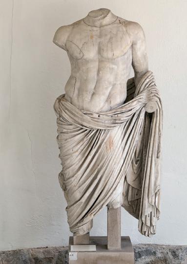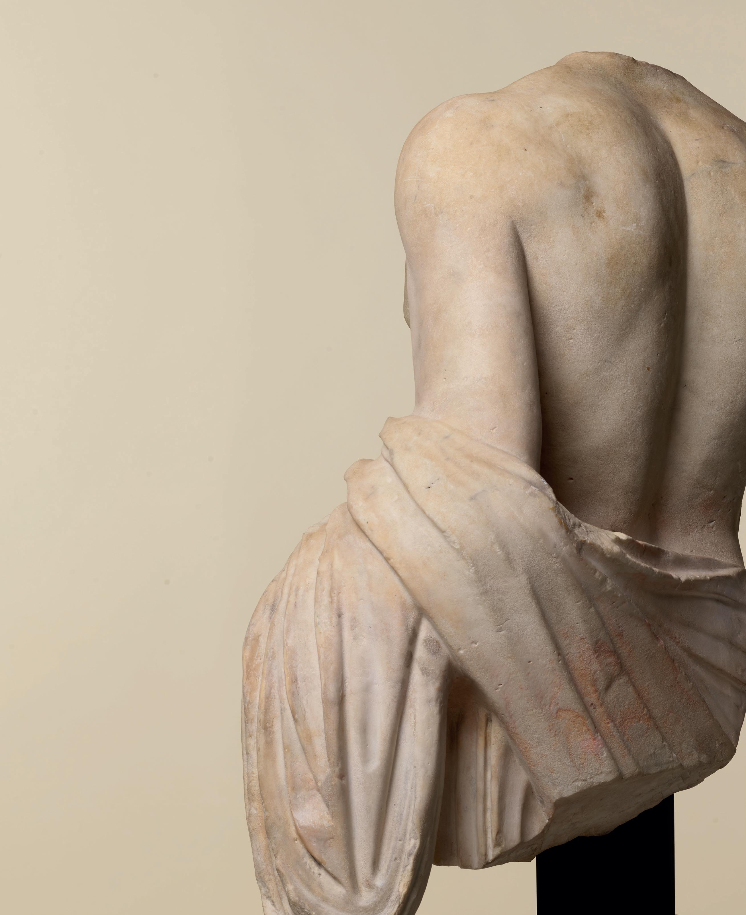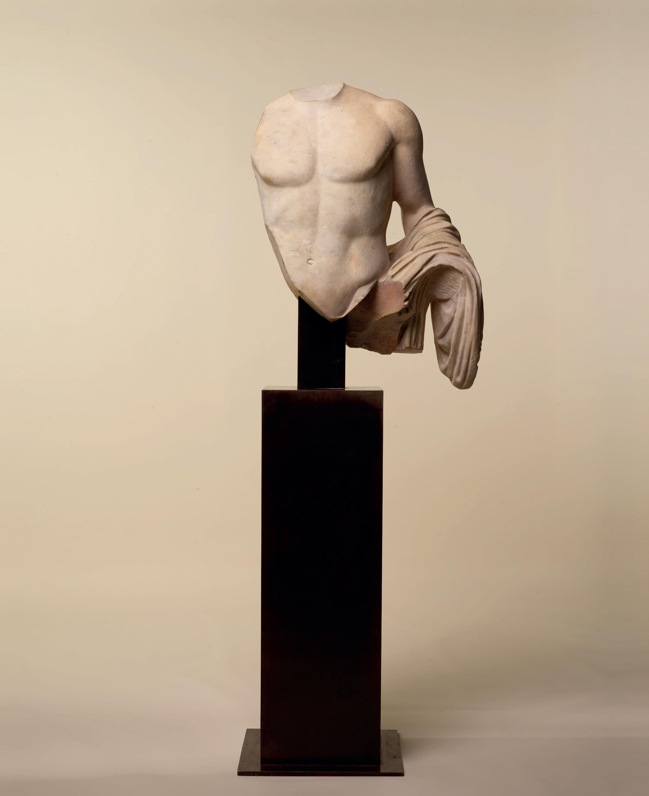 fabric closely hugs the shapes of his body, creating a kind of textural rhythm and hinting at the position of his legs underneath. One is straight, the other bent. Although his arms are now missing, their positions can partly be guessed. The right arm, most likely slightly raised, must have been performing some kind of action – perhaps holding an attribute – while his left arm, more relaxed, seems to have rested along his flank. The quality with which his muscles were represented truly makes this bust stand out. His pectorals are prominent and well defined while a central vertical line, running from his neck to his navel, follows the axis of the body and accentuates