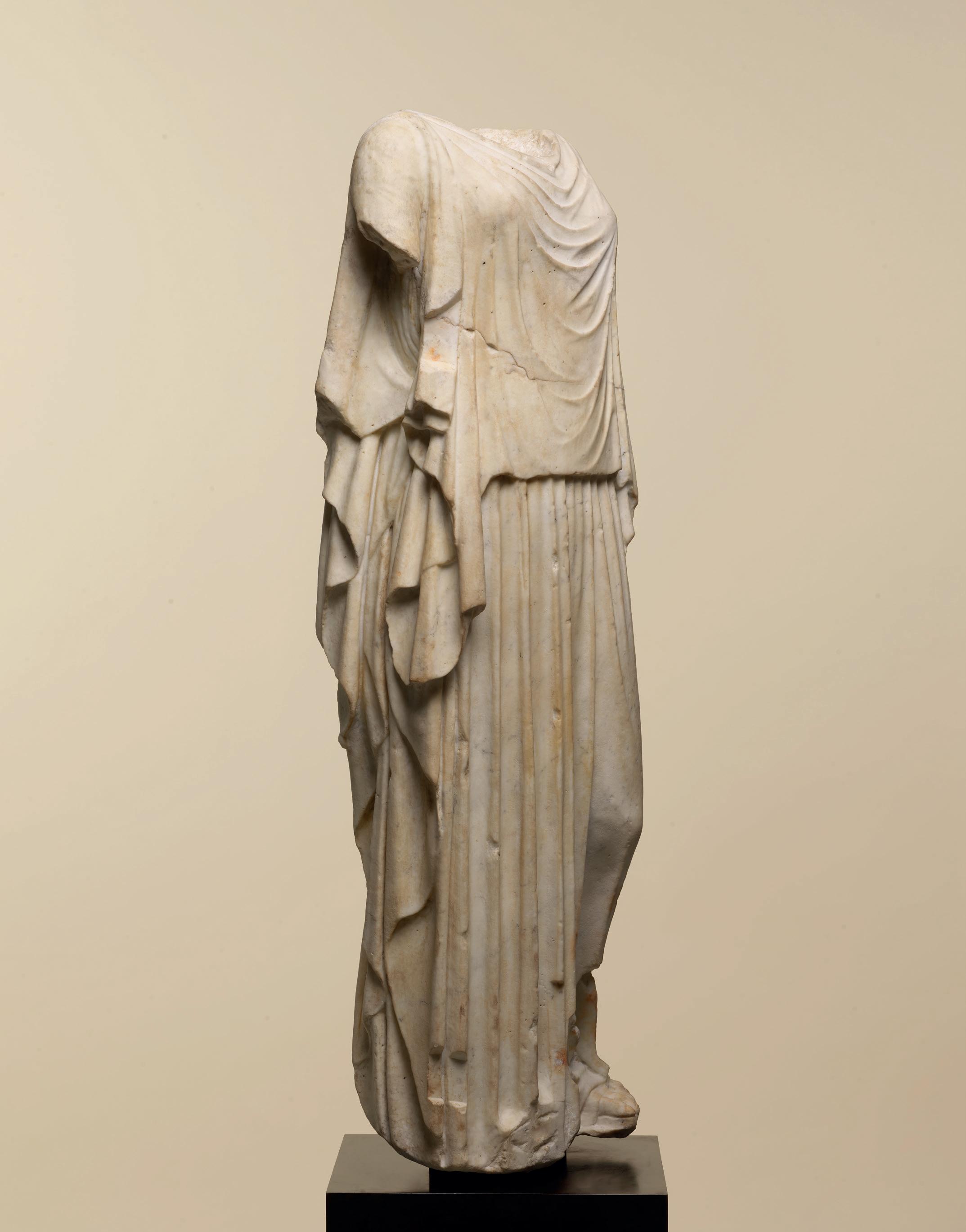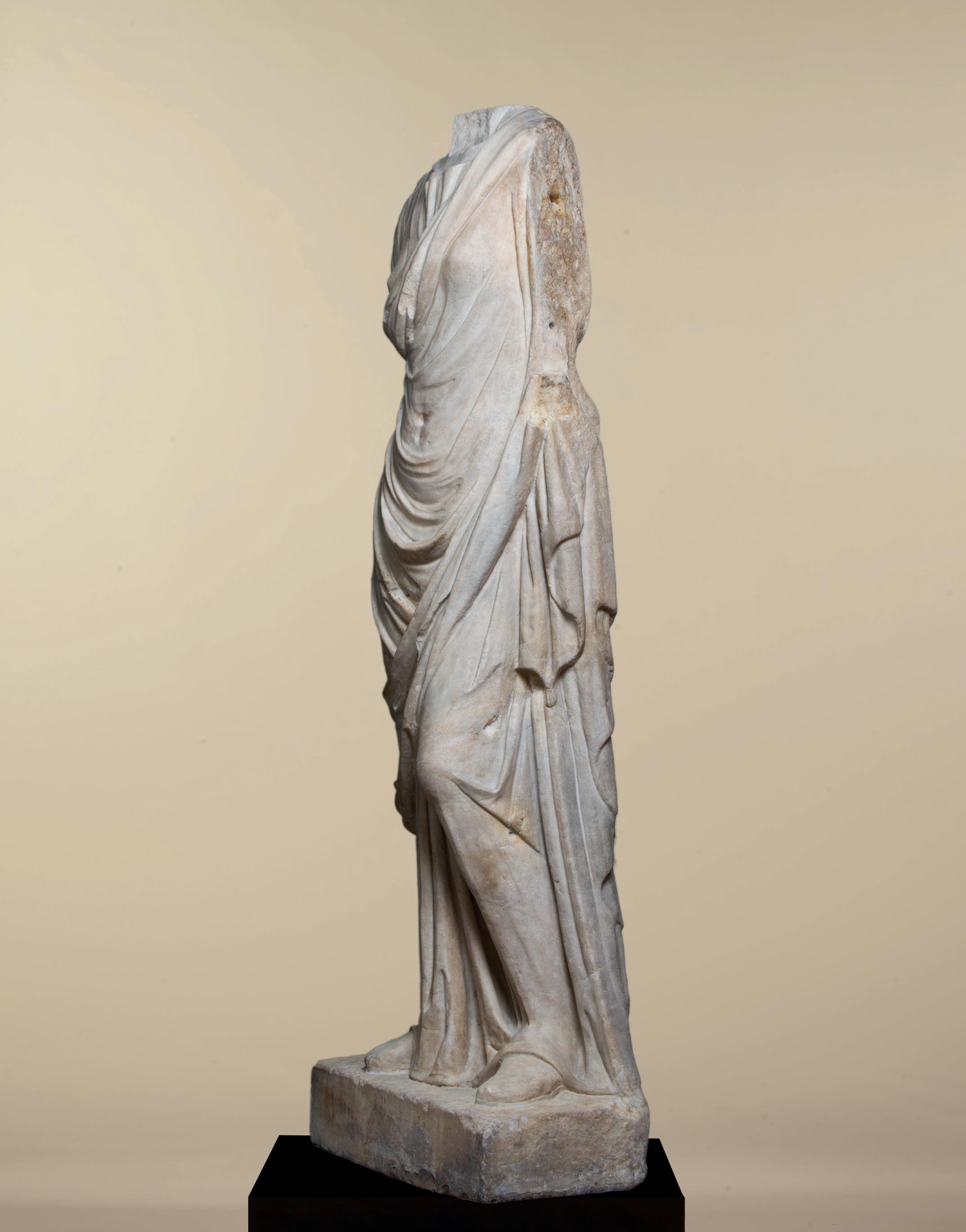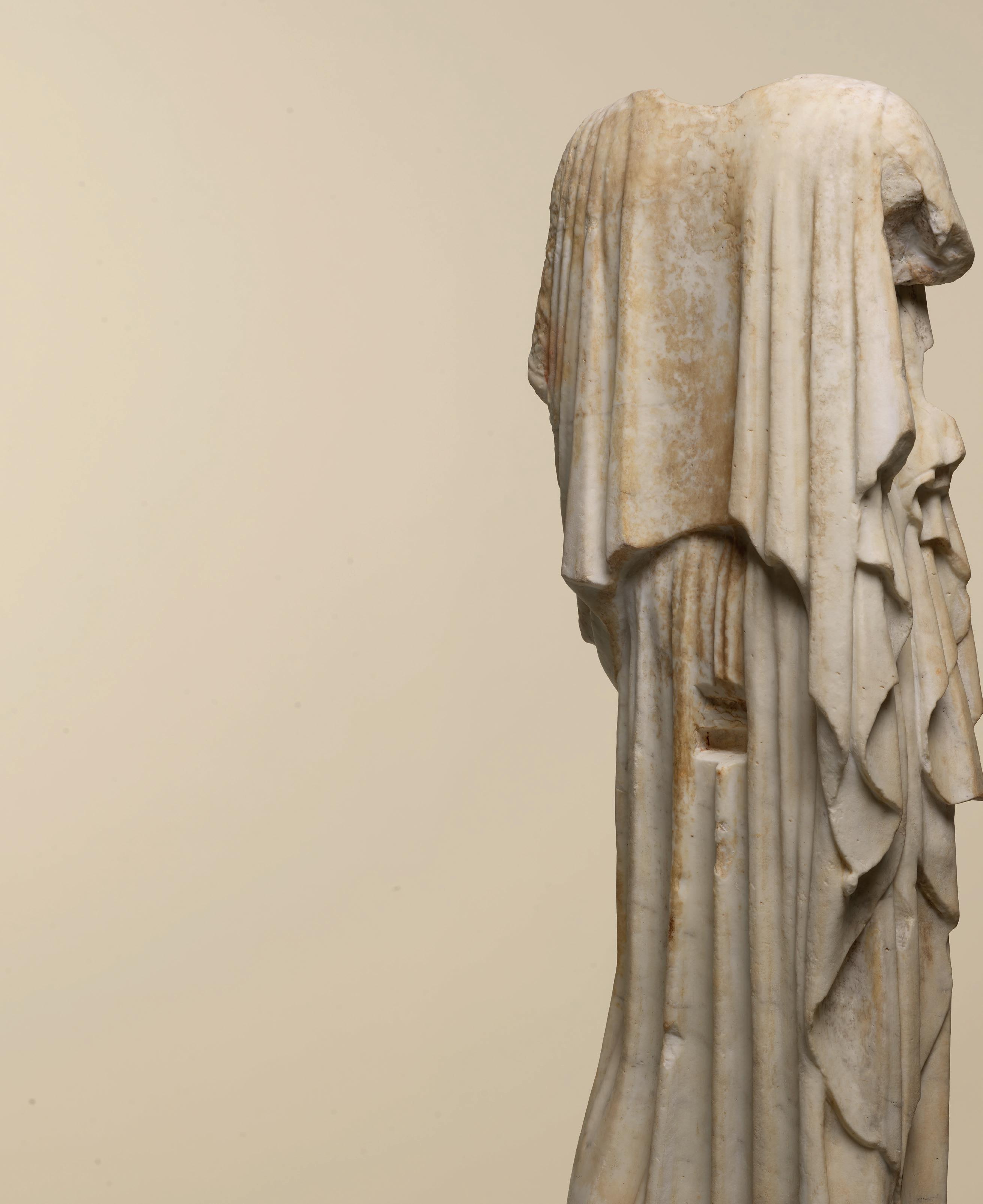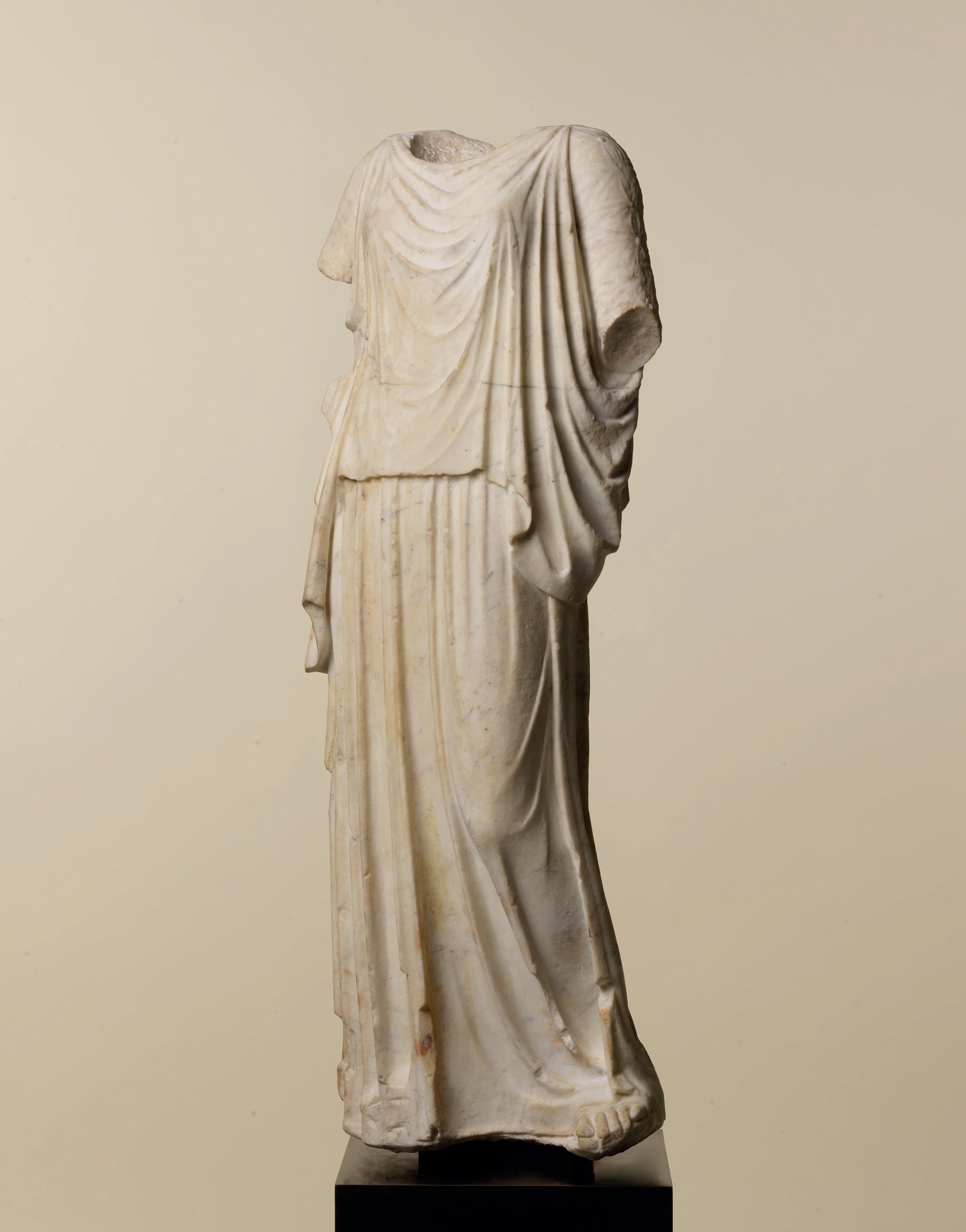 fabric closely hugs the shapes of his body, creating a kind of textural rhythm and hinting at the position of his legs underneath. One is straight, the other bent. Although his arms are now missing, their positions can partly be guessed. The right arm, most likely slightly raised, must have been performing some kind of action – perhaps holding an attribute – while his left arm, more relaxed, seems to have rested along his flank. The quality with which his muscles were represented truly makes this bust stand out. His pectorals are prominent and well defined while a central vertical line, running from his neck to his navel, follows the axis of the body and accentuates