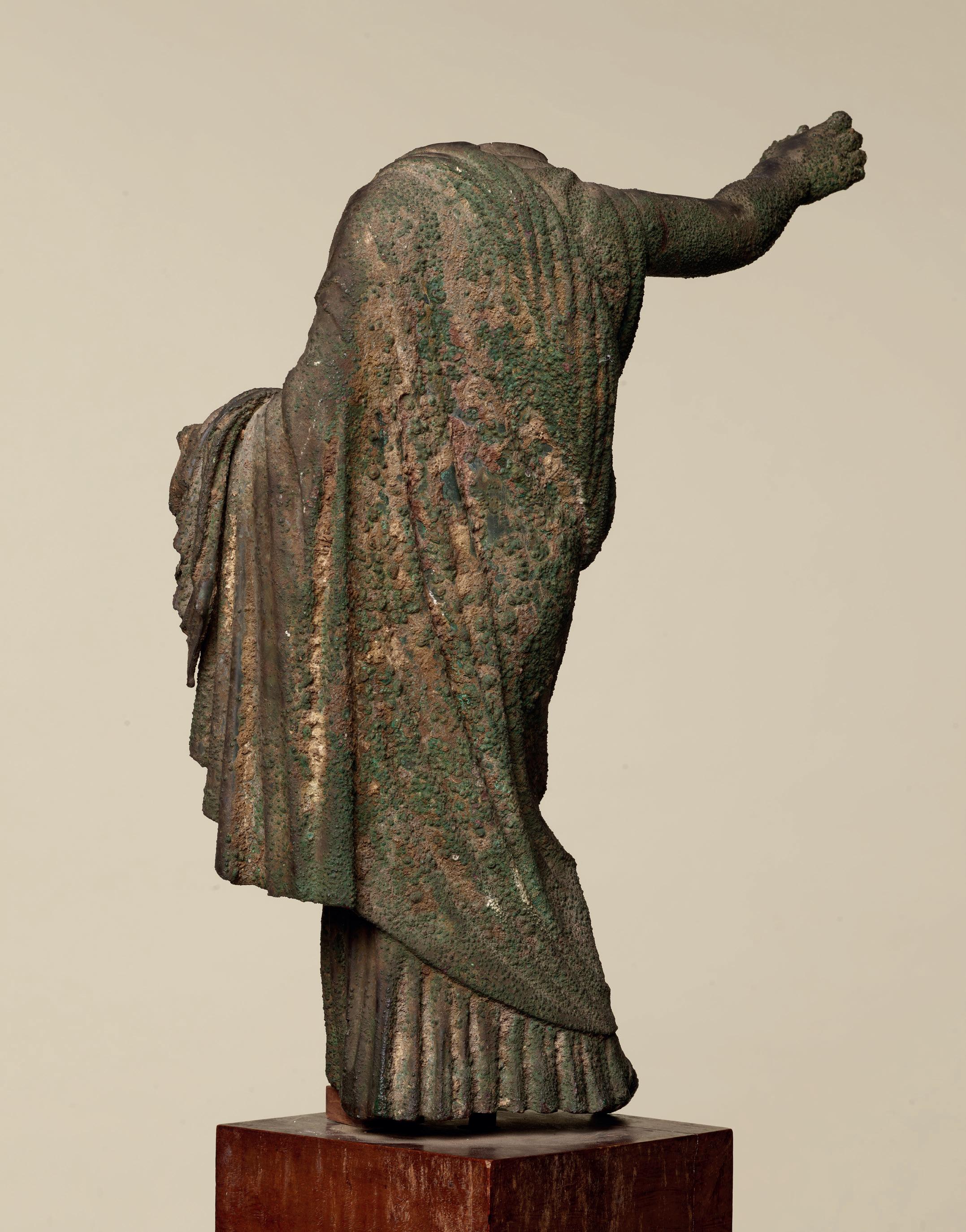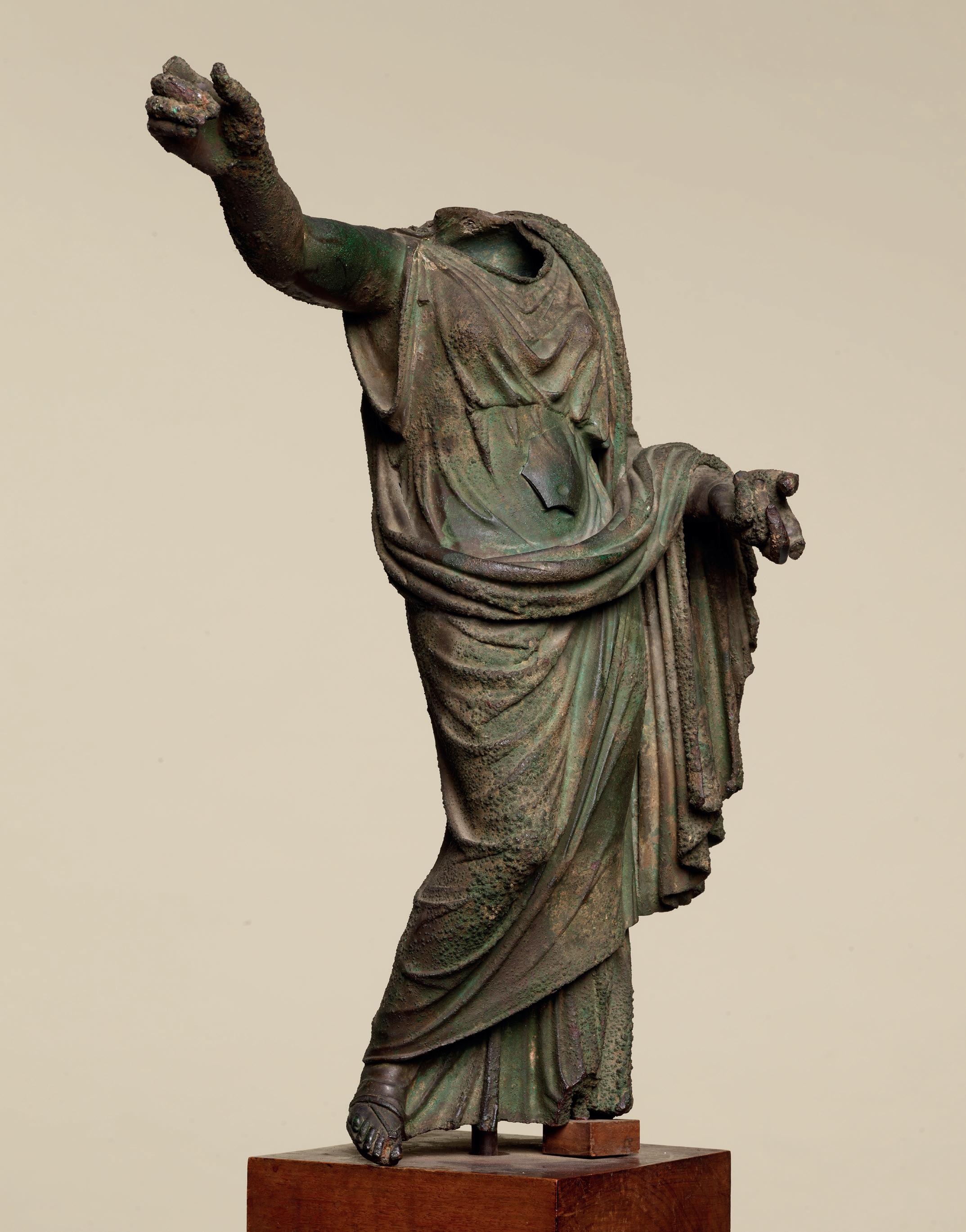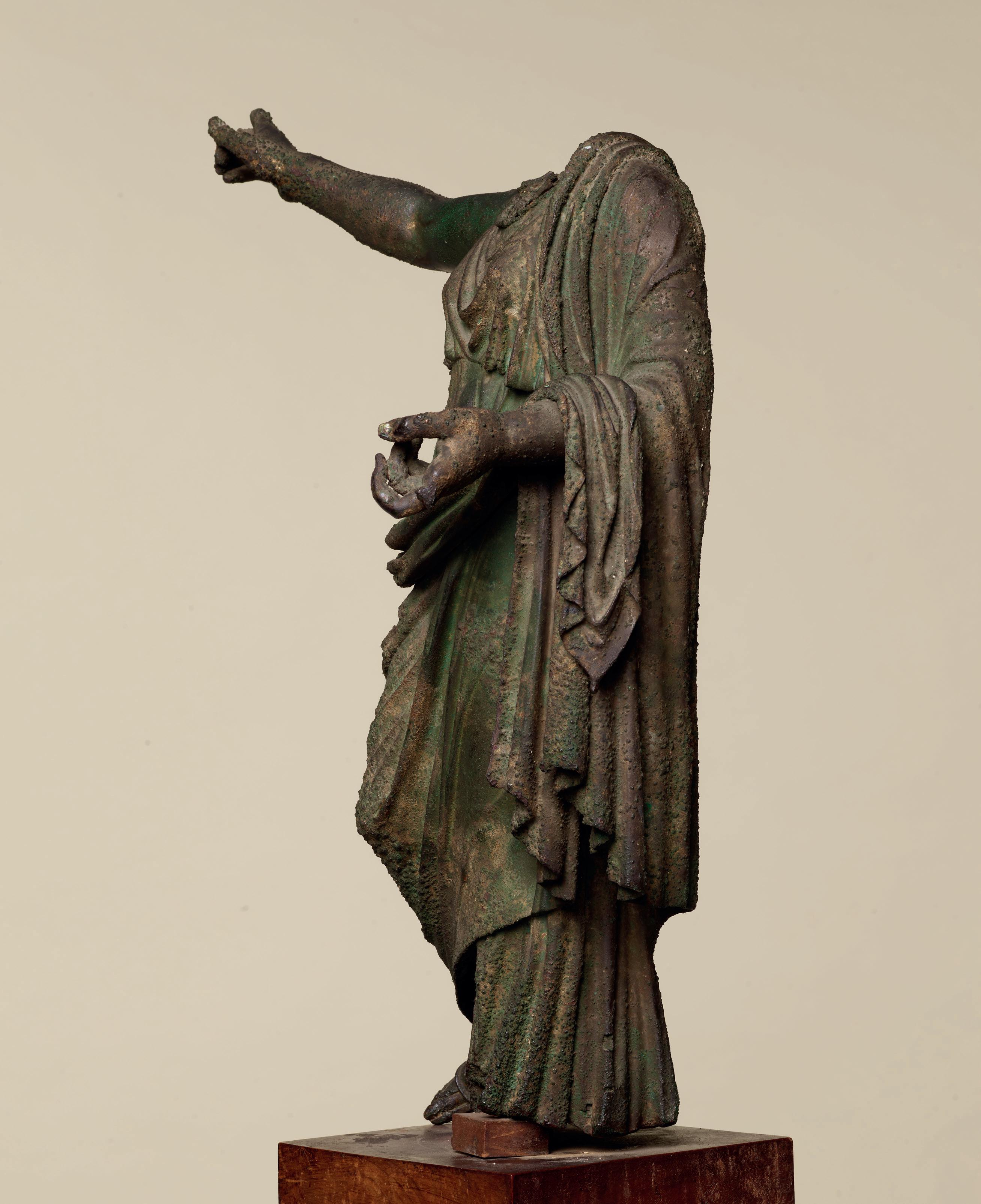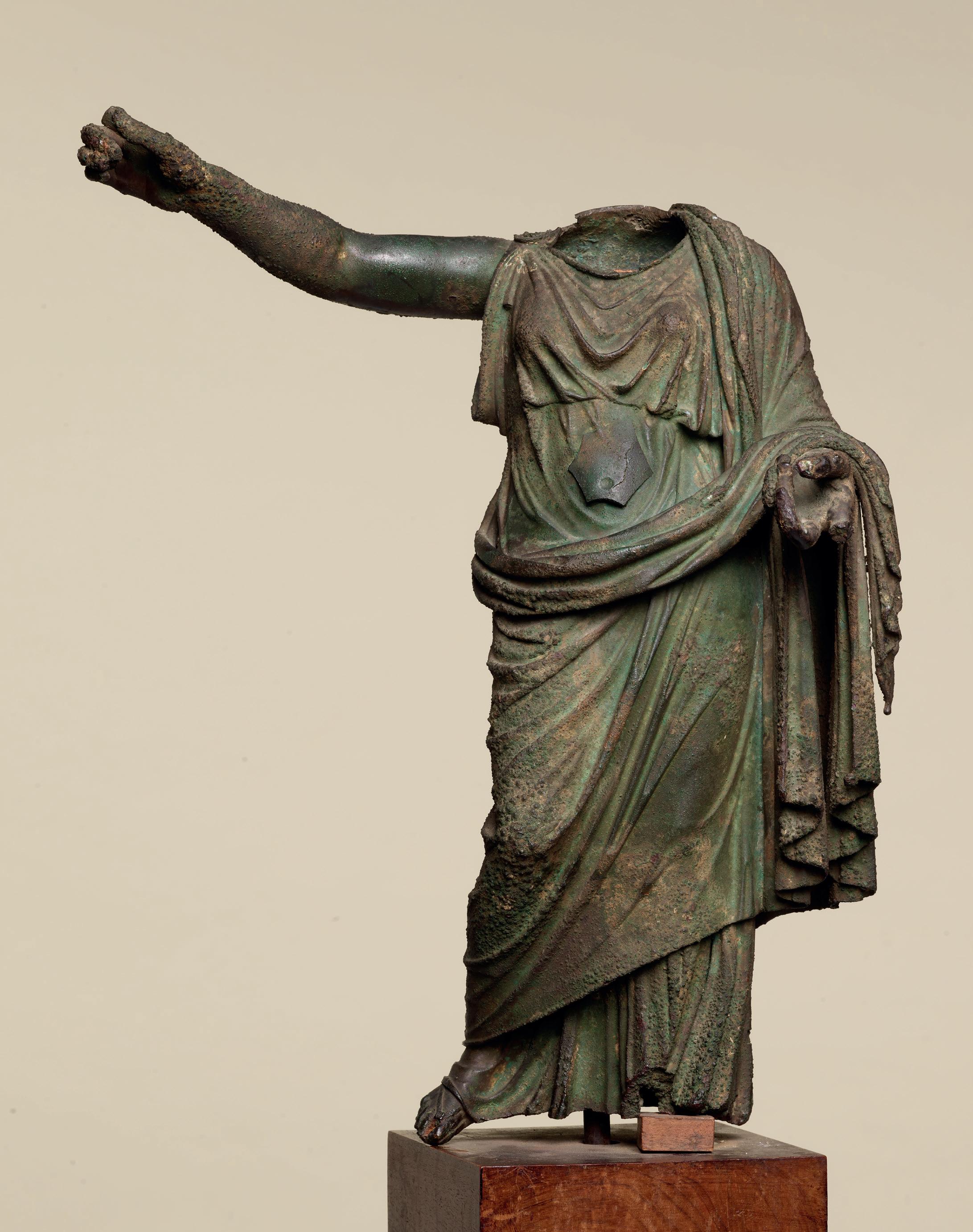 fabric closely hugs the shapes of his body, creating a kind of textural rhythm and hinting at the position of his legs underneath. One is straight, the other bent. Although his arms are now missing, their positions can partly be guessed. The right arm, most likely slightly raised, must have been performing some kind of action – perhaps holding an attribute – while his left arm, more relaxed, seems to have rested along his flank. The quality with which his muscles were represented truly makes this bust stand out. His pectorals are prominent and well defined while a central vertical line, running from his neck to his navel, follows the axis of the body and accentuates