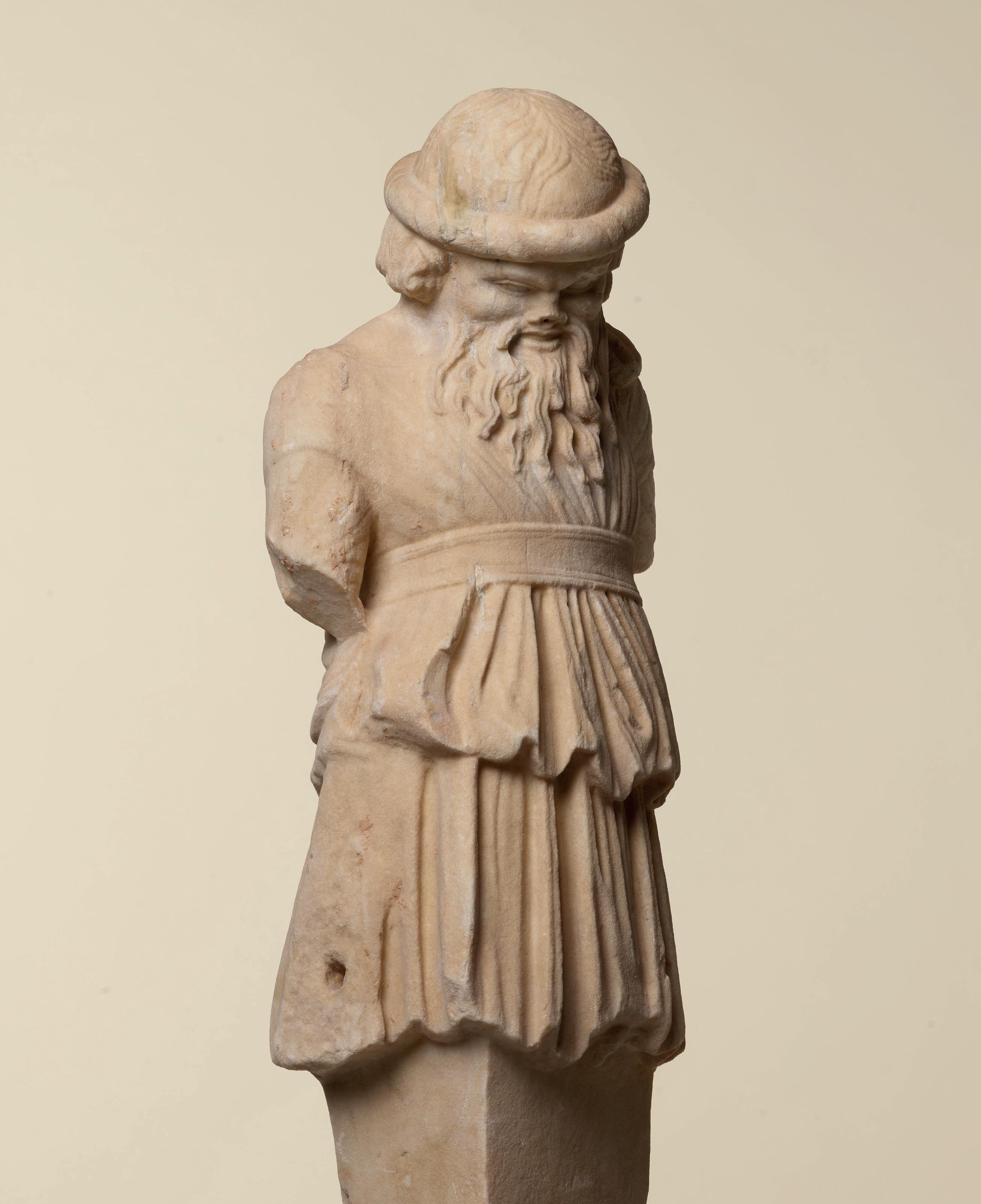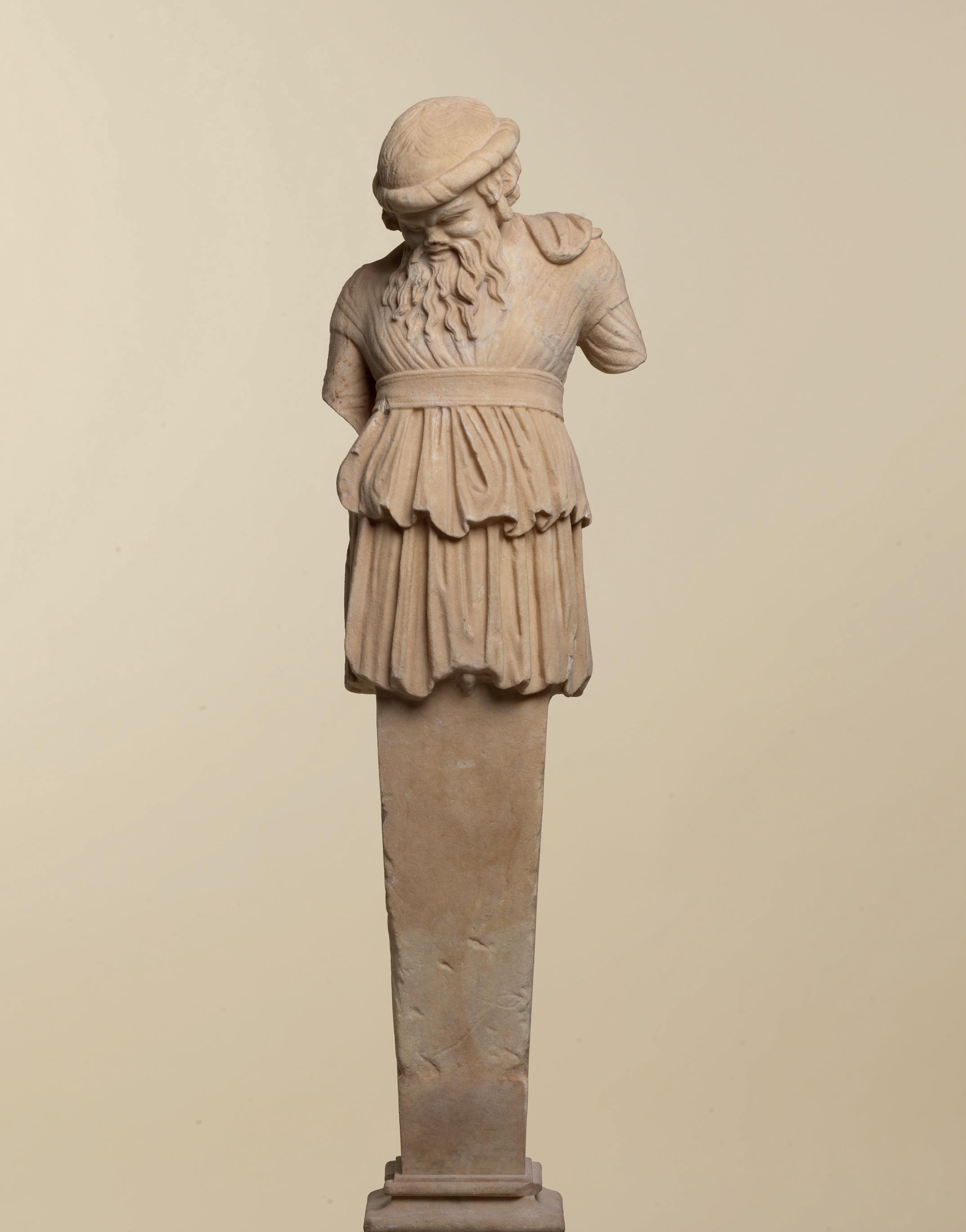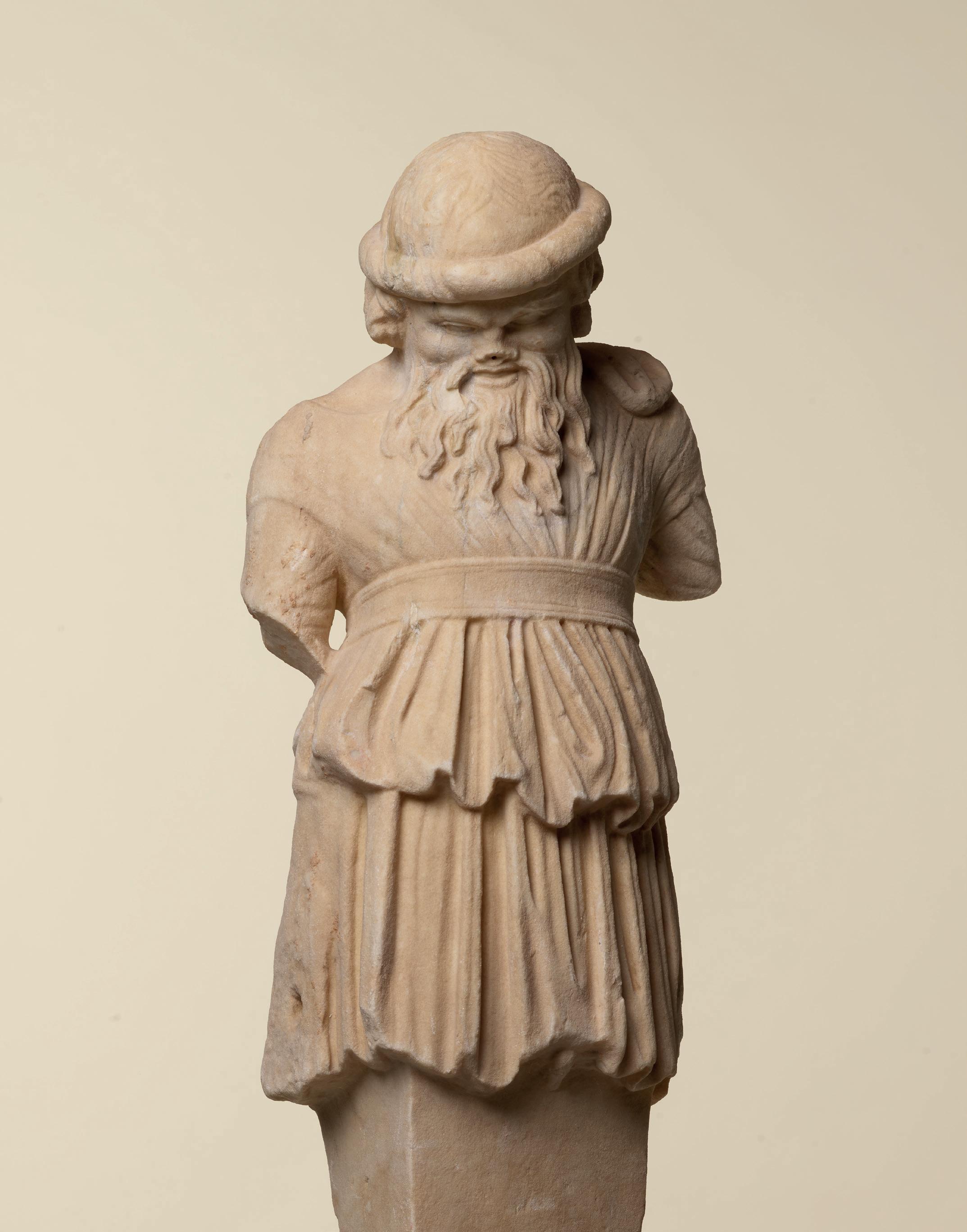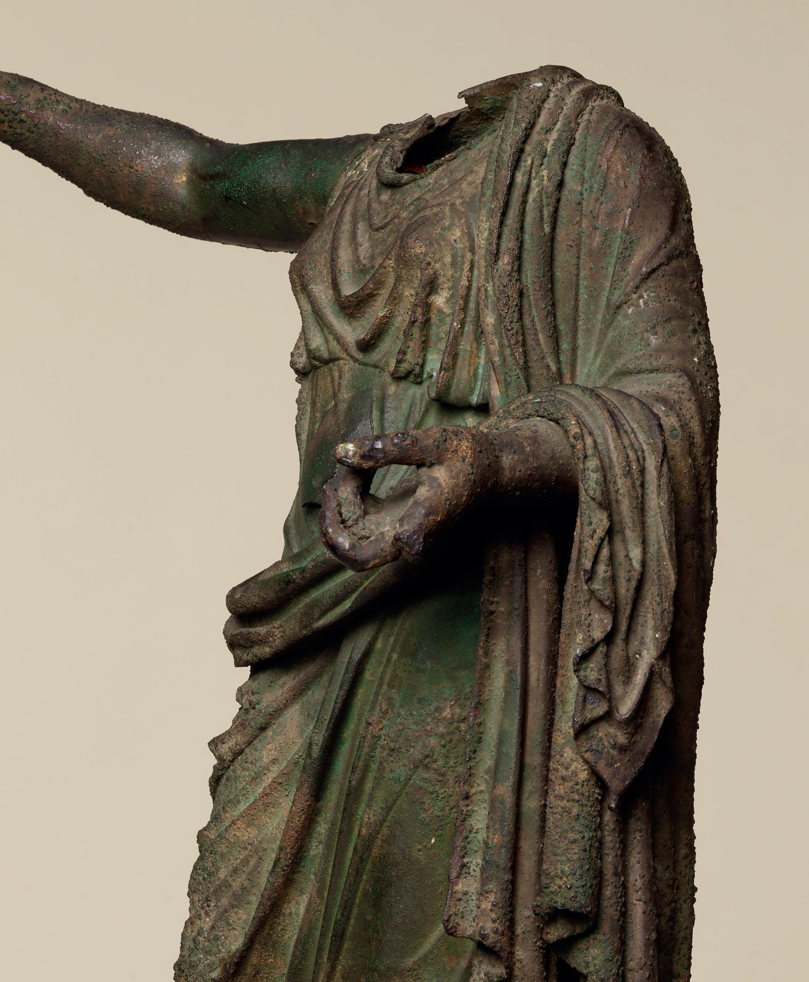 fabric closely hugs the shapes of his body, creating a kind of textural rhythm and hinting at the position of his legs underneath. One is straight, the other bent. Although his arms are now missing, their positions can partly be guessed. The right arm, most likely slightly raised, must have been performing some kind of action – perhaps holding an attribute – while his left arm, more relaxed, seems to have rested along his flank. The quality with which his muscles were represented truly makes this bust stand out. His pectorals are prominent and well defined while a central vertical line, running from his neck to his navel, follows the axis of the body and accentuates