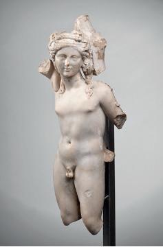 By its formal and stylistic characteristics, this torso is in line with traditional imperial Roman statuary from the 1st or 2nd century AD. The lack of preserved attributes makes it difficult to precisely identify the figure. However, several iconographic clues – the draping of the chlamys, the youthfulness of the body, the elegance of the contrapposto and the softness of the sculpting – point to it being a representation of Apollo or Dionysus, who were both frequently depicted as young, beardless men with lithe, idealised bodies, sometimes simply clothed in a chlamys and adorned with now missing attributes (lyre, thyrsus, ivy wreath, etc.). The fine grained, slightly shiny marble exhibits a brown patina that attests to the passing of time.