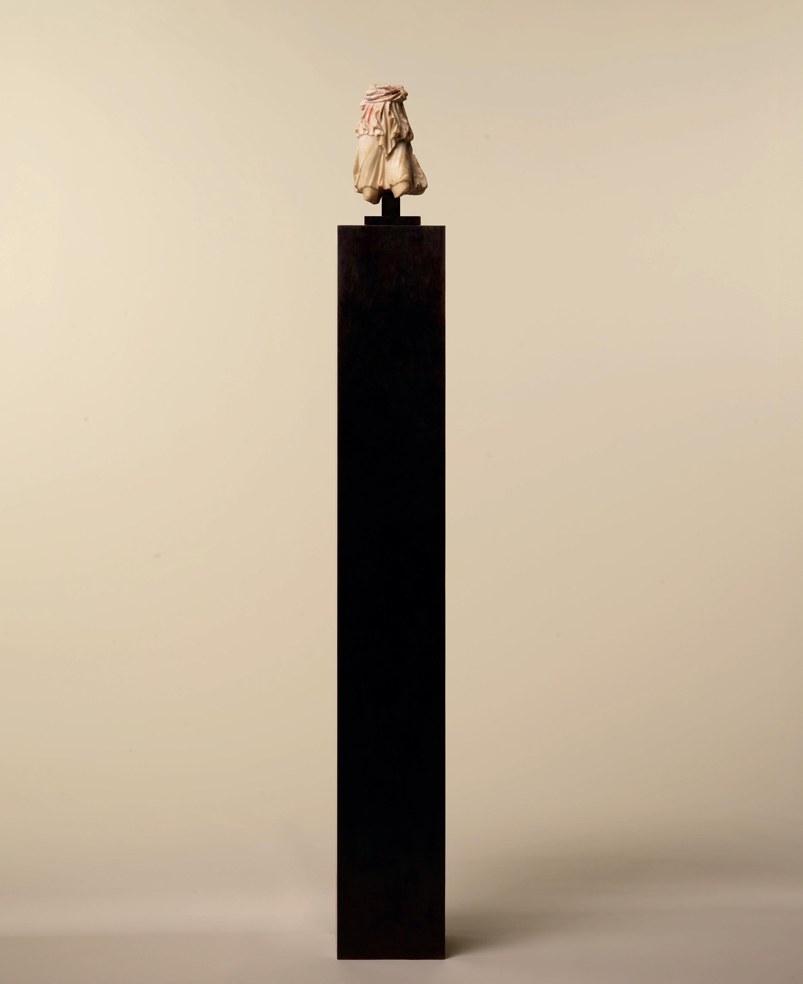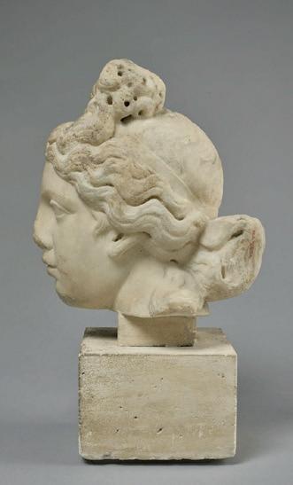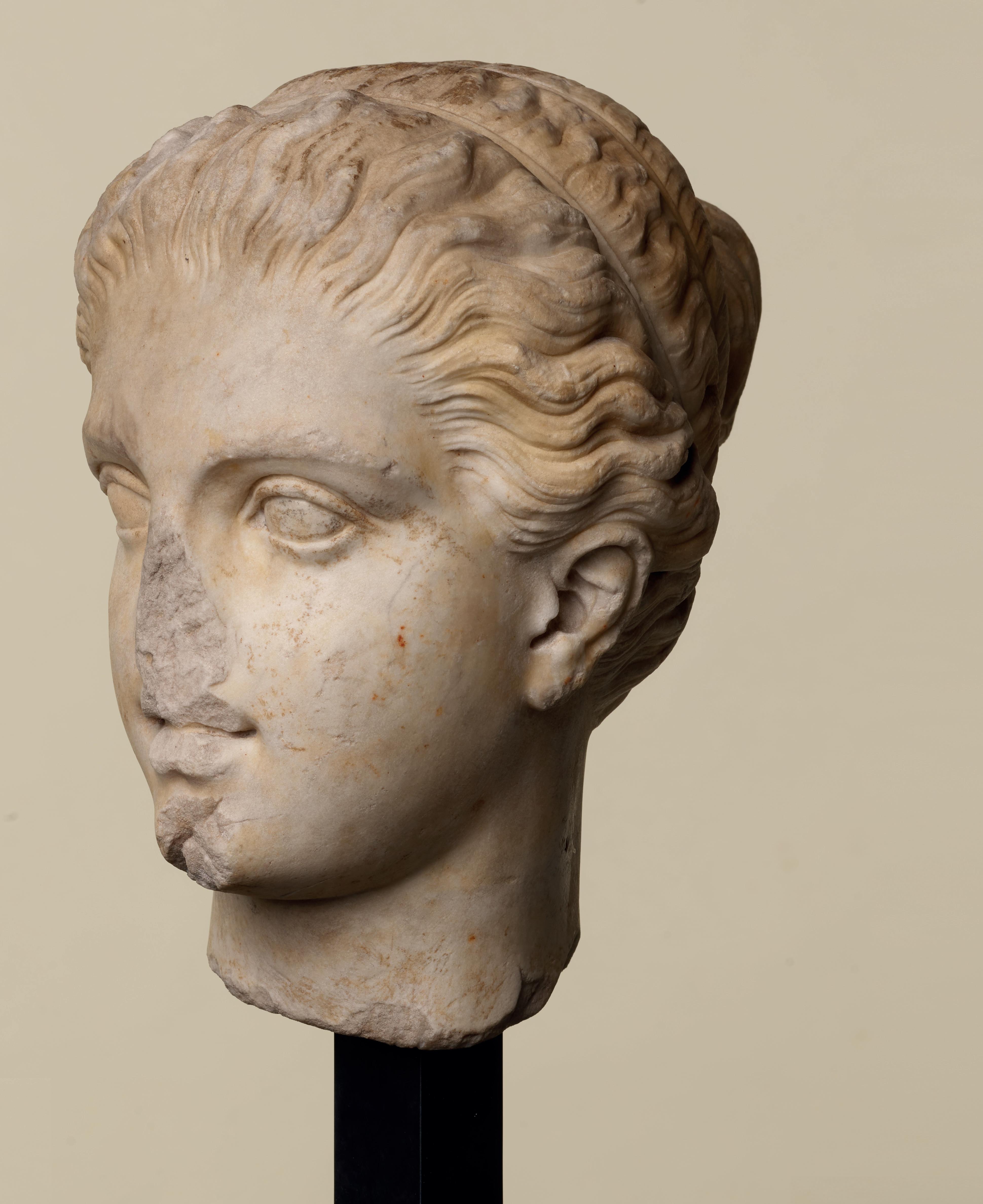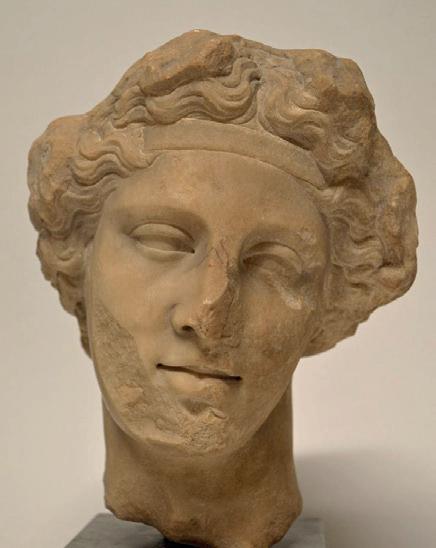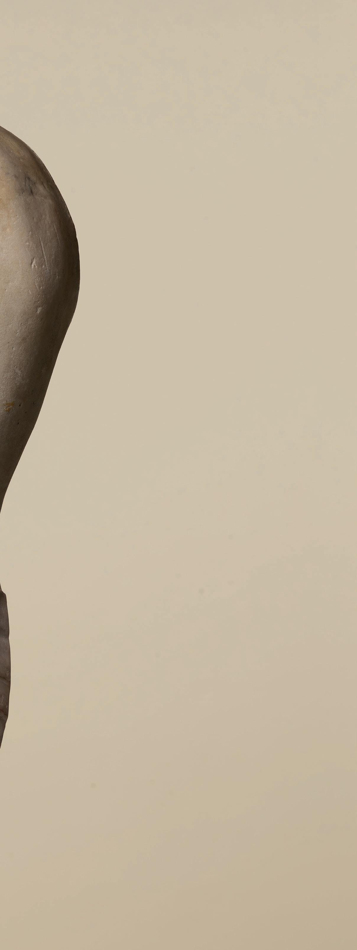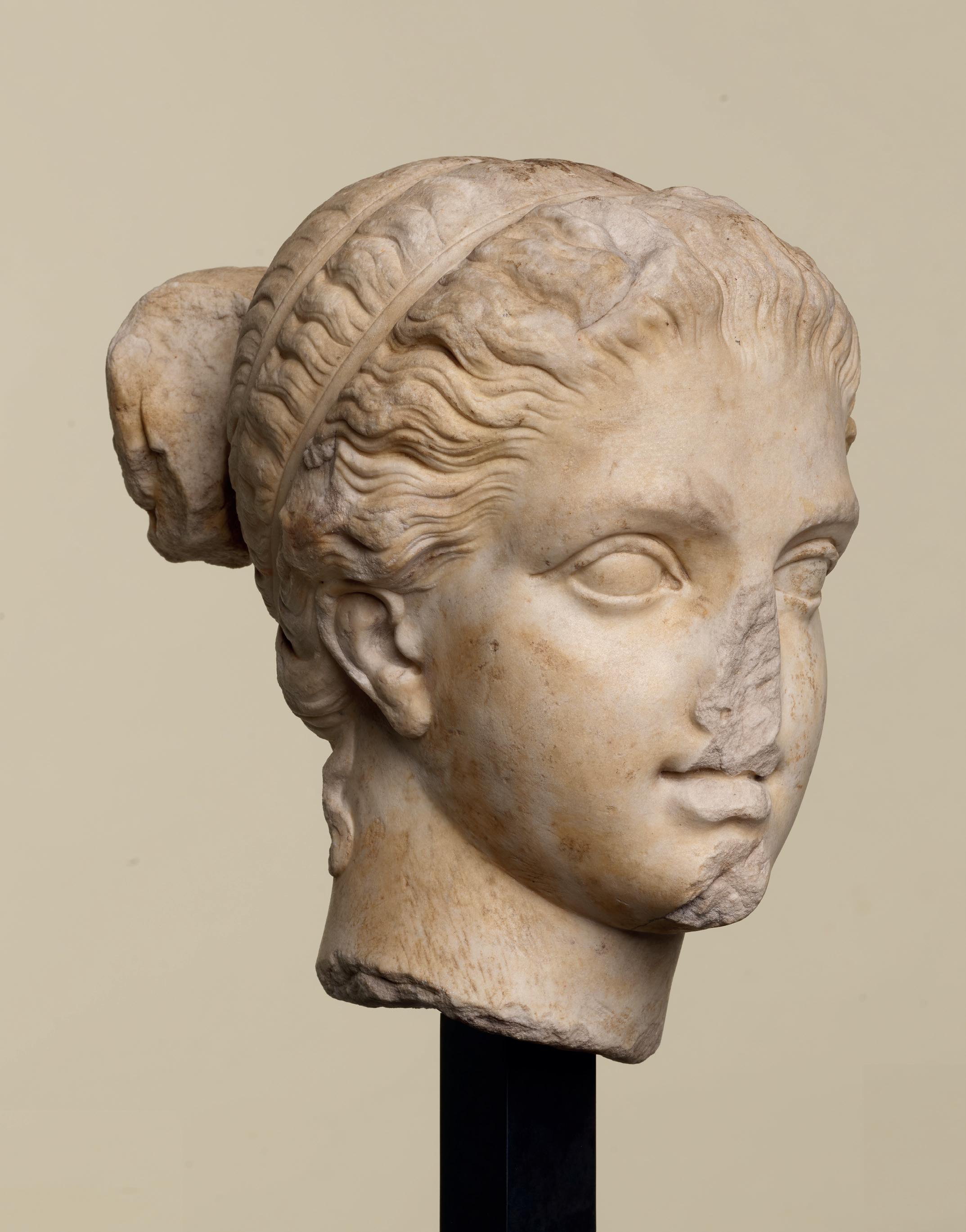 exercise the full range of their technical skill by using effect after effect. On the top of her head, the hair is simply engraved with crisscrossing locks, then it is sculpted in slight waves framing her face and, finally, a chisel was used to form the deepest curls. At the top of her forehead, one lock has escaped her ribbon, genuinely appearing to be compressed by it, which attests to the talent of the sculptor, who was able to imbue the marble with the suppleness of hair. The hectic appearance of the hair, its vigorous treatment and the resulting play of light and shadow frame the face and enhance its plastic beauty. The sculpting of the marble, the brilliance of the contrasts and the delicacy of the expression reveal the exceptional mastery of the artist who created this work. Past centuries have left their mark on the face of this eternal young girl. Some chips thus attest to that material history. Its burial left a web of maculae on the white surface of the marble – the wrinkles of this puella, who slumbered underground for over a millennium and is now awake before our eyes. That patina further enriches the perception of our work and imbues it with a distinct melancholy, which resonates with her enigmatic gaze.