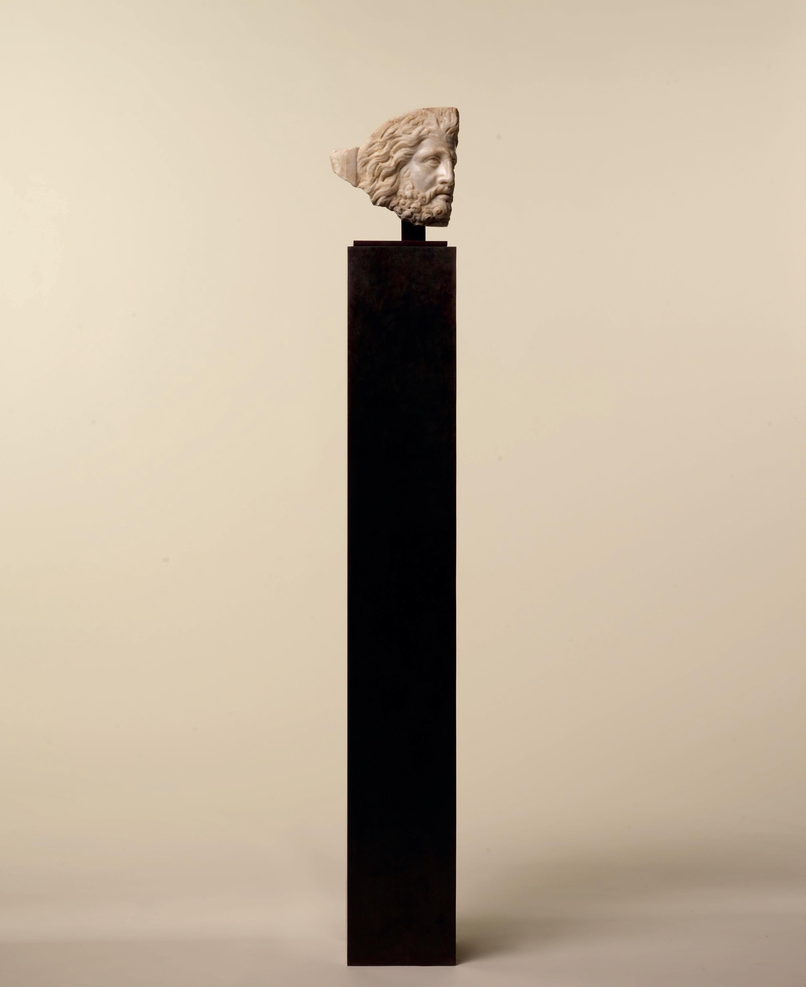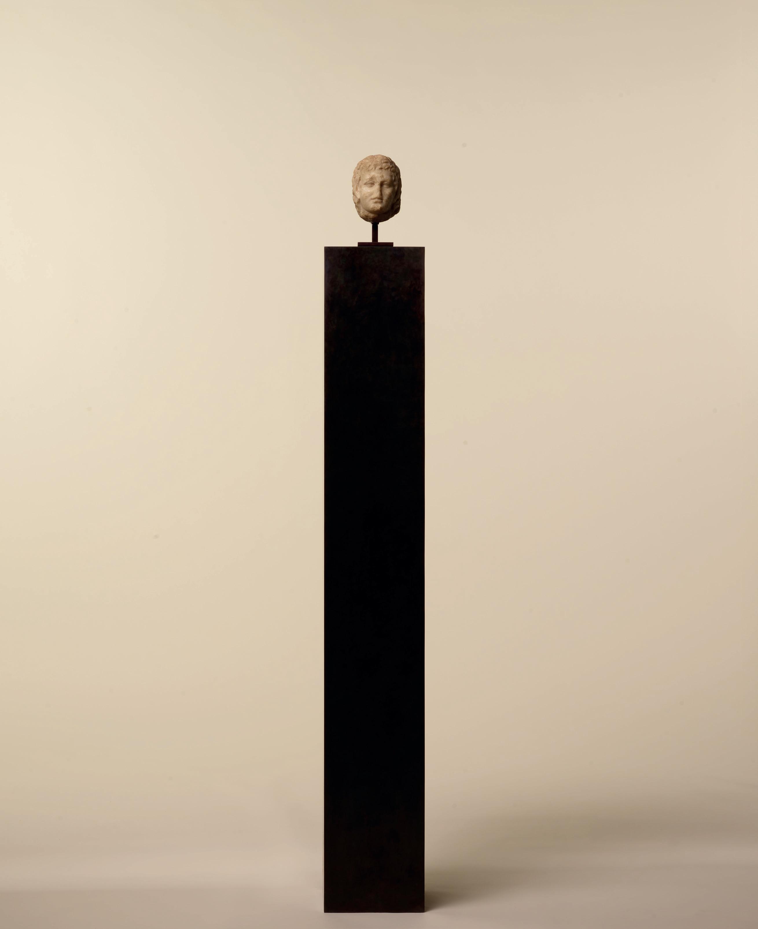 Our satyr displays a rather even brown patina, denoting the age of the piece, and, through the slight traces of erosion, emanates a mysterious aura. The care with which the face and hair were shaped and the quality of the marble attest to the mastery of the sculptor and the prestige of this small, sculpted fragment.