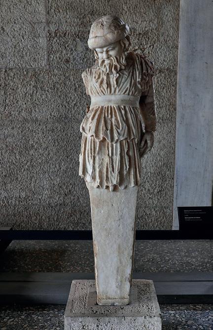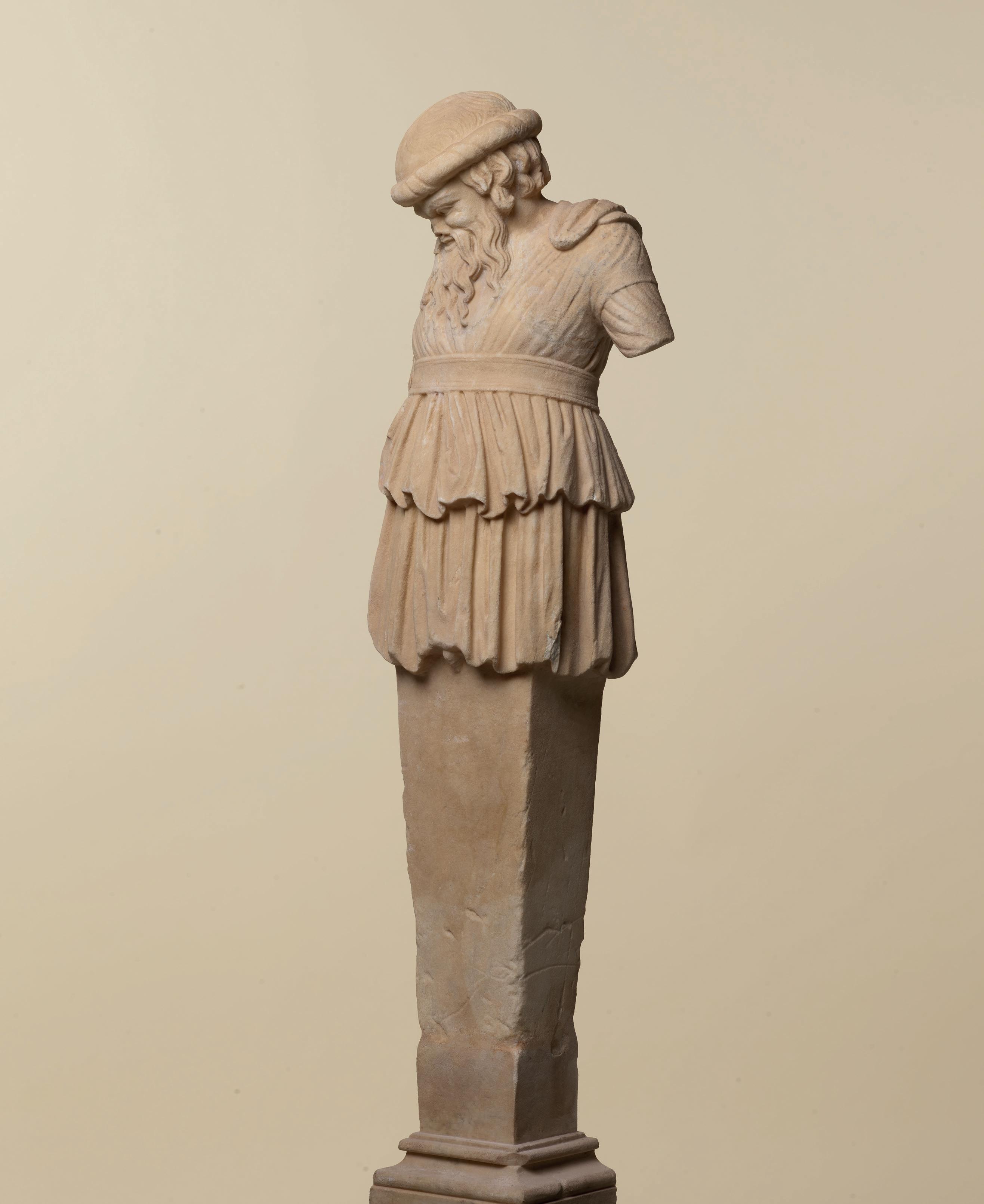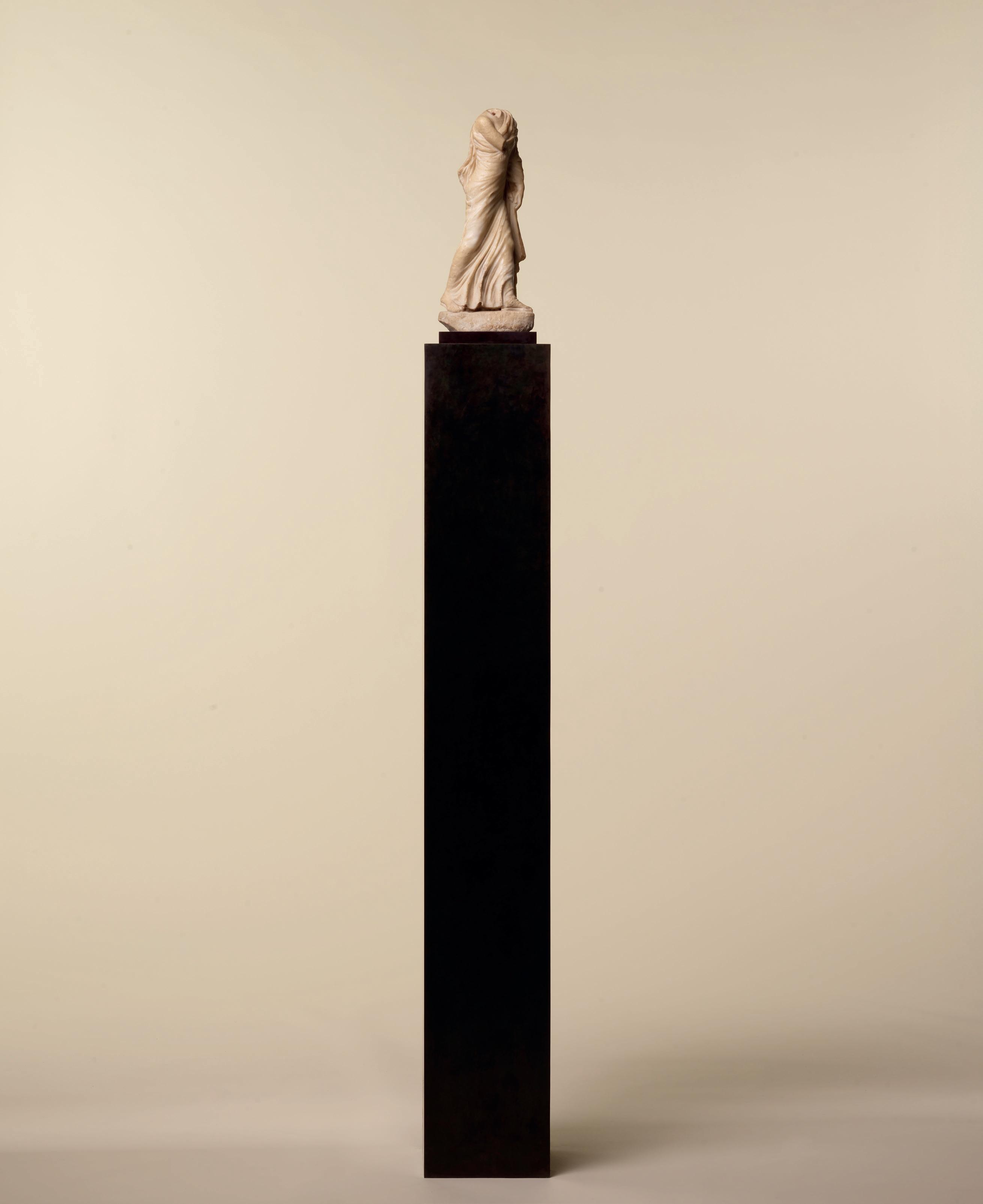 Cult object, familial portrait, object of private devotion or deity, the precise function of such a sculpture is difficult to gauge, defies categorical interpretation and seems to escape us, all the more so as that sculpture is fragmentary. Its middling dimensions suggest a domestic work. More interesting still is its archaistic treatment. The rendering of the hair is inspired by Greek statuary
