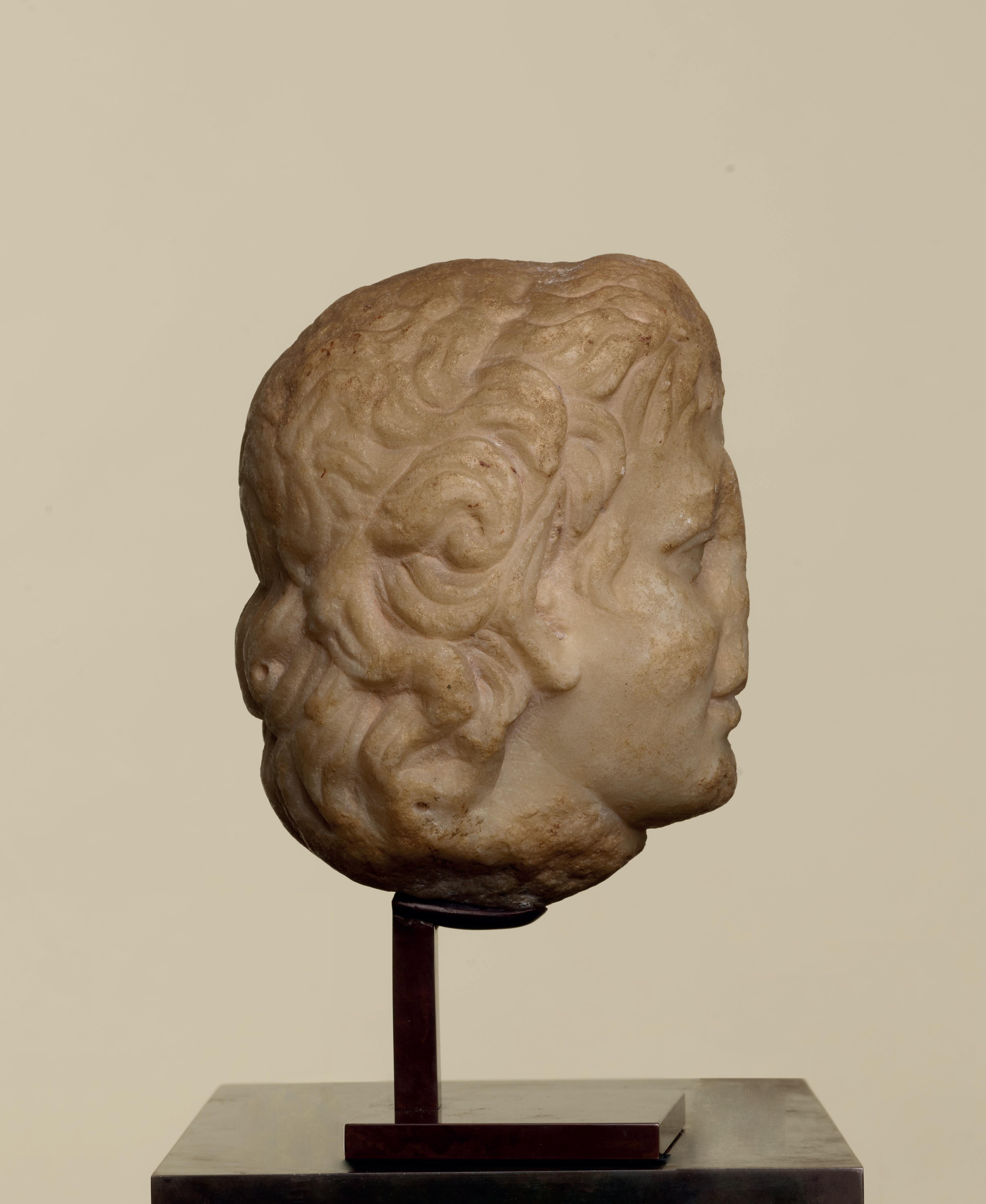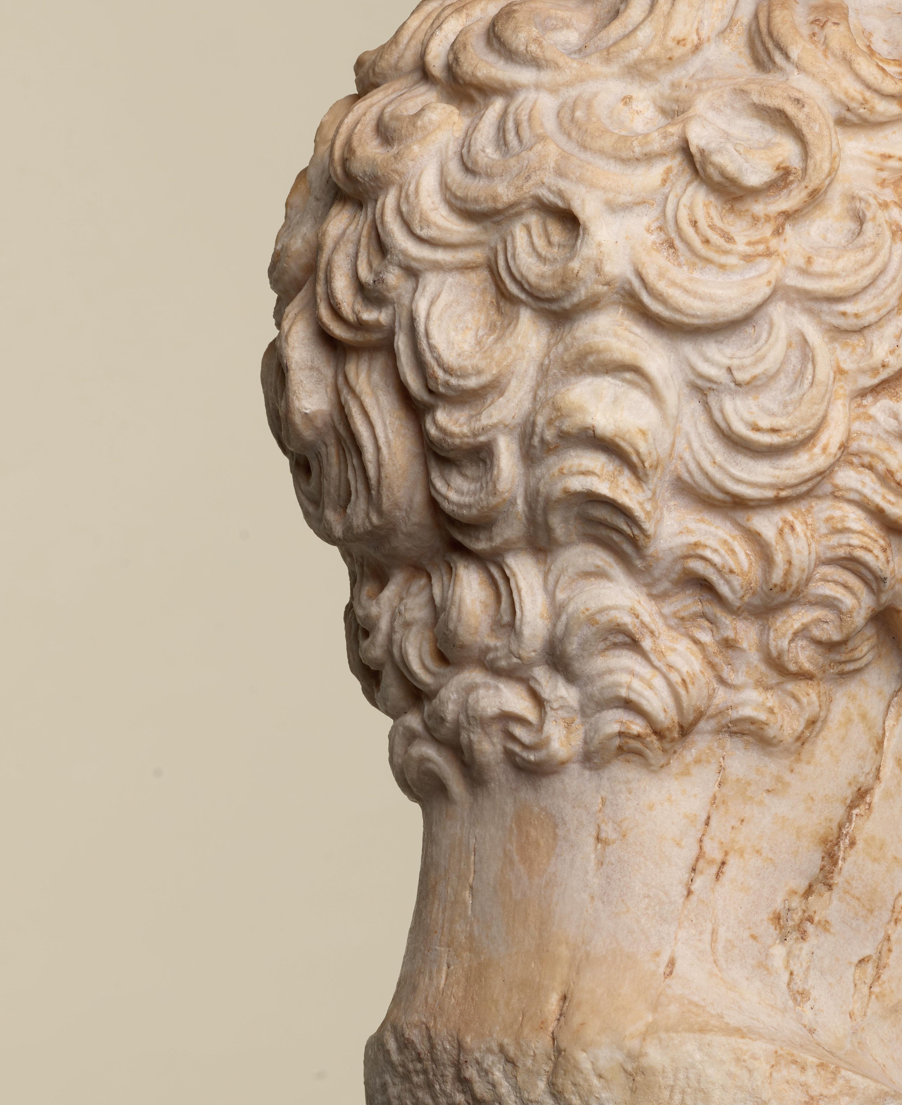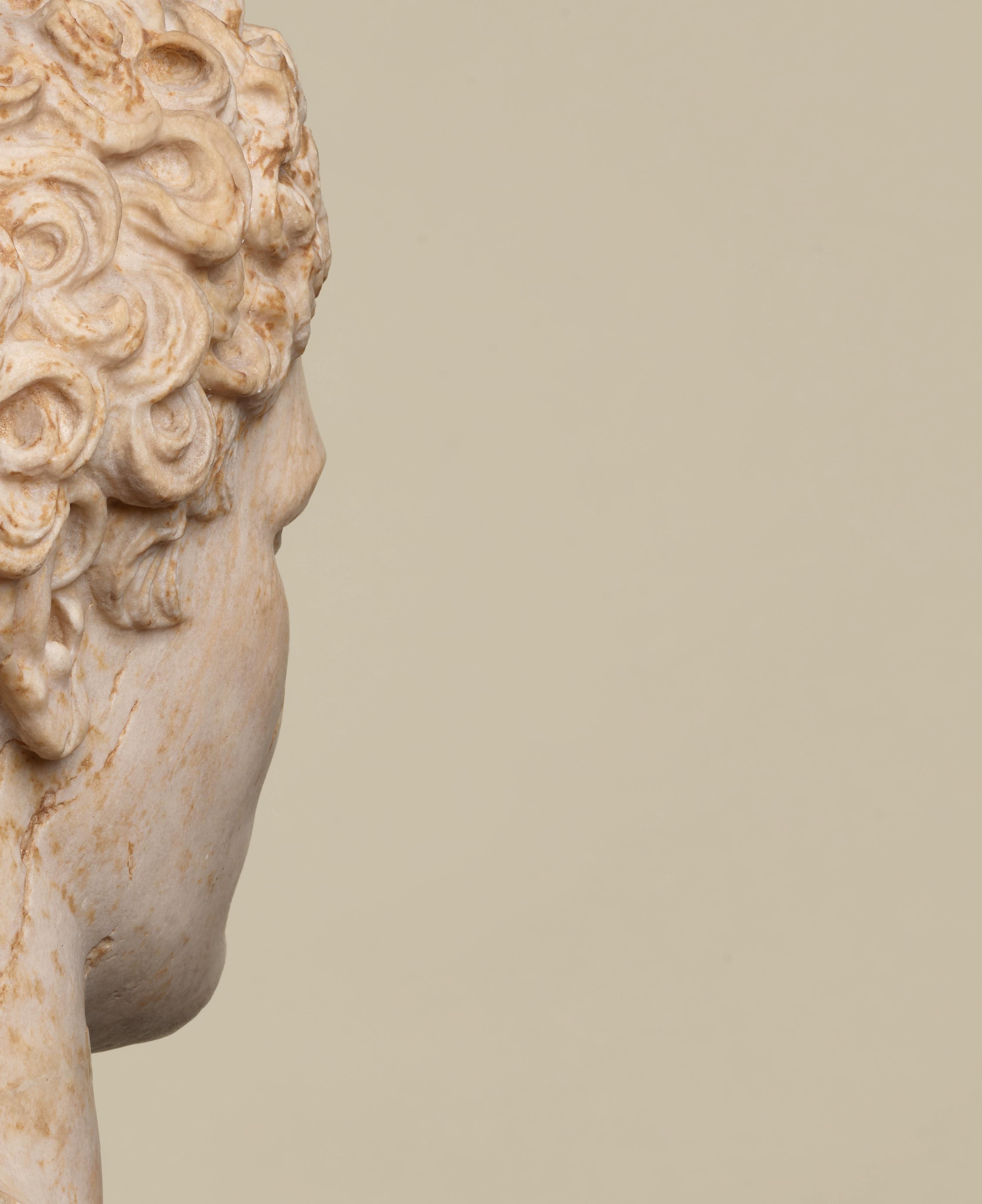 This magnificent, remarkably wrought marble head represents a young satyr. His round, youthful face is framed by thick, curly hair, some unruly locks of which fall across his forehead and spill over his ears. Divided into two parts, the hairstyle of our young satyr is particularly delicately fashioned. The first part, which is more voluminous, is formed by a wreath of curls that frames the top of his head and extends to the nape of his neck, while the second, flatter part comprises the crown of his head, marking a delineation through the band he is wearing, which holds back his locks. At the back, the locks of hair are longer and well preserved. Each