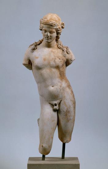 subtle modelling. Her cheek bones stretch slightly towards her ears while the dimples beneath her nose and at the corner of her mouth truly bring her face to life. It thus strikes a perfect balance between idealised beauty and a lifelike rendering of human anatomy. The perfection of her lovely face contrasts strongly with her animated, complex hair. Divided by a centre parting, her hair flows in regular, etched waves from her forehead to her temples, where they partly conceal her carefully sculpted ears. On either side, a small lock escapes, spilling onto her cheeks, a charming detail that makes our Aphrodite appear less severe. The deity is crowned by an elaborate hairstyle. The sophisticated, even luxurious, rosette knot accentuates the sculpture’s verticality and heightens its nobility. Two locks are pulled into it from her forehead, passing over the headband she
