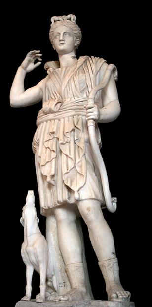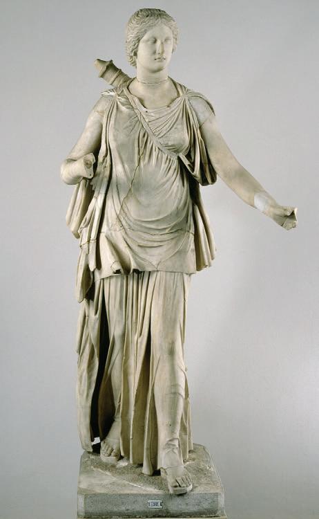 priestess of her sanctuary in Tauris. The tragic myth inspired numerous poets, ancient and modern alike, including Euripides, Racine and Goethe. Artemis was assimilated by the Romans with Diana Trivia, the triple goddess of the hunt, the moon and the underworld, a wild, celestial and chthonic goddess. These unique features made her a choice subject for artists throughout antiquity. She was often represented as a huntress goddess. The most famous example is the Diana of Versailles preserved at the Louvre (ill. 1), who is clothed in the same garments as our figure, as is the Artemis at the Vatican (ill. 2).
