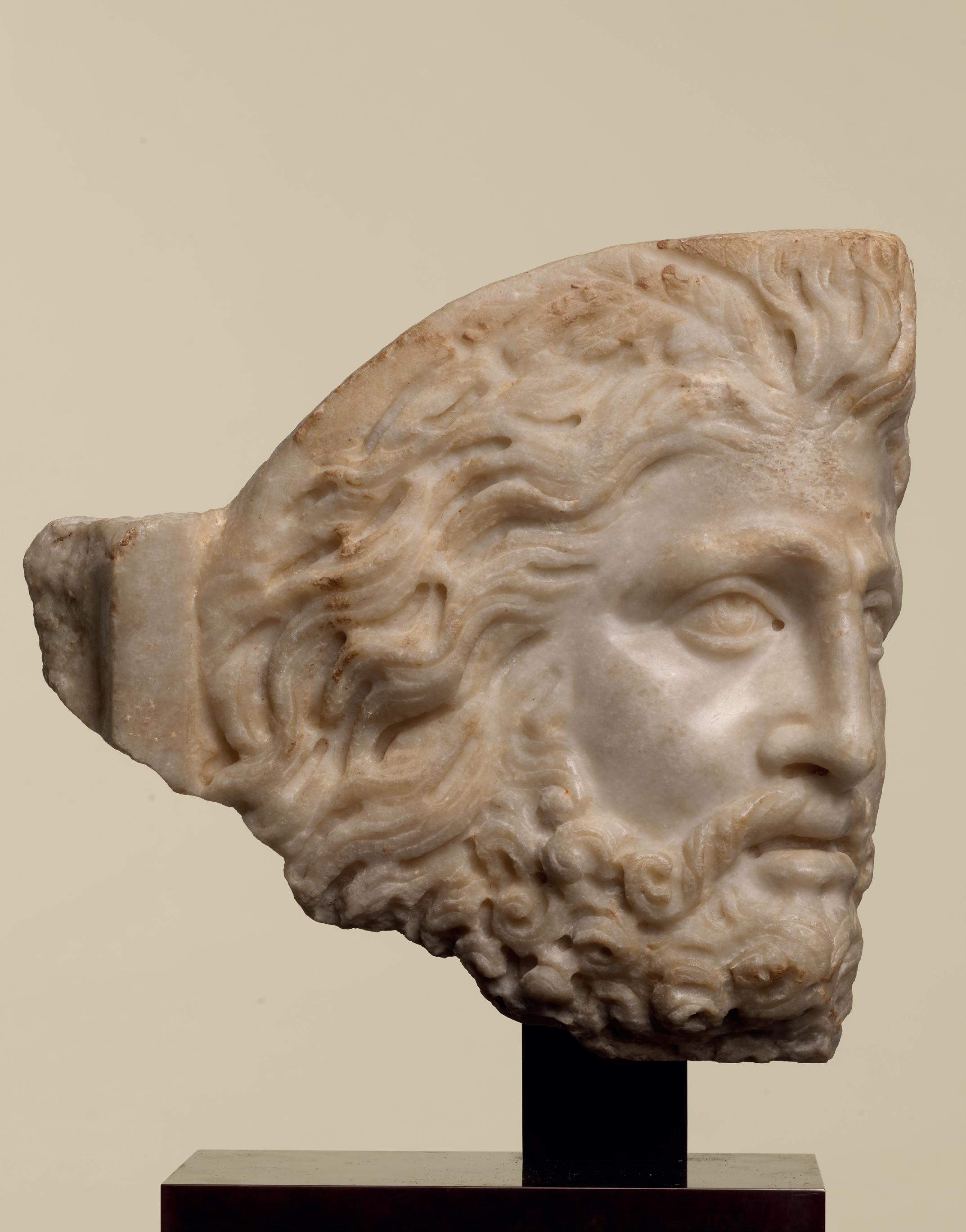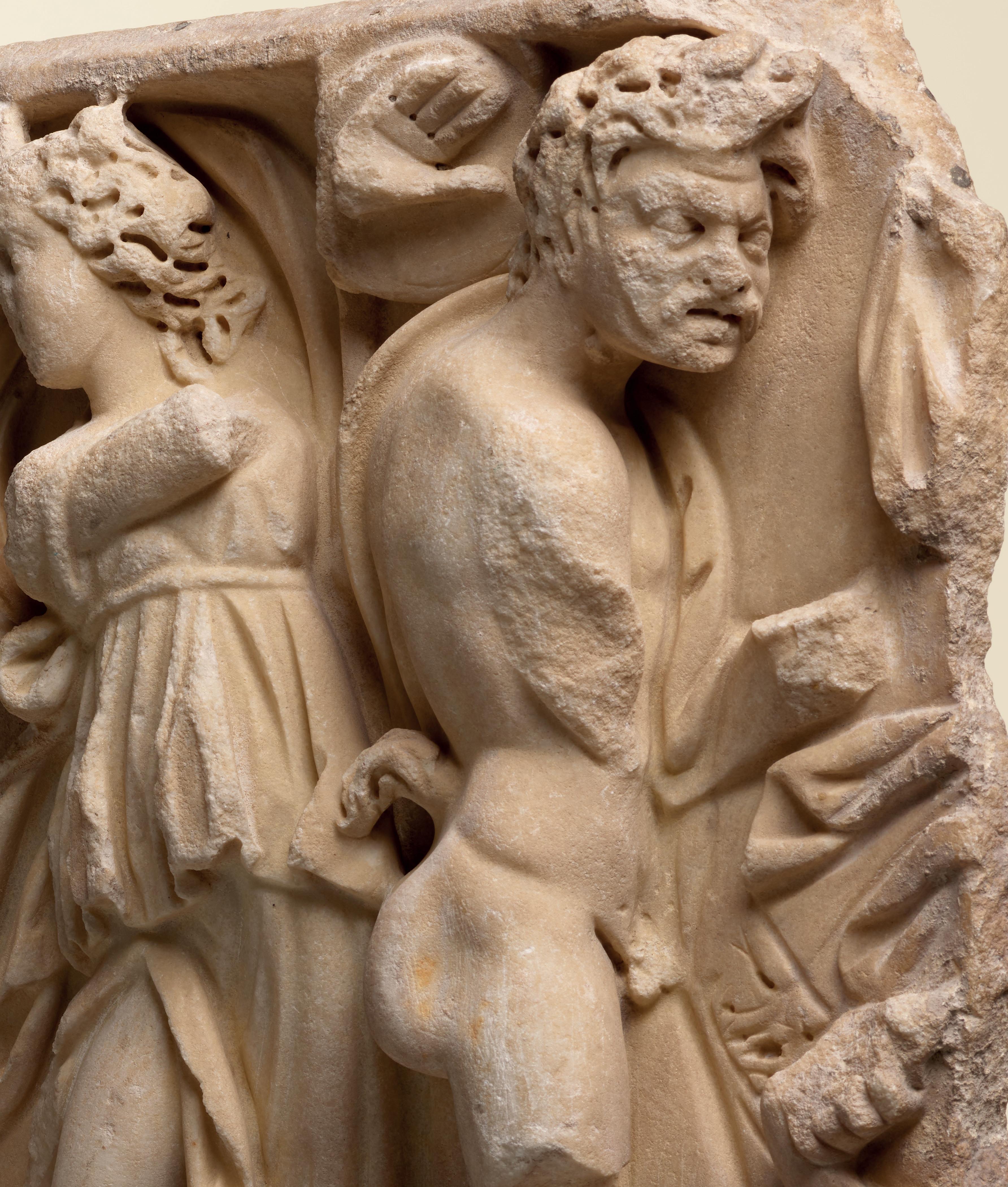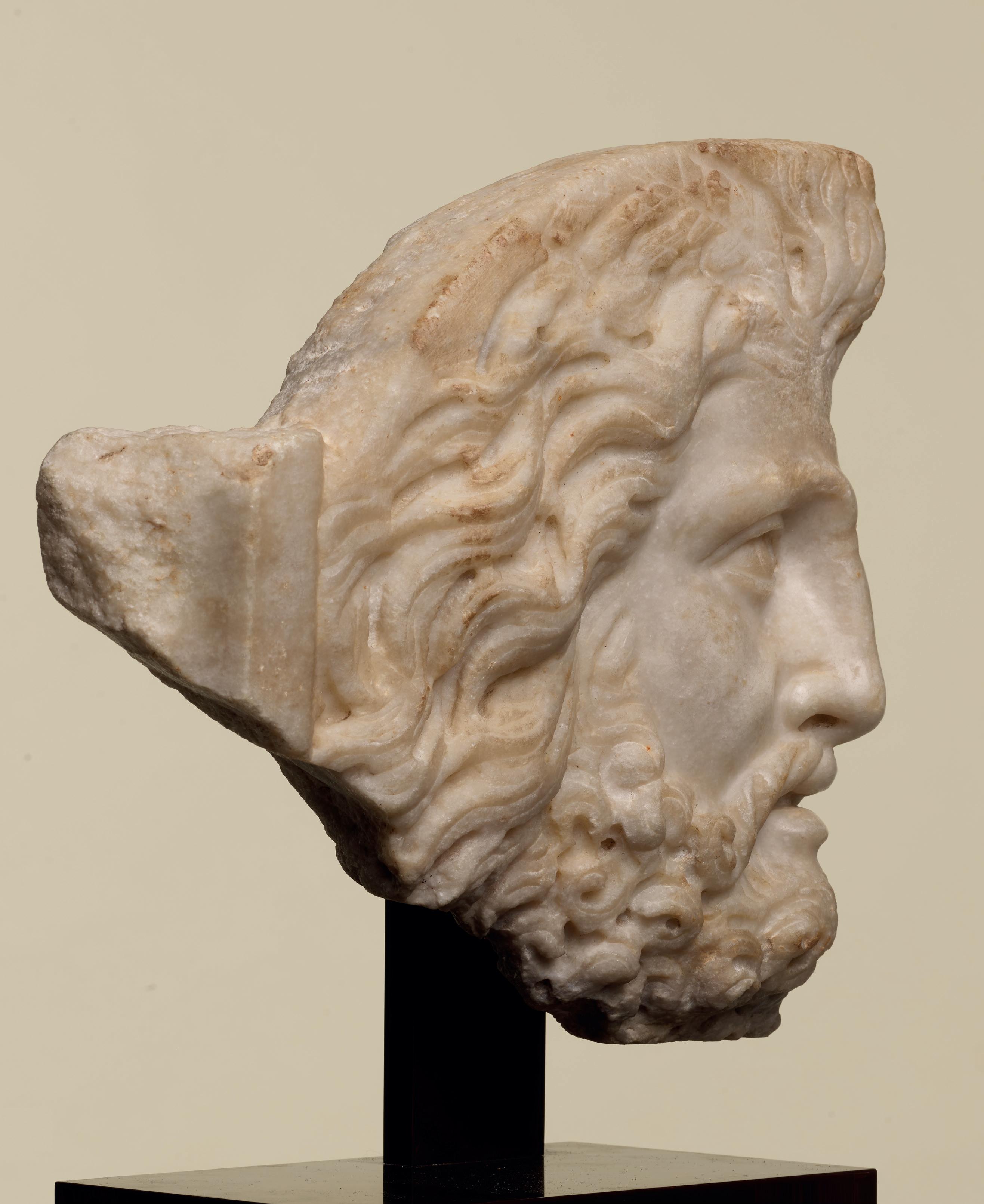 Dated to the 2nd century AD, the sculpture was probably part of a decorative statue meant to adorn a Roman villa, garden or space linked to Dionysian worship or imagery. The heads of satyrs were commonly used as decoration for private residences during the imperial period.
