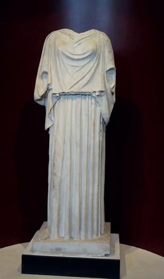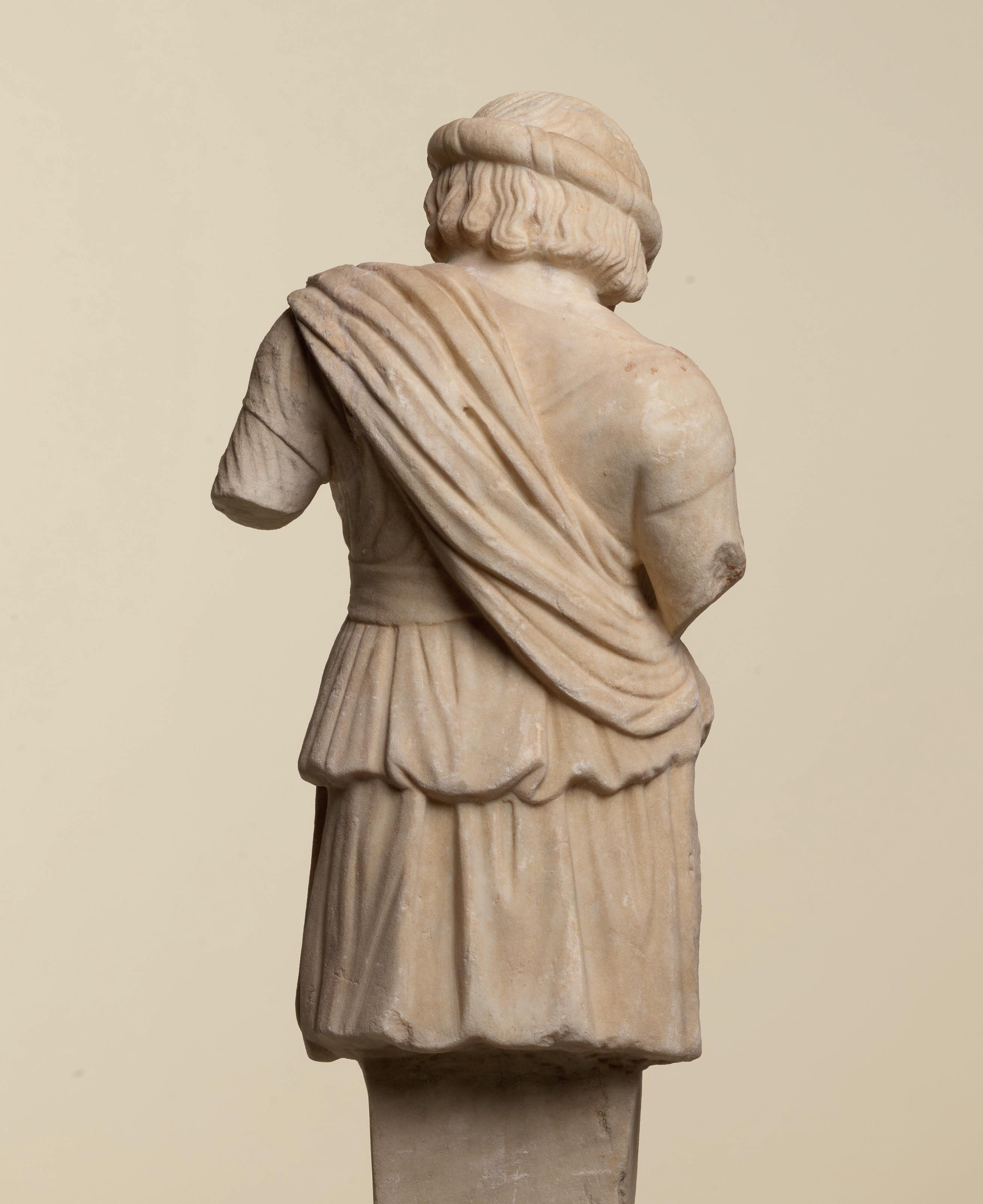 clothing. It is divided into three parts: a belt, knotted at the left side, an undulating, vertical drapery with deep folds and a lighter tunic with delicate folds. By comparing it to other representations, we may suppose that the belt and the drapery actually make up the same himation or woollen mantle. Draped above the kidneys to almost beneath the breasts, it would pass over the shoulder before again being cinched at the waist. It would thus be draped freely over the hips and below the waist. The tunic is a light, short chiton, uncommon in representations of women. In ancient Greece, while women and men did wear the same garment, the chiton, a folded tunic, the length made it possible to distinguish the men’s version from the women’s: the former was short while the latter was long. The choice of such a garment makes it possible to state with certainty that this is the goddess Artemis: the short outfit,